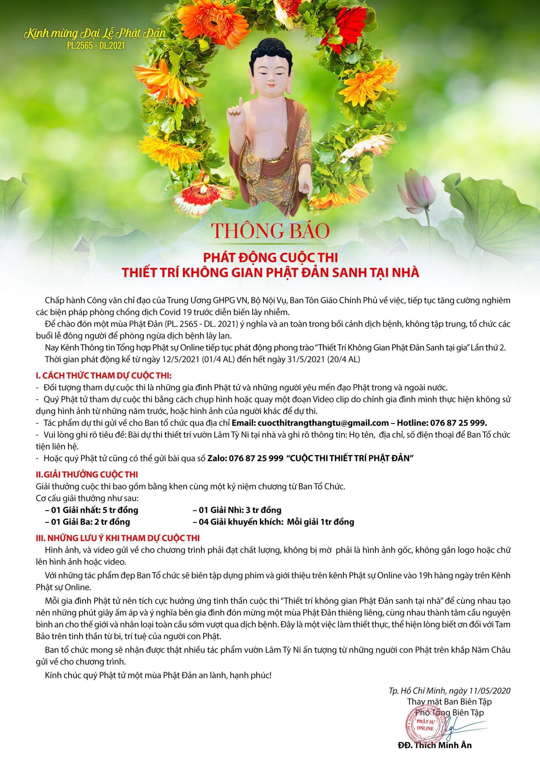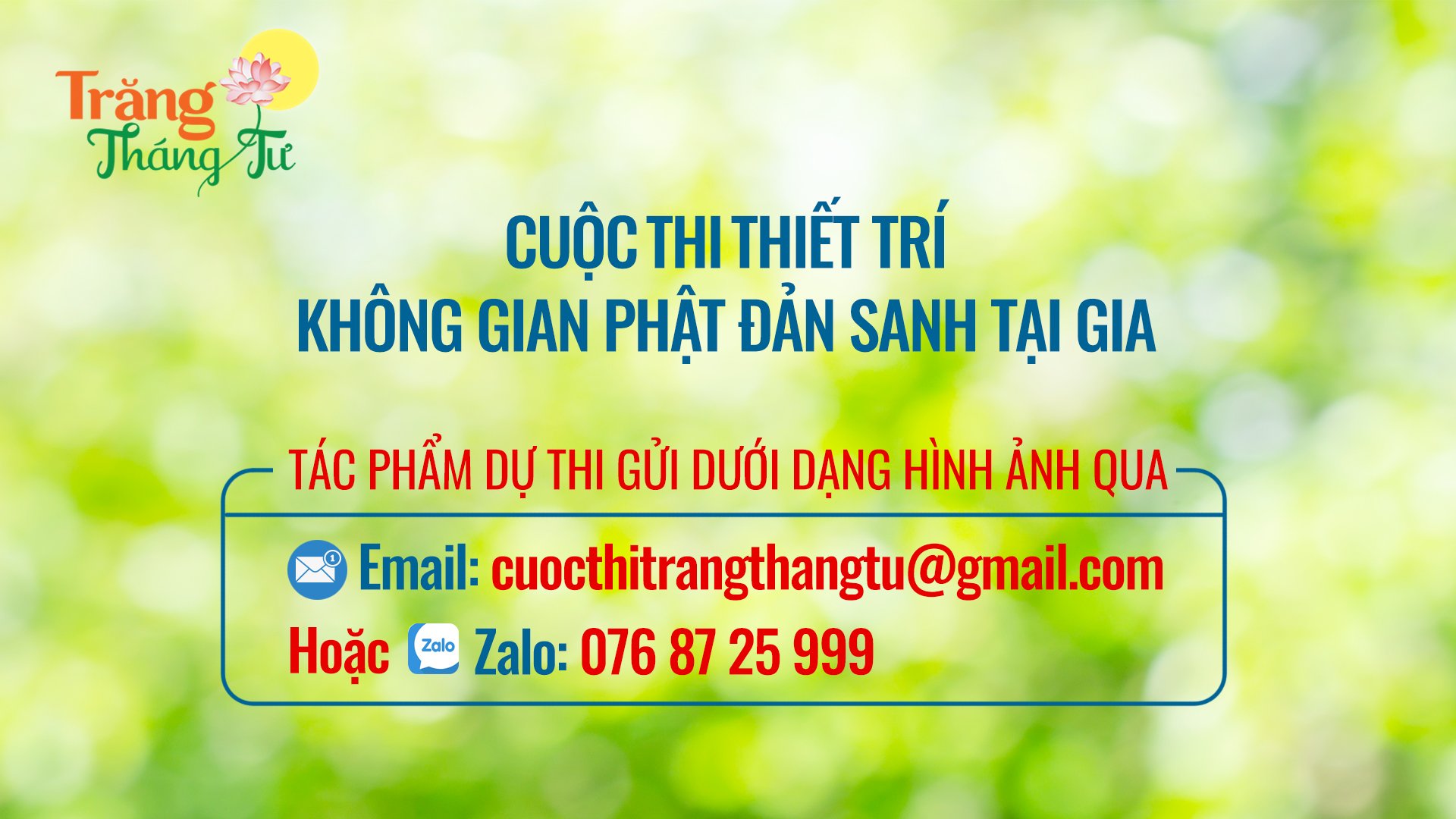 - Hoặc quý Phật tử cũng có thể gửi bài qua số Zalo: 076 87 25 999 “CUỘC THI THIẾT TRÍ PHẬT ĐẢN”