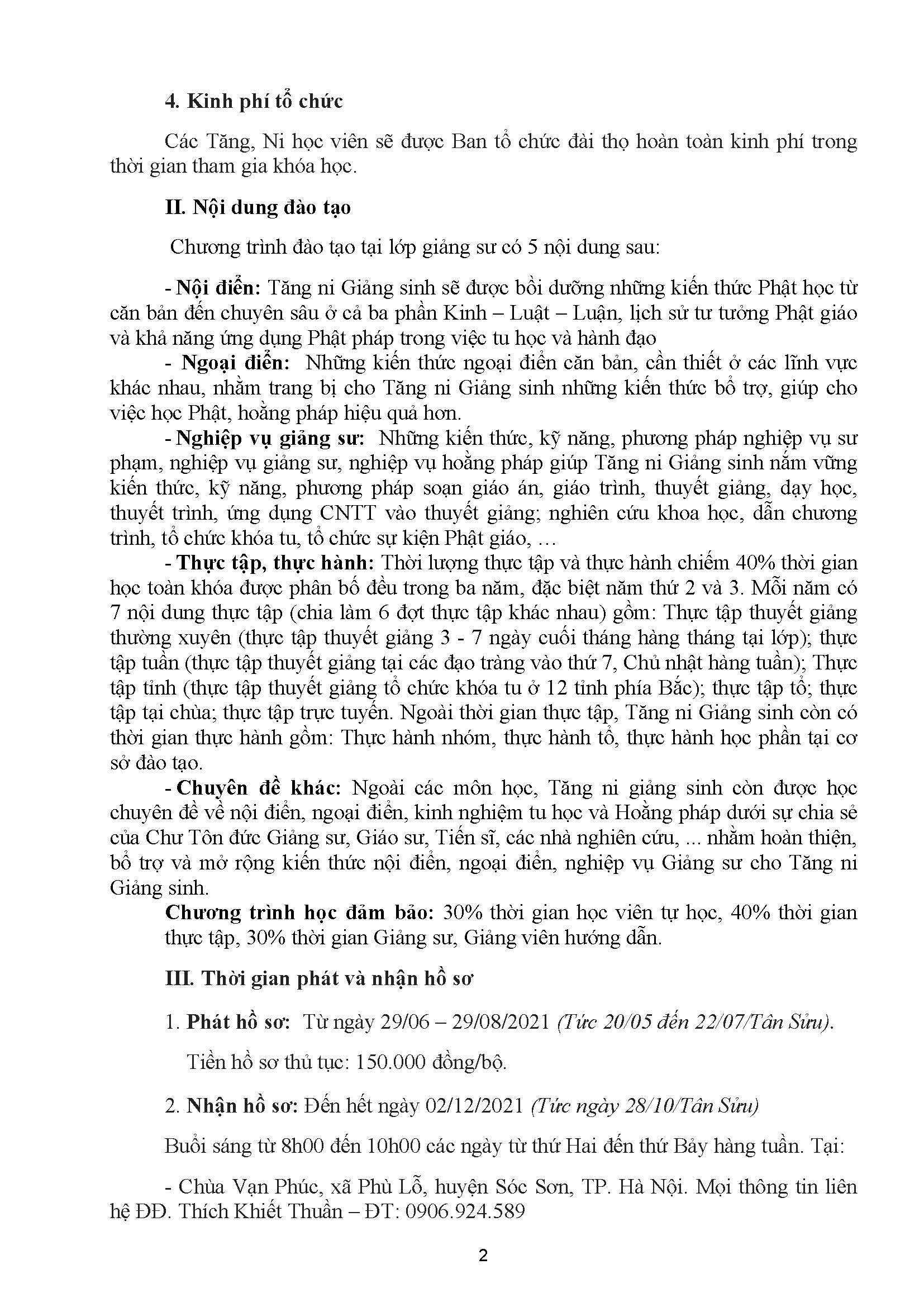 Kính gửi: Ban Thường trực Ban Trị sự, Ban Hoằng pháp các tỉnh thành khu vực phía Bắc Kính thưa quý Ban. Căn cứ Nghị quyết Hội nghị kỳ I khóa VIII (2017 -2022) Trung ương Giáo hội Phật giáo Việt Nam. Căn cứ chương trình hoạt động Phật sự năm 2021 của Ban Hoằng pháp Trung ương Giáo hội Phật giáo Việt Nam. Ban Hoằng pháp Trung ương tổ chức chiêu sinh chương trình đào tạo Giảng sư khóa II (2022 – 2025) cho Tăng ni có nhu cầu theo học chuyên ngành Hoằng pháp với nội dung như sau: I. Đối tượng và thời gian 1. Đối tượng tham gia - Tăng Ni sinh đã tốt nghiệp các trường Phật học (Cao đẳng, Học viện Phật giáo) có sức khỏe, tinh thần ổn định, có tướng hảo, không bị khuyết tật 2. Thời gian học - Khóa học trong thời gian 3 năm từ 2022 đến 2025. Học 5 buổi trong 1 tuần, 1 năm học khoảng 6 tháng ( Từ tháng 2 – 4/ Âm lịch và từ tháng 8 – 11/ Âm lịch). - Tăng ni học viên được nghỉ những ngày: 30, 1, 2, 14, 15, 16 trong tháng theo Âm lịch. 3. Địa điểm học và nội trú - Trụ sở lớp học đặt tại Chùa Vạn Phúc, xã Phù Lỗ, huyện Sóc Sơn, thành phố Hà Nội. - Đối với Tăng ni ngoại tỉnh: Chư Tăng nội trú tại chùa Vạn Phúc; chư Ni nội trú tại chùa Thiên Tuế, xã Phù Lỗ, huyện Sóc Sơn, thành phố Hà Nội. 4. Kinh phí tổ chức Các Tăng, Ni học viên sẽ được Ban tổ chức đài thọ hoàn toàn kinh phí trong thời gian tham gia khóa học. II. Nội dung đào tạo Chương trình đào tạo tại lớp giảng sư có 5 nội dung sau: - Nội điển: Tăng ni Giảng sinh sẽ được bồi dưỡng những kiến thức Phật học từ căn bản đến chuyên sâu ở cả ba phần Kinh – Luật – Luận, lịch sử tư tưởng Phật giáo và khả năng ứng dụng Phật pháp trong việc tu học và hành đạo - Ngoại điển: Những kiến thức ngoại điển căn bản, cần thiết ở các lĩnh vực khác nhau, nhằm trang bị cho Tăng ni Giảng sinh những kiến thức bổ trợ, giúp cho việc học Phật, hoằng pháp hiệu quả hơn. - Nghiệp vụ giảng sư: Những kiến thức, kỹ năng, phương pháp nghiệp vụ sư phạm, nghiệp vụ giảng sư, nghiệp vụ hoằng pháp giúp Tăng ni Giảng sinh nắm vững kiến thức, kỹ năng, phương pháp soạn giáo án, giáo trình, thuyết giảng, dạy học, thuyết trình, ứng dụng CNTT vào thuyết giảng; nghiên cứu khoa học, dẫn chương trình, tổ chức khóa tu, tổ chức sự kiện Phật giáo, … - Thực tập, thực hành: Thời lượng thực tập và thực hành chiếm 40% thời gian học toàn khóa được phân bố đều trong ba năm, đặc biệt năm thứ 2 và 3. Mỗi năm có 7 nội dung thực tập (chia làm 6 đợt thực tập khác nhau) gồm: Thực tập thuyết giảng thường xuyên (thực tập thuyết giảng 3 - 7 ngày cuối tháng hàng tháng tại lớp); thực tập tuần (thực tập thuyết giảng tại các đạo tràng vào thứ 7, Chủ nhật hàng tuần); Thực tập tỉnh (thực tập thuyết giảng tổ chức khóa tu ở 12 tỉnh phía Bắc); thực tập tổ; thực tập tại chùa; thực tập trực tuyến. Ngoài thời gian thực tập, Tăng ni Giảng sinh còn có thời gian thực hành gồm: Thực hành nhóm, thực hành tổ, thực hành học phần tại cơ sở đào tạo. - Chuyên đề khác: Ngoài các môn học, Tăng ni giảng sinh còn được học chuyên đề về nội điển, ngoại điển, kinh nghiệm tu học và Hoằng pháp dưới sự chia sẻ của Chư Tôn đức Giảng sư, Giáo sư, Tiến sĩ, các nhà nghiên cứu, ... nhằm hoàn thiện, bổ trợ và mở rộng kiến thức nội điển, ngoại điển, nghiệp vụ Giảng sư cho Tăng ni Giảng sinh. Chương trình học đảm bảo: 30% thời gian học viên tự học, 40% thời gian thực tập, 30% thời gian Giảng sư, Giảng viên hướng dẫn. III. Thời gian phát và nhận hồ sơ 1. Phát hồ sơ: Từ ngày 29/06 – 29/08/2021 (Tức 20/05 đến 22/07/Tân Sửu). Tiền hồ sơ thủ tục: 150.000 đồng/bộ. 2. Nhận hồ sơ: Đến hết ngày 02/12/2021 (Tức ngày 28/10/Tân Sửu) Buổi sáng từ 8h00 đến 10h00 các ngày từ thứ Hai đến thứ Bảy hàng tuần. Tại: - Chùa Vạn Phúc, xã Phù Lỗ, huyện Sóc Sơn, TP. Hà Nội. Mọi thông tin liên hệ ĐĐ. Thích Khiết Thuần – ĐT: 0906.924.589 - Chùa Bà Đá, số 3, phố Nhà Thờ, quận Hoàn Kiếm, thành phố Hà Nội. Mọi thông tin liên hệ NS. Thích Đàm Hinh – ĐT: 0984.242.071 3. Hình thức tuyển sinh - Hình thức: Xét tuyển. - Mỗi học viên dự xét tuyển phải viết và nộp một bài luận bằng bản in kèm theo hồ sơ. - Ngoài bản in bài luận nộp kèm hồ sơ, học viên còn phải gửi 01 file word của bài luận vào địa chỉ Email: vpdaotaogiangsu@gmail.com + Số trang của bài luận: Từ 20 trang trở lại + Quy cách: khổ A4, cỡ chữ 14, font Times New Roman, lề trái 3.0, lề phải 2.0, lề trên 2.0, lề dưới 2.5; giãn dòng 1.3; 01 trang bìa (Có mẫu đính kèm hồ sơ); Bài luận có đóng bìa giấy màu vàng. + Câu hỏi bài luận:- Câu 1: Quý thầy hãy trình bày hiểu biết của bản thân về giáo lý duyên khởi.