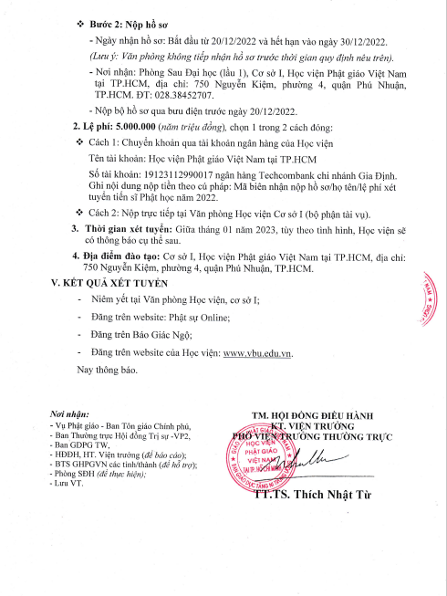 - Giấy giới thiệu của Ban Trị sự Phật giáo tỉnh/thành nơi thí sinh đang cư trú (đối với Tăng Ni). Riêng Tăng Ni ở TP.HCM phải thêm giấy giới thiệu của Ban Trị sự quận/huyện và Tp. Thủ Đức.