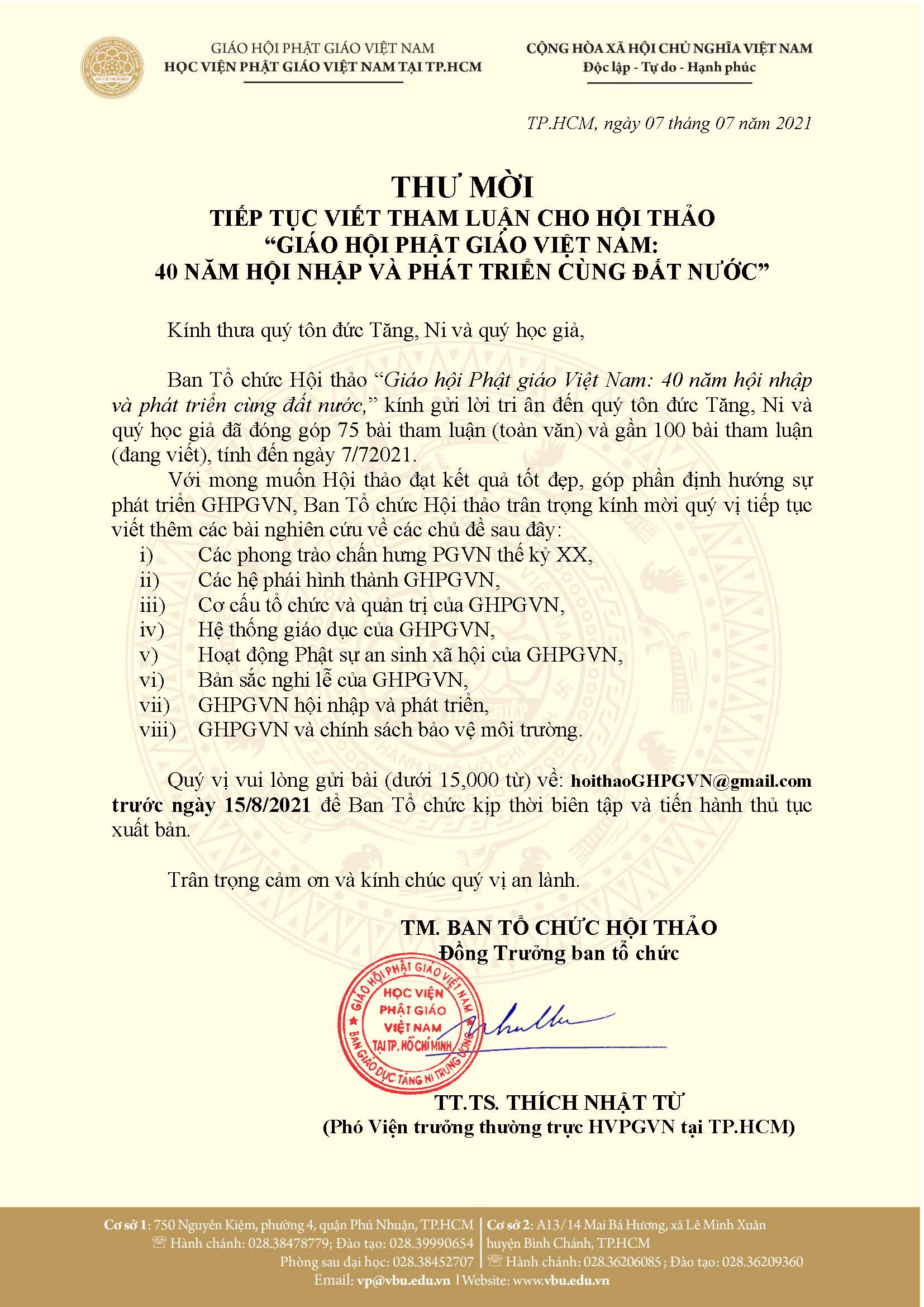 THƯ MỜI TIẾP TỤC VIẾT THAM LUẬN CHO HỘI THẢO “GIÁO HỘI PHẬT GIÁO VIỆT NAM: 40 NĂM HỘI NHẬP VÀ PHÁT TRIỂN CÙNG ĐẤT NƯỚC”