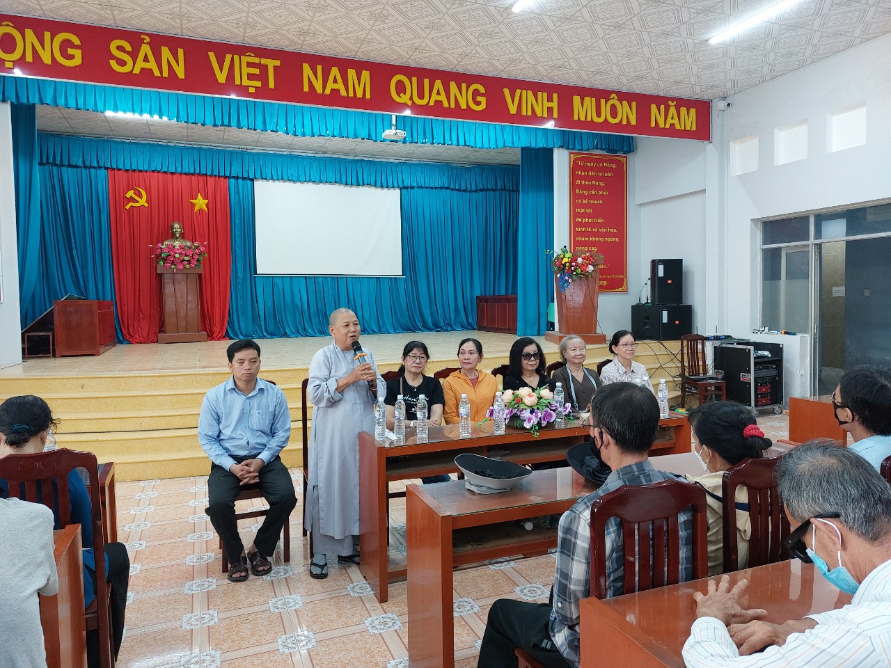PSO - Hội đủ duyên lành, ngày 19/2/2023 (nhằm ngày 29 tháng Giêng năm Quý Mão), Nhóm thiện nguyện Phật tử TP.HCM do Phật tử Bác sỹ Nguyễn Thành Tâm đã có chuyến thiện nguyện đến tỉnh Tiền Giang chia sẻ yêu thương, trao quà cho bà con khiếm thị khó khăn tại đây. Đoàn đã trao tặng 345 phần quà tại 2 điểm như sau: - 170 phần trao cho bà con khiếm thị thuộc hội người mù TP.Mỹ Tho tại Nhà Văn (phường 7, TP. Mỹ Tho). - Số còn lại trao cho người khiếm thị của hội người mù huyện Châu Thành tại chùa Linh Phong (thị trấn Tân Hiệp, huyện Châu Thành, tỉnh Tiền Giang). Mỗi phần quà trị giá 520 nghìn đồng, gồm 10kg gạo, 1 thùng mì, một số nhu yếu phẩm,.v.v... và 220 nghìn đồng tiền mặt. Tổng tịnh tài, tịnh vật của chuyến trao tặng quà là 180 triệu đồng. Tại các điểm trao quà, đại diện chính quyền đã gửi lời tri ân và lời chúc sức khoẻ đến quý Ni sư, nhóm thiện nguyện Phật tử TP.HCM đã hỗ trợ và giúp đỡ người dân nơi đây. Chuyến đi đã thành tựu viên mãn, thay mặt Đoàn thiện nguyện Bác sỹ Nguyễn Thành Tâm xin trân trọng tri ân đến Ni sư trụ trì chùa Linh Phong, Ni sư Như Hảo cùng mạnh thường quân đã tạo điều kiện cho đoàn đến và chia sẽ yêu thương cho bà con. Phần quà tuy nhỏ, nhưng đây là tất cả tấm lòng của đoàn dành trao cho bà con nhằm động viên, khích lệ mọi người có thêm nghị lực vươn lên trong cuộc sống. Bên cạnh đó, Ni sư Như Hảo (trụ trì chùa Hội Phước, An Giang) chứng minh cho buổi trao tặng quà và có những lời pháp nhũ động viên, khuyến tấn bà con đến nhận quà. Cầu nguyện chư Phật gia hộ cho bà con khiếm thị, quý Phật tử, mạnh thường quân và tất cả mọi người, mọi nhà đều được mạnh khỏe, an lạc, hạnh phúc. Sau đây là một số hình ảnh được ghi nhận: * Nhà Văn Hoá: * Chùa Linh Phong