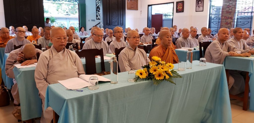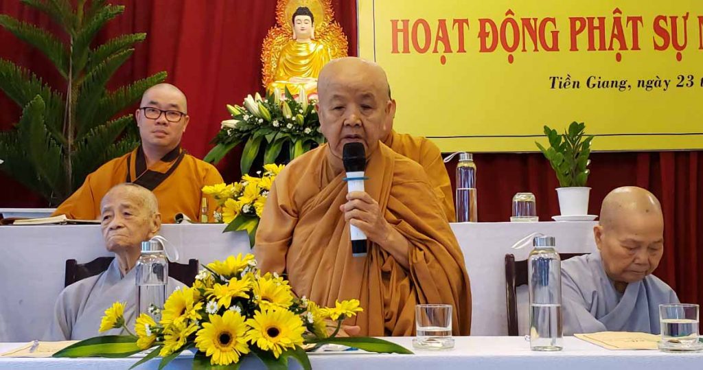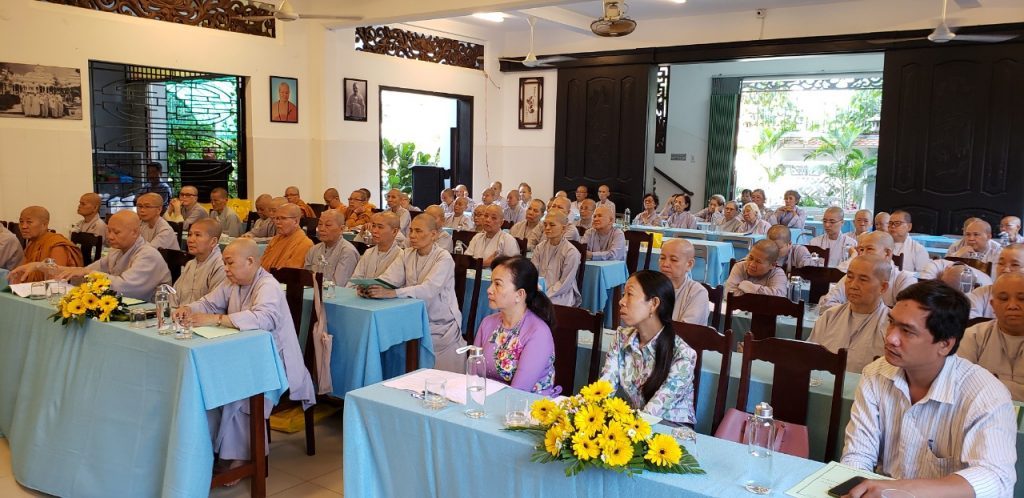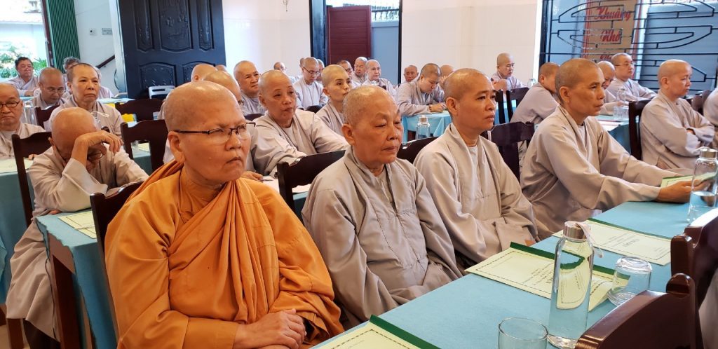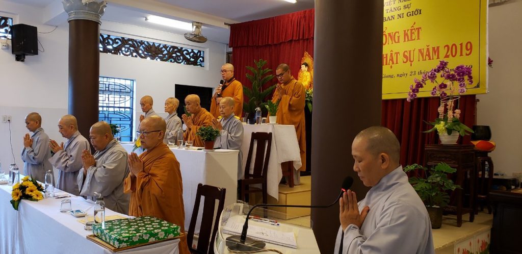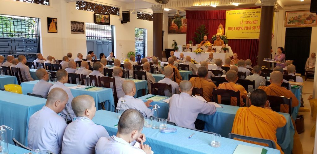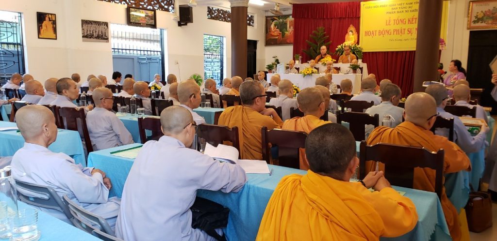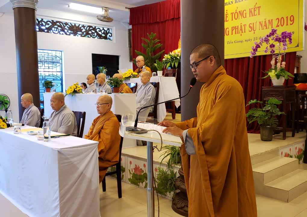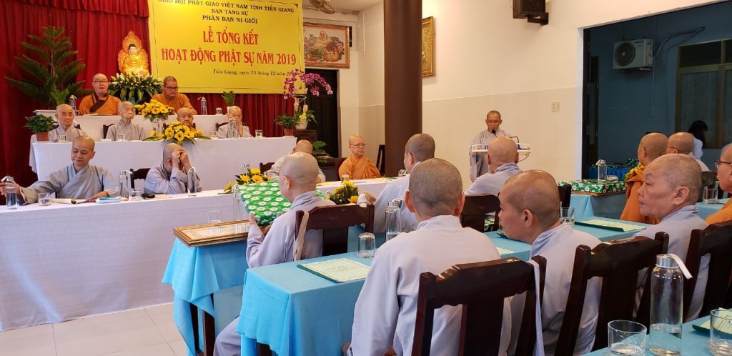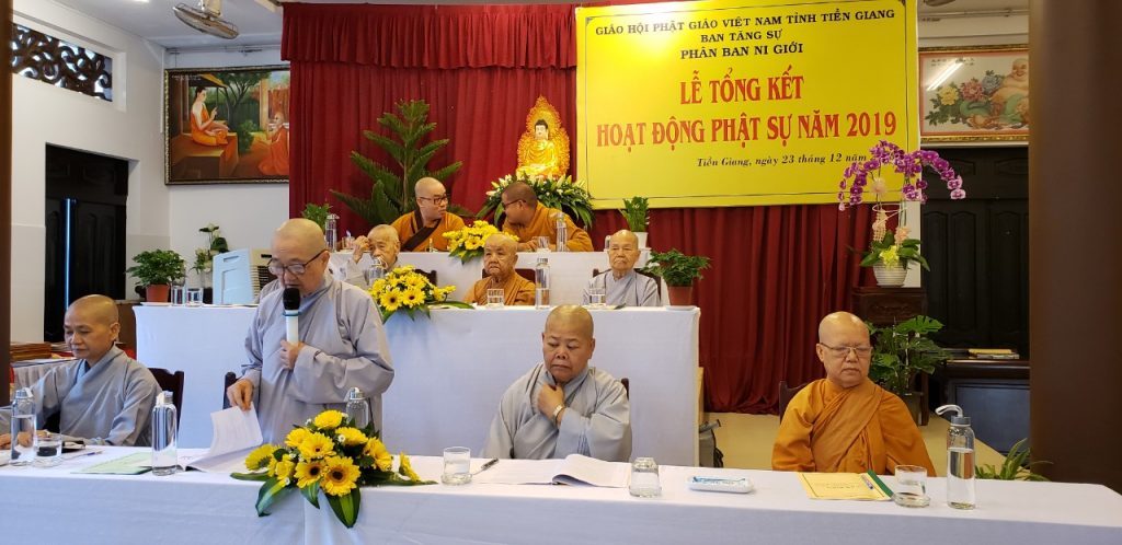 Tiếp theo, thay mặt Ban Thư ký NS.Thích Nữ Tịnh Thủy – Chánh Thư ký PBNG tỉnh báo cáo tổng kết hoạt động Phật sự năm 2019 và trình Phương hướng hoạt động năm 2020. Nhìn lại những thành quả hoạt động của năm qua, PBNG tỉnh Tiền Giang cùng với chư Ni trong tỉnh đã rất cố gắng để hoàn thành những hoạt động Phật sự mà Giáo hội đã giao phó. Từng bước củng cố Ni đoàn và hướng dẫn chư Ni tu học đúng theo Chánh pháp, sinh hoạt phù hợp với Hiến chương Giáo hội và Nội quy Ban Tăng sự, đồng thời tích cực tham gia các công tác từ thiện xã hội, các phong trào của Đảng và Nhà nước phát động, nhằm góp phần trang nghiêm đạo pháp, xây dựng cuộc đời.