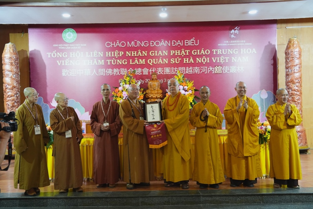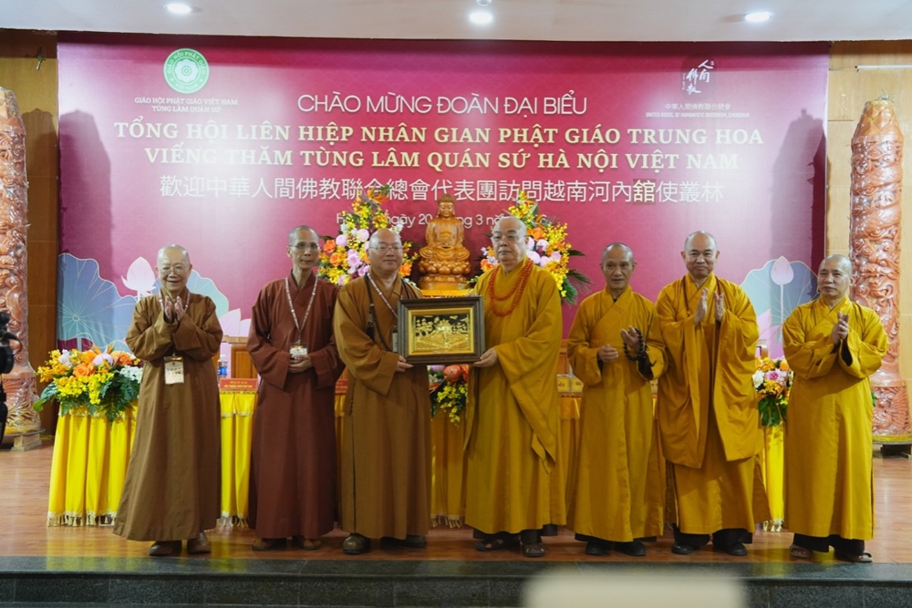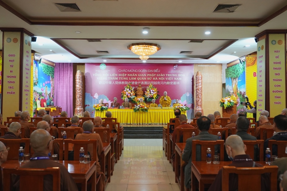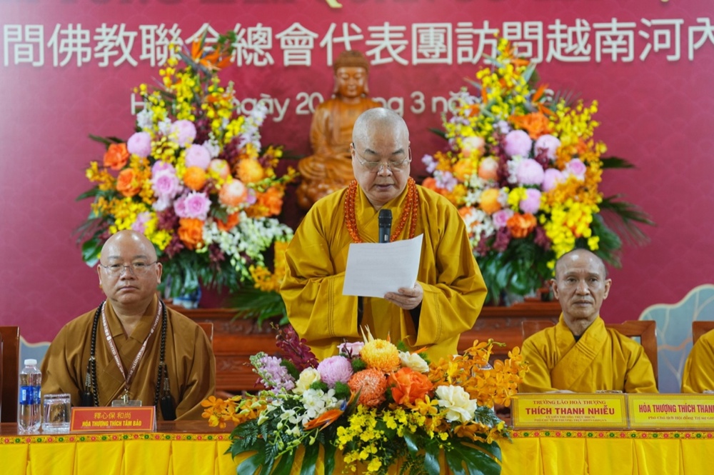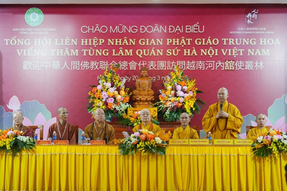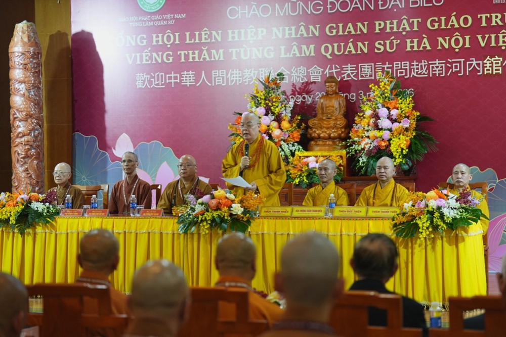 Trong không khí thân mật, Trưởng lão Hòa thượng Thích Thanh Nhiễu – UVTT HĐCM, Phó Chủ tịch thường trực HĐTS, Viện chủ Tùng Lâm Quán Sứ bày tỏ niềm hoan hỉ khi được chào đón chư tôn đức, quý giáo sư, cư sĩ thuộc Tổng hội liên hiệp Nhân gian Phật giáo Trung Hoa; và gửi lời kính chúc pháp thể khinh an, thân tâm thường lạc, vạn sự cát tường như ý. Nhân dịp này, Trưởng lão Hòa thượng đã chia sẻ những nét khái quát, cô đọng về Phật giáo Việt Nam – một truyền thống tâm linh có lịch sử hơn hai thiên niên kỷ. Trải suốt chiều dài ấy, Phật giáo luôn gắn bó mật thiết với vận mệnh dân tộc, đồng hành cùng đất nước trong tinh thần “hộ quốc an dân”, góp phần vun bồi đời sống đạo đức và văn hóa xã hội.