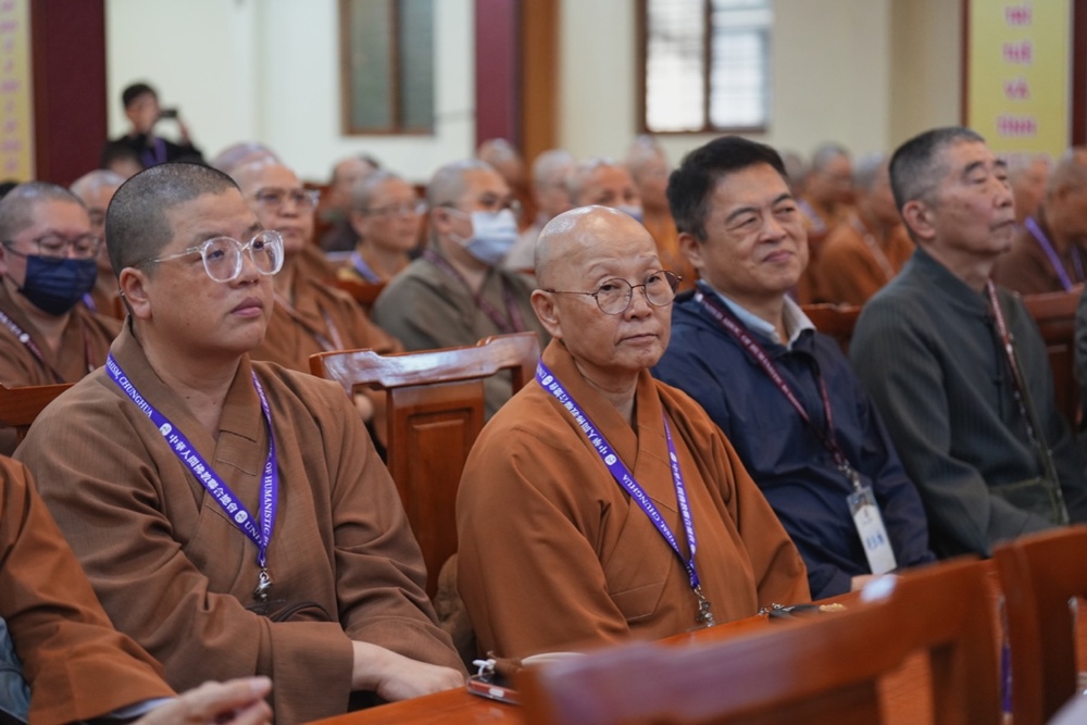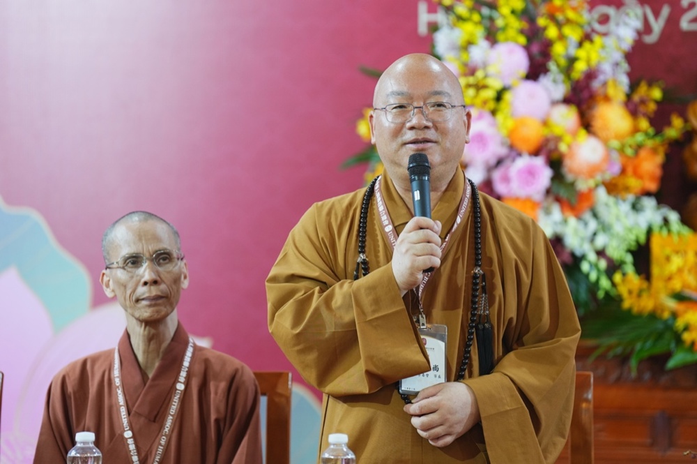 Đại diện đoàn đại biểu Tổng hội liên hiệp Nhân gian Phật giáo Trung Hoa, Hòa thượng Thích Tâm Bảo – Tông trưởng Phật Quang Sơn đã bày tỏ niềm tri ân trước sự đón tiếp trọng thị và nồng hậu từ chư Tôn đức Trung ương Giáo hội Phật giáo Việt Nam, đồng thời kính chúc quý Ngài pháp thể khinh an, mọi việc cát tường như ý. Hòa thượng đặc biệt ấn tượng khi được lắng nghe phần giới thiệu khái quát về Giáo hội Phật giáo Việt Nam – một tổ chức có cơ cấu chặt chẽ, vận hành hài hòa và hiệu quả. Trong chuyến thăm và giao lưu lần này, Hòa thượng nghĩ rằng có nhiều phương tiện giao lưu học hỏi như giáo dục, văn hoá, tín ngưỡng, tổ chức,…; nhờ đó mà đôi bên hiểu nhau, học tập lẫn nhau. Trong đoàn cũng có những người lần đầu đến thăm GHPGVN nhưng tất cả cùng tín ngưỡng, cùng là đệ tử của Đức Phật Thích Ca Mâu Ni nên có thể cảm nhận được sự thân tình, gắn kết. Hòa thượng kì vọng trong tương lai, Tổng hội liên hiệp Nhân gian Phật giáo Trung Hoa và GHPGVN sẽ có nhiều sự hợp tác, trao đổi để lan toả tinh thần Phật pháp rộng hơn nữa.