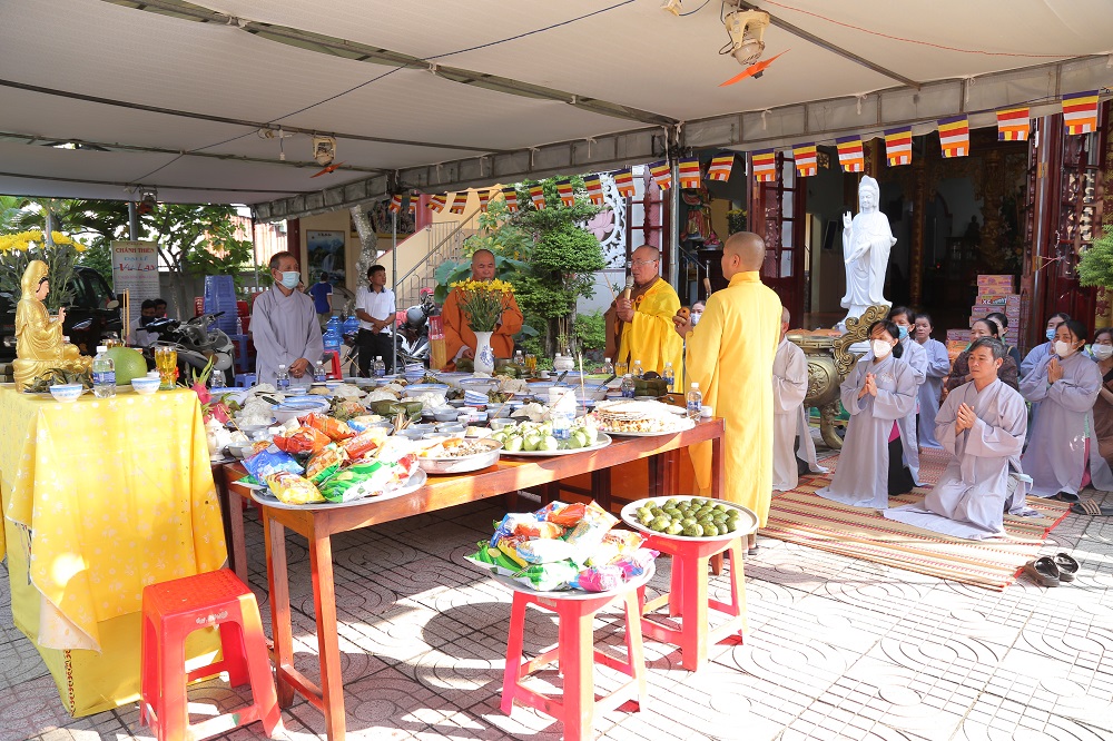 Sau lễ cài hoa, chư Tôn đức đã quang lâm Trai đường tác lễ cúng dường Trai tăng, cầu nguyện âm siêu dương thới.