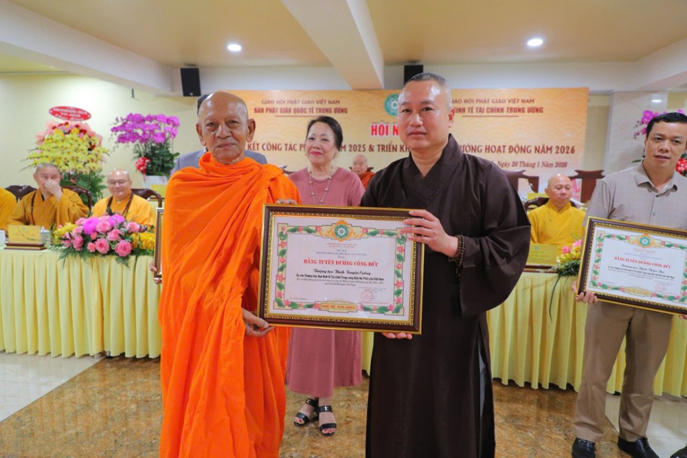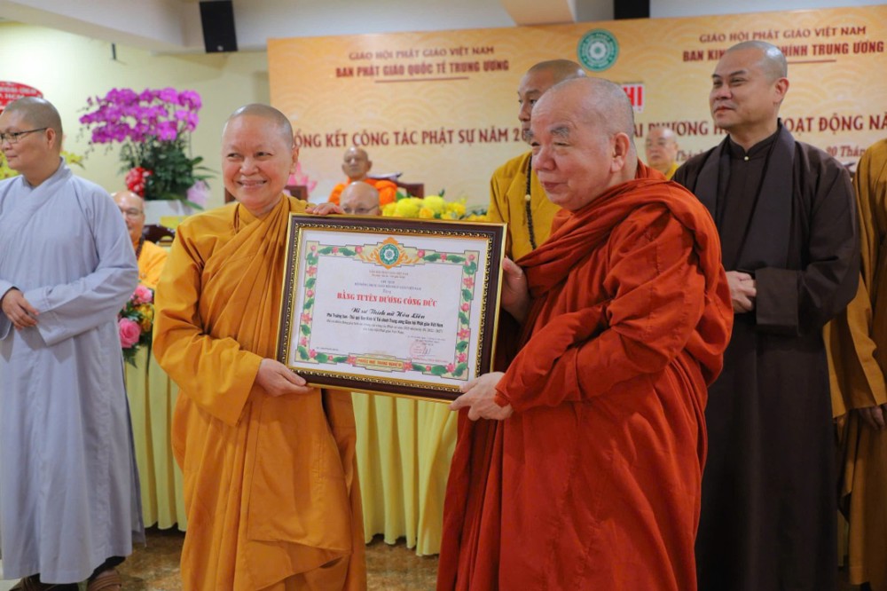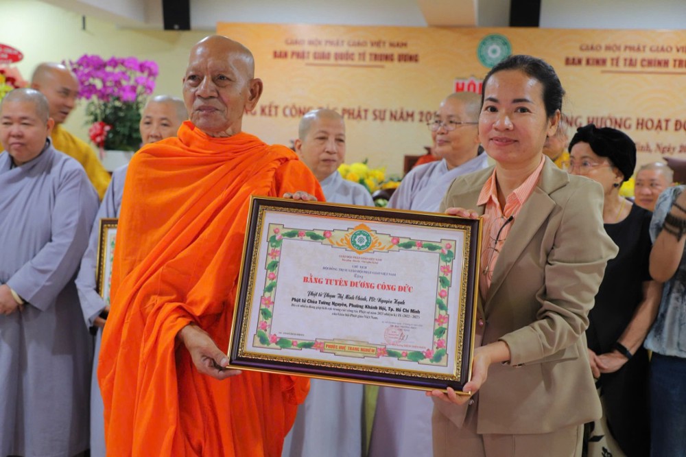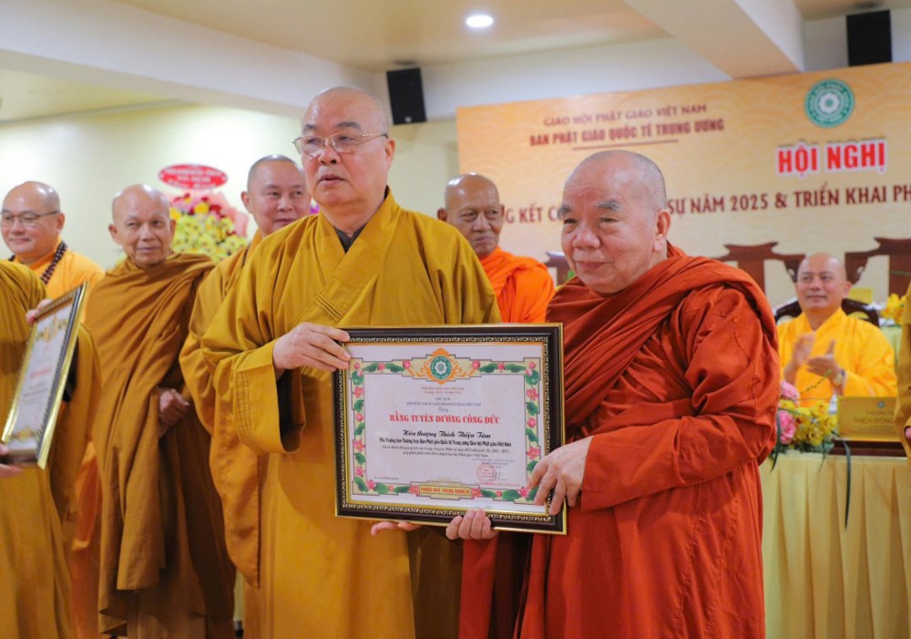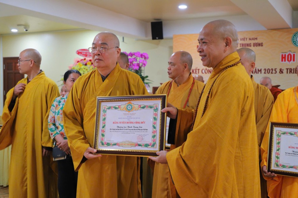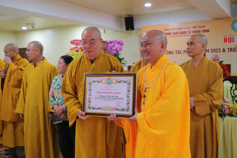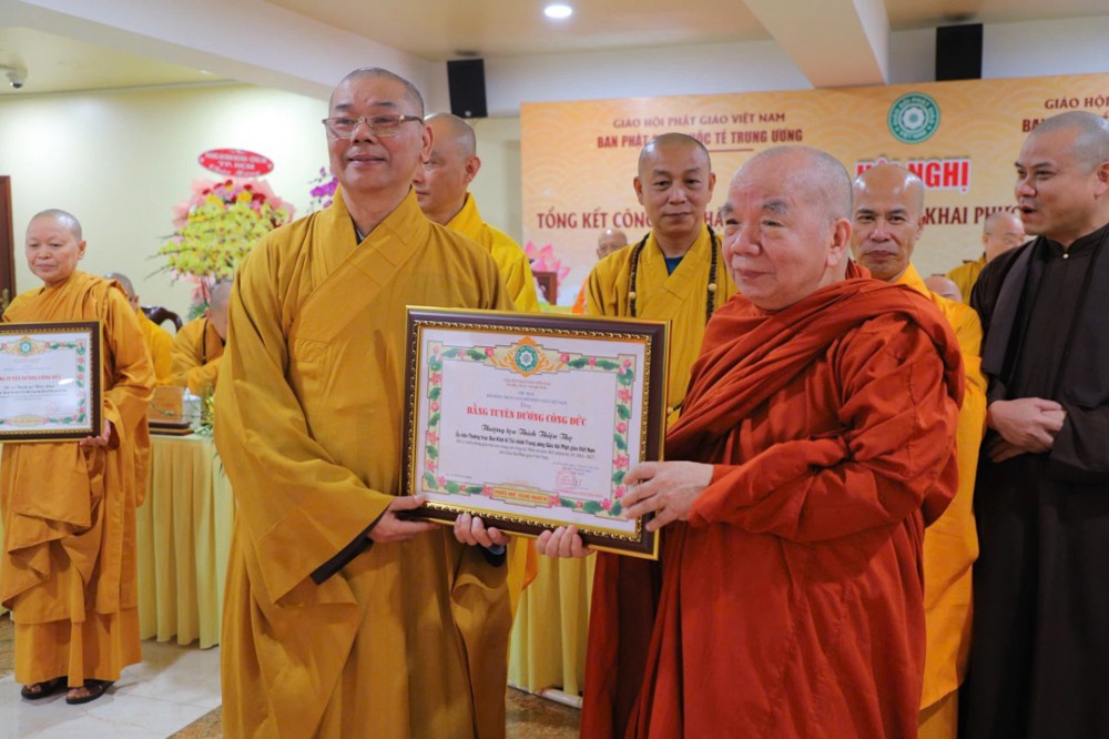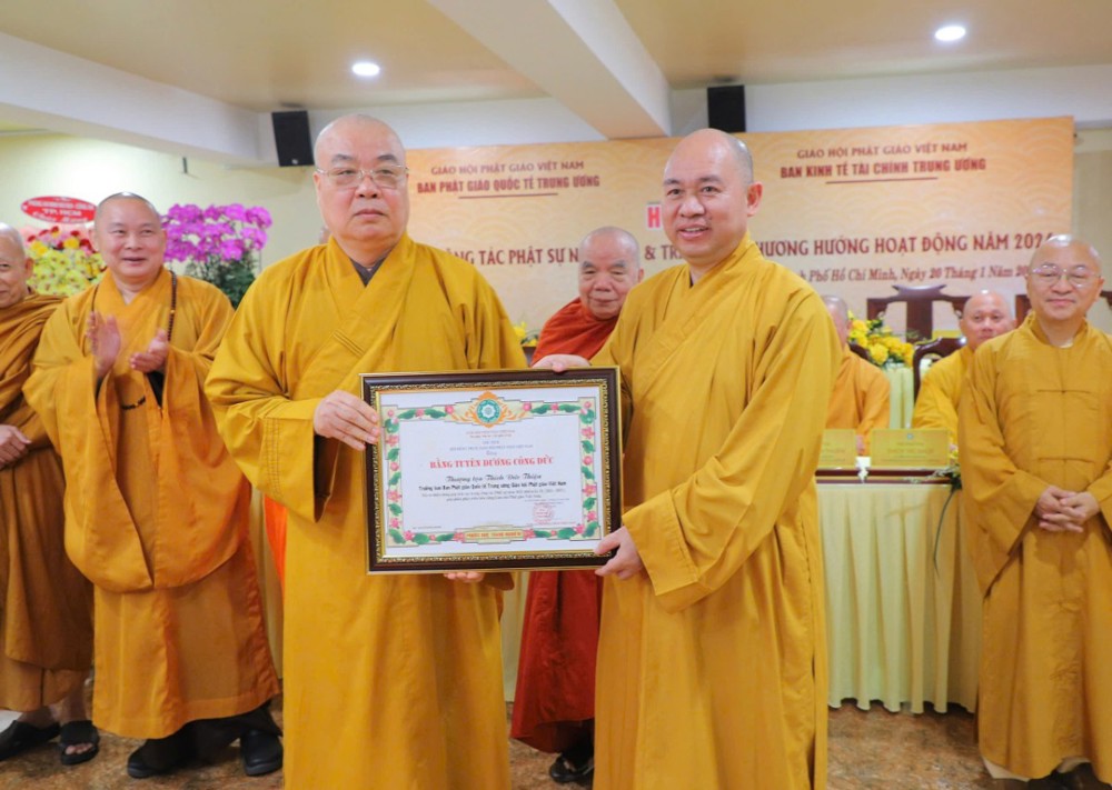 Thượng tọa Thích Thanh Tuấn – Phó Tổng Thư ký Hội đồng Trị sự, Chánh Văn phòng I Trung ương Giáo hội đã công bố Quyết định và điều hành phần trao Bằng tuyên dương công đức của Trung ương Giáo hội. Nhằm ghi nhận và tán thán những nỗ lực, thành tựu đạt được trong năm qua, Hội đồng Trị sự Trung ương GHPGVN đã trao Bằng Tuyên dương Công đức cho tập thể Ban Phật giáo Quốc tế Trung ương và Ban Kinh tế - Tài chính Trung ương, đồng thời vinh danh các cá nhân tiêu biểu có nhiều đóng góp xuất sắc cho sự phát triển bền vững của Giáo hội.