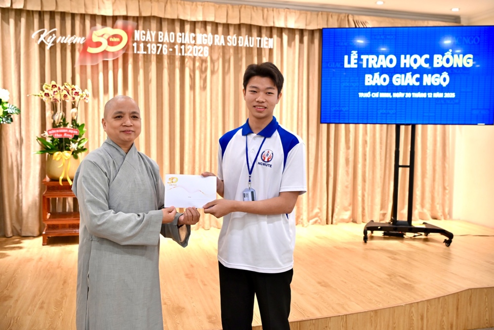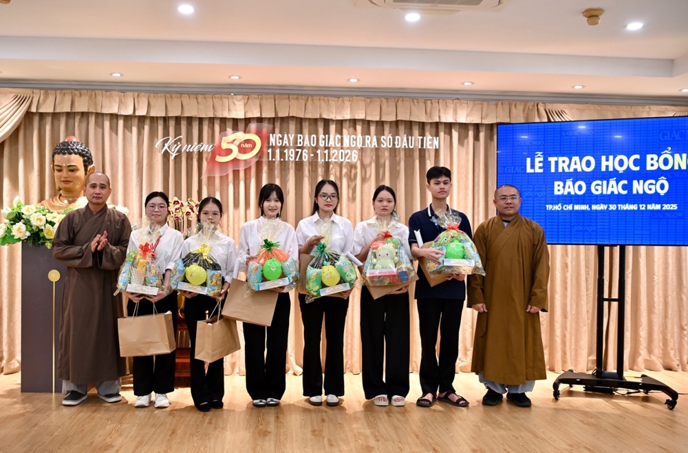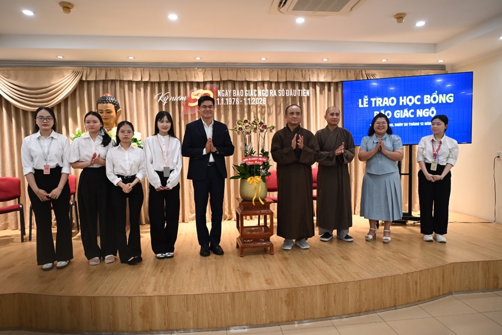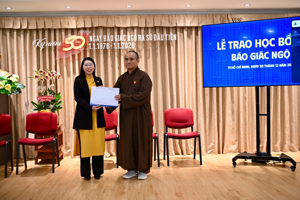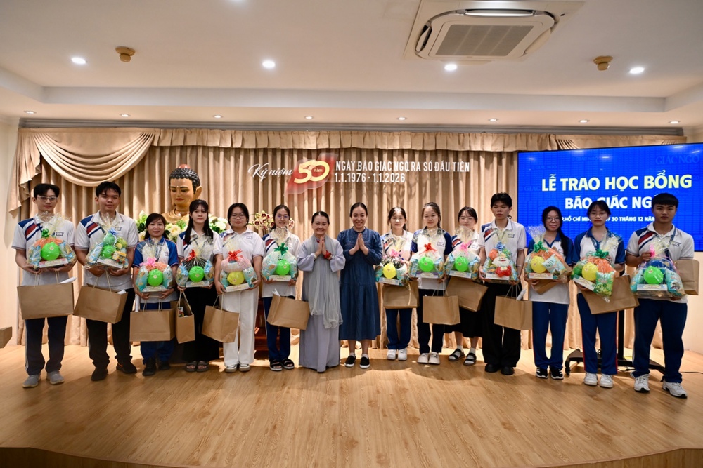 PSO - Nhân kỷ niệm 50 năm ngày Báo Giác Ngộ ra số đầu tiên, sáng ngày 30/12/2025, tại trụ sở Tòa soạn Báo Giác Ngộ (số 85 Nguyễn Đình Chiểu, phường Xuân Hòa, TP.HCM), Ban Biên tập tổ chức lễ trao tặng học bổng đến 50 em sinh viên có thành tích học tập và rèn luyện tốt đến từ 4 trường Đại học tại TP.HCM.