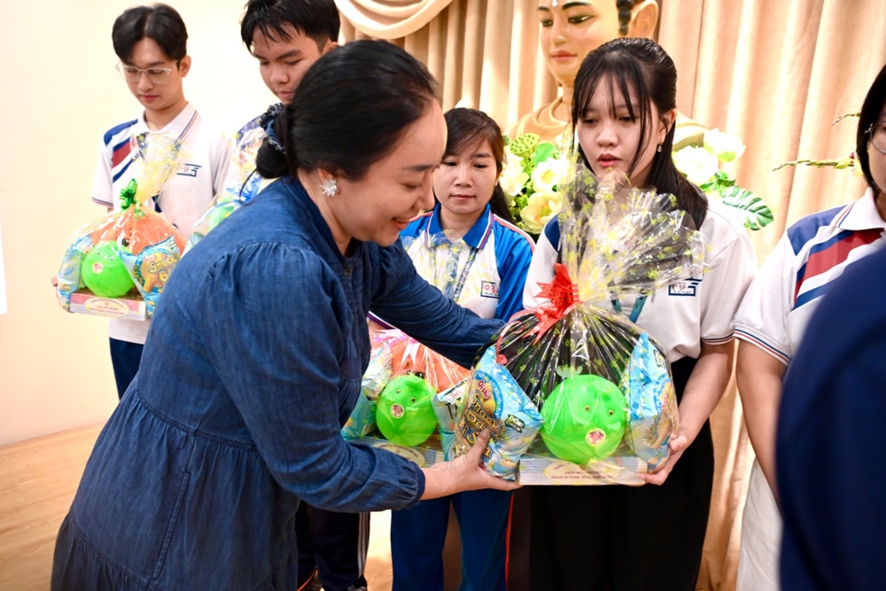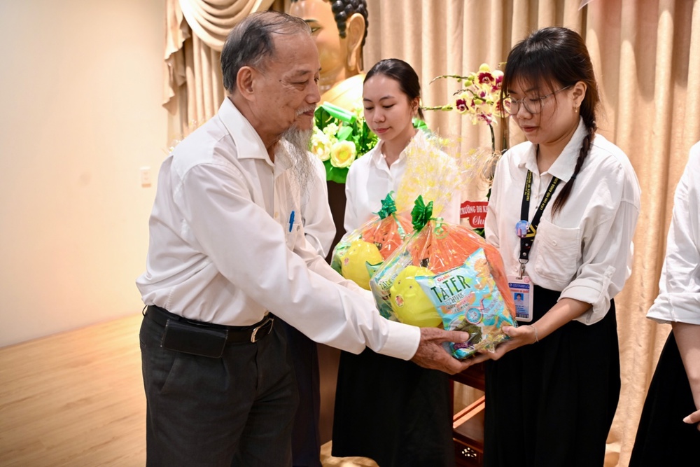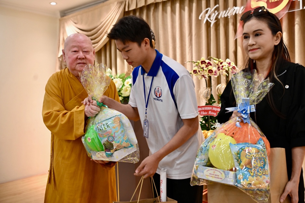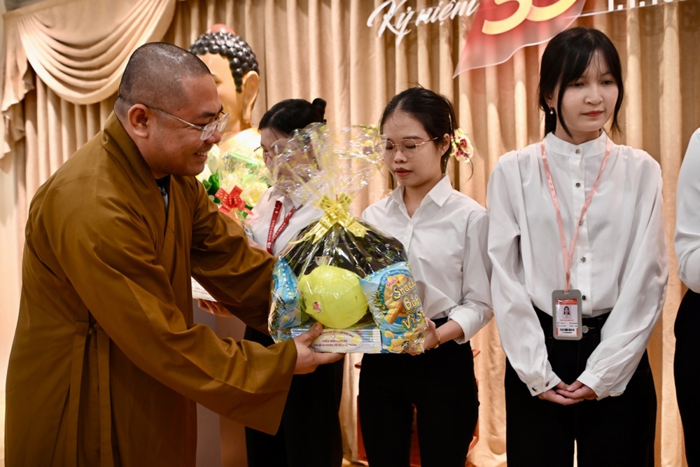 Nhân dịp này, Thượng tọa cũng tri ân chính quyền địa phương, quý thầy cô và các nhà hảo tâm đã luôn đồng hành, làm cầu nối vững chắc cho các hoạt động thiện nguyện. Trước thềm năm mới, Thượng tọa chúc toàn thể hội trường một năm mới an lạc, hạnh phúc; mong các em sinh viên học tập tốt để trở thành những công dân hữu ích cho xã hội.