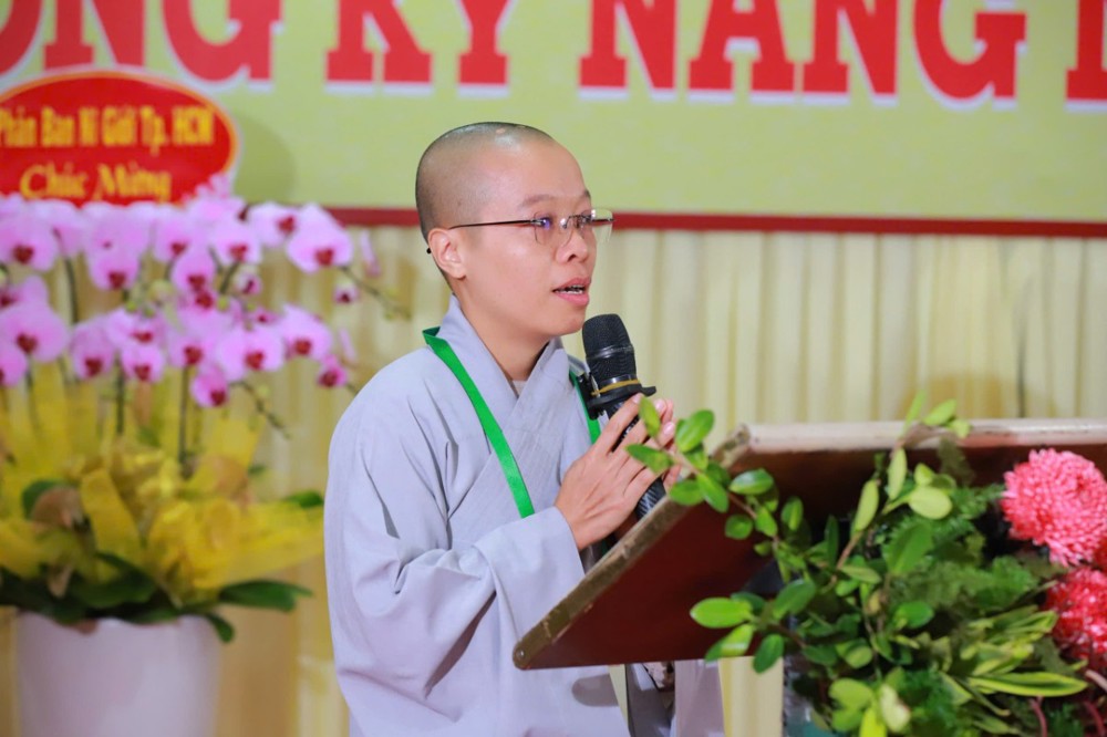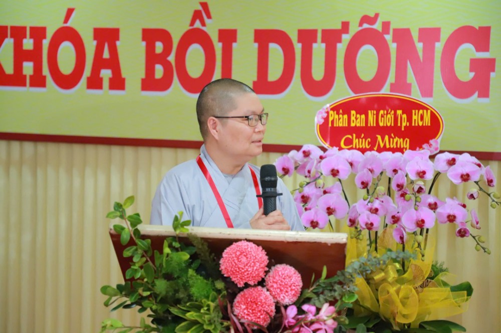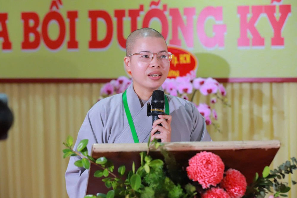 Đại diện học viên, Sư cô Thích Nữ Như Giác bày tỏ lòng tri ân đến quý Ni trưởng và chư Tôn đức đã tận tâm truyền đạt kiến thức, kinh nghiệm giúp học viên trưởng dưỡng kỹ năng và tự tin hơn trong công tác hoằng pháp.