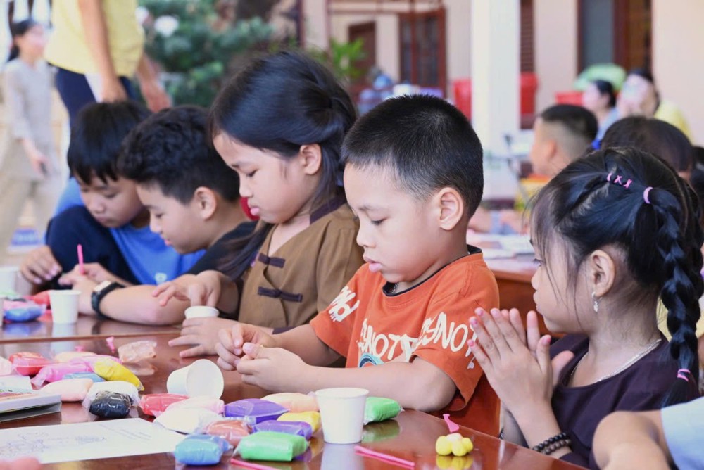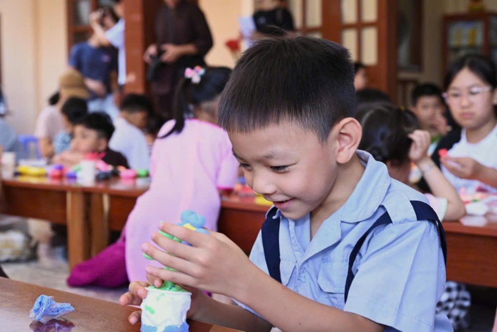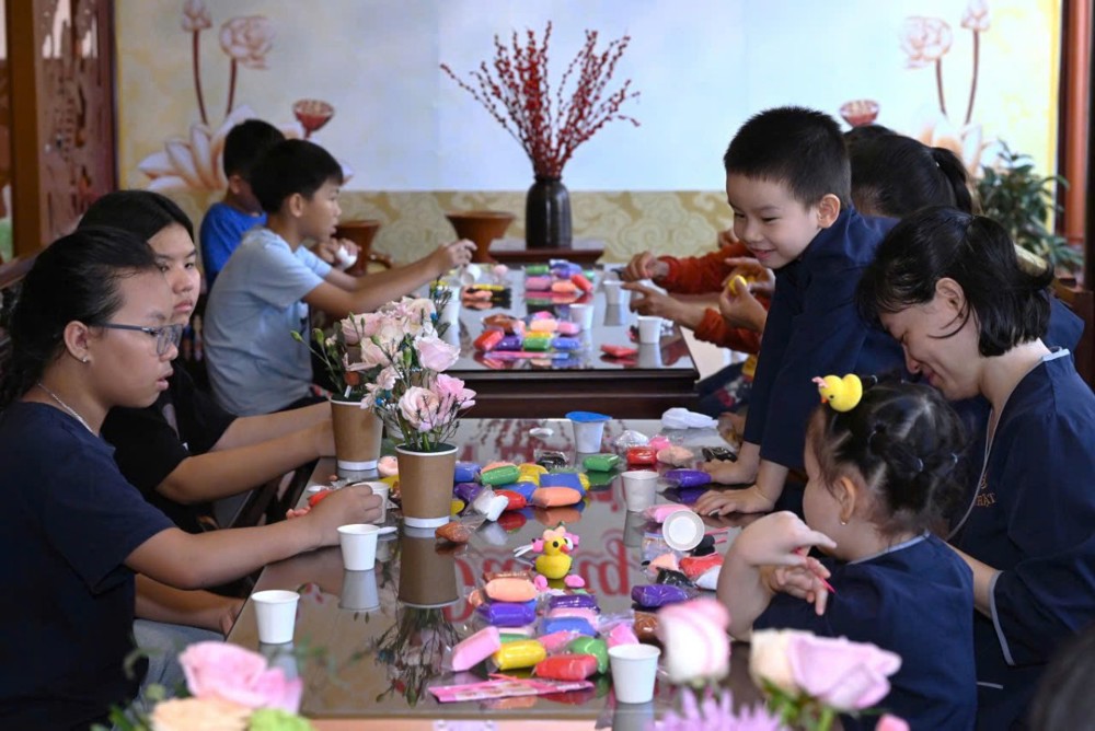 Đầu tiên các em tham gia đảnh lễ 12 hạnh nguyện Quán Âm. Theo đó, các em cắm hoa tươi tặng mẹ, tạo hình đất sét yêu thương tặng ba và tô tranh Bồ Tát Quán Âm hướng nguyện công đức cầu an đến ba mẹ.