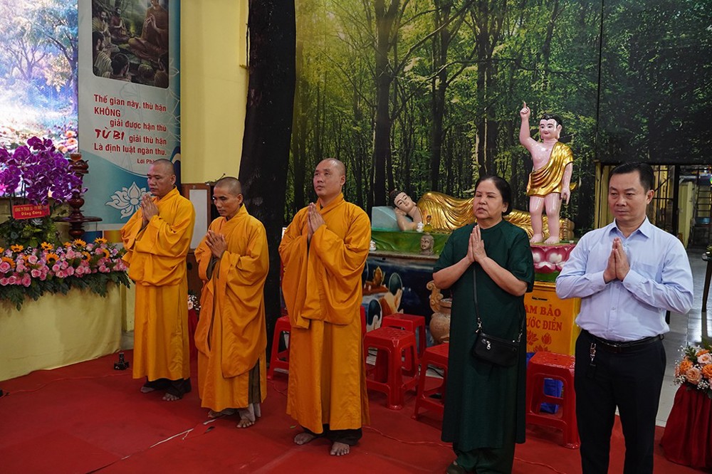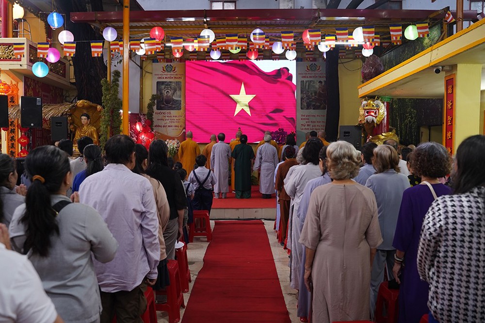 Trong không khí thiêng liêng, toàn thể đại chúng trang nghiêm hướng về cờ Tổ quốc và cờ Phật giáo, thể hiện tinh thần yêu nước, trách nhiệm công dân và sự gắn bó mật thiết giữa đạo pháp và dân tộc.