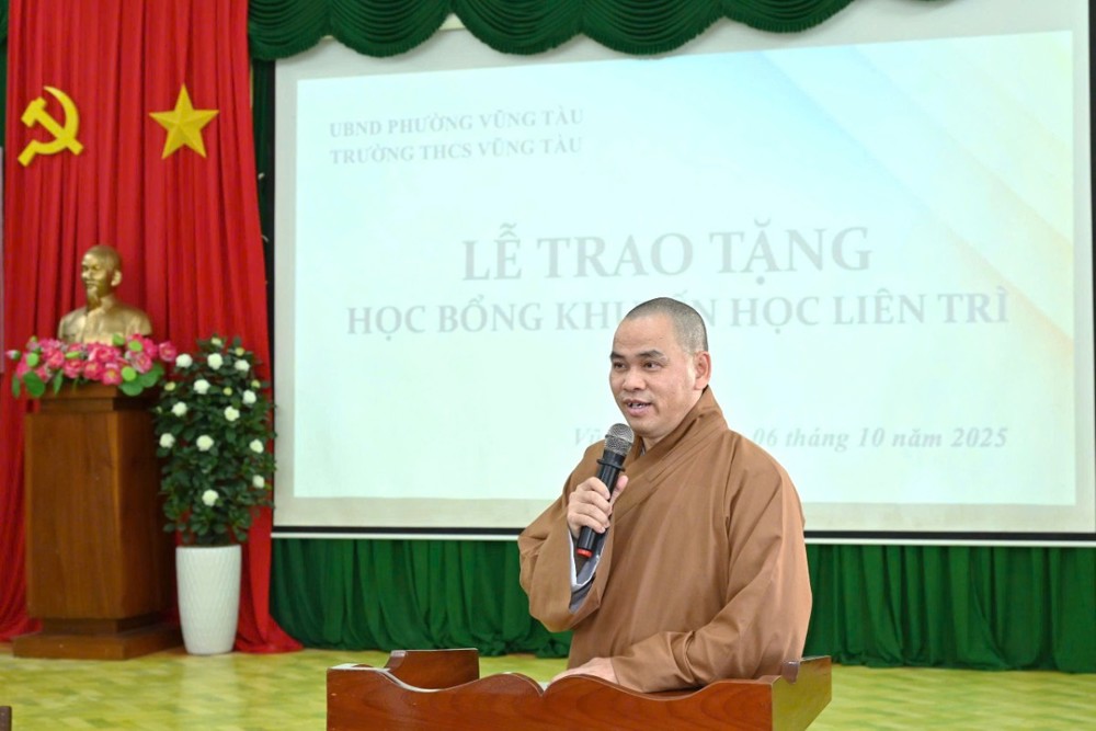 Đại diện nhà trường, cô Lê Thị Thanh Hoa, Hiệu trưởng Trường THCS Vũng Tàu đã phát biểu tri ân sâu sắc đến Quỹ Học bổng và các mạnh thường quân. Cô bày tỏ niềm xúc động trước sự quan tâm của Thượng tọa và chư Tăng, đây là động lực để các em học sinh nỗ lực phấn đấu trong học tập.