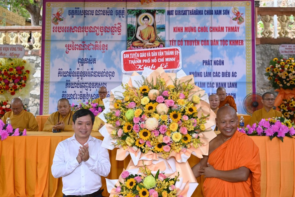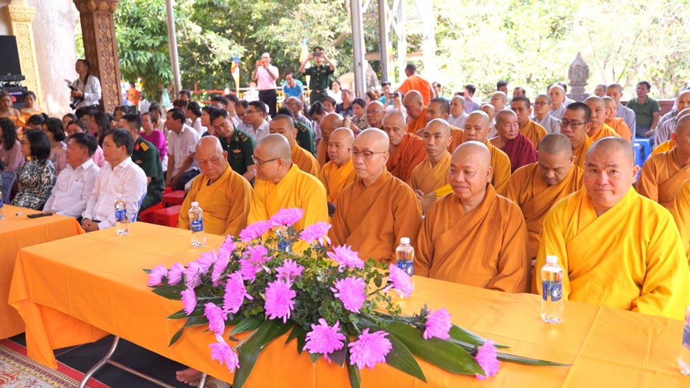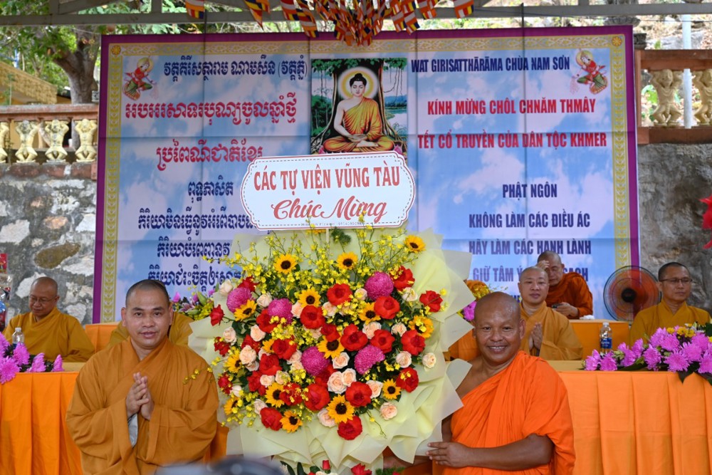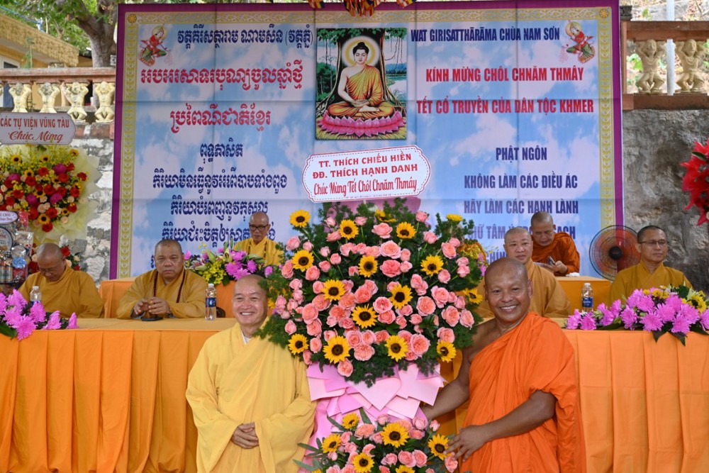 Thượng tọa Thích Minh Hạnh, thay mặt Ban Trị sự GHPGVN tỉnh, đã trang nghiêm tuyên đọc Thư chúc Tết của Hòa thượng Chủ tịch Hội đồng Trị sự gửi đến đồng bào Khmer nhân dịp Tết cổ truyền Chol Chnam Thmay. Tiếp đó, bà Lê Thị Thanh Bình, đại diện lãnh đạo chính quyền các cấp, cũng trân trọng tuyên đọc Thư chúc Tết của Thủ tướng Chính phủ, chuyển tải những lời chúc mừng năm mới an lành, hạnh phúc.