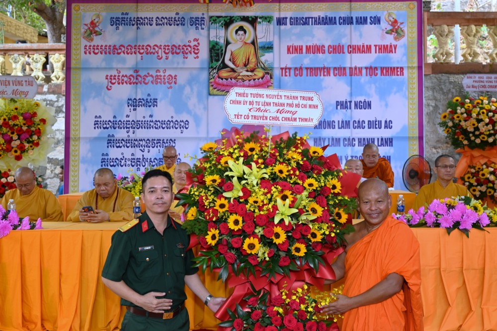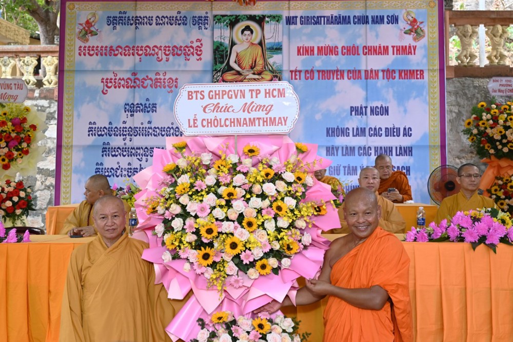 Sau đó, Ban Tổ chức đã trang trọng đón nhận những lẵng hoa tươi thắm cùng nhiều phần quà ý nghĩa từ chư Tôn đức, lãnh đạo các cấp và đại diện các ban, ngành, đoàn thể gửi đến chúc mừng Tết cổ truyền Chol Chnam Thmay.