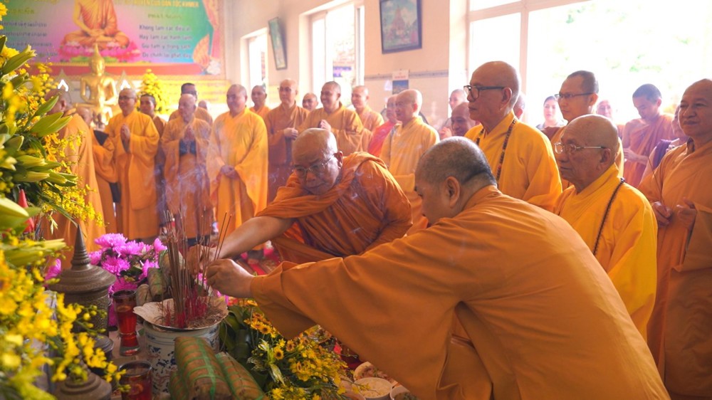 Sau khi buổi lễ khép lại trong không khí trang nghiêm và hoan hỷ, chư Tôn đức Thường trực BTS cùng chư Tôn đức Tăng Ni trụ trì các tự viện đã quang lâm Chánh điện, thành kính niêm hương, nhất tâm cầu nguyện cho quốc thái dân an, thiên hạ thái bình, nhân dân an lạc; đồng thời trang nghiêm dâng hương tưởng niệm lần thứ 4 cố Hòa thượng Quách Thành Sơn, nguyên Viện chủ chùa Nam Sơn, qua đó bày tỏ lòng tri ân sâu sắc đối với bậc tiền bối hữu công đã cống hiến trọn đời cho Đạo pháp và Dân tộc, để lại dấu ấn tốt đẹp trong lòng Tăng Ni và Phật tử.