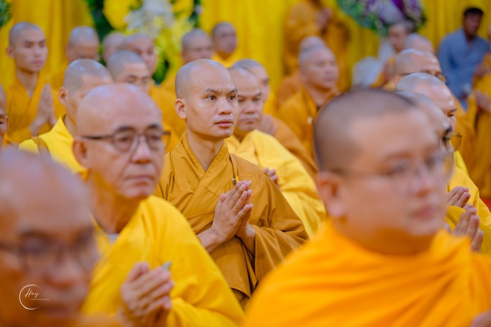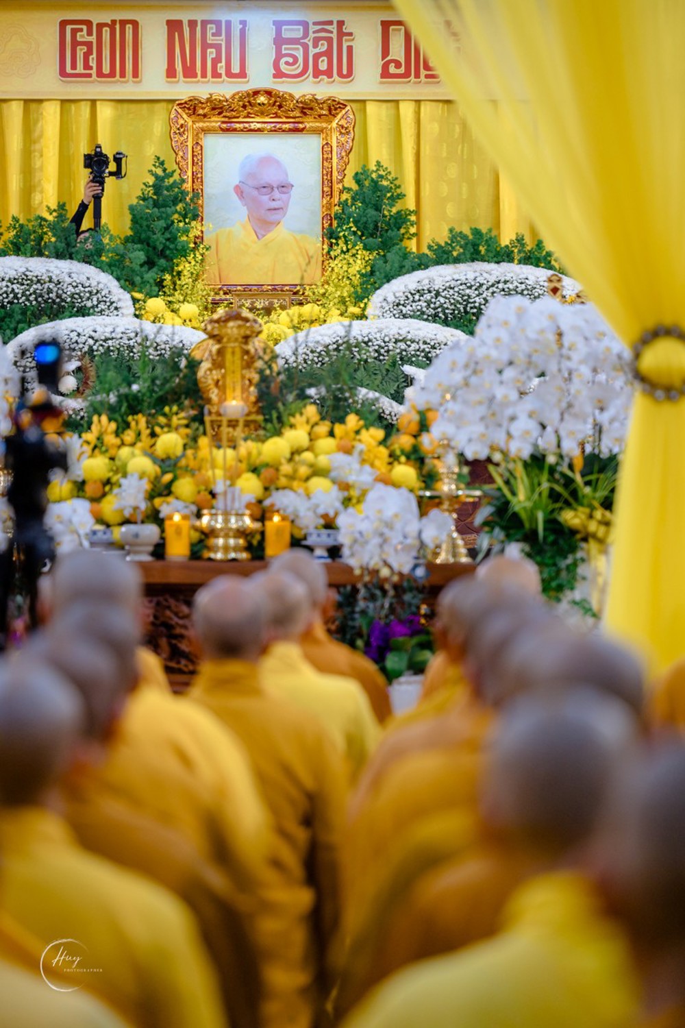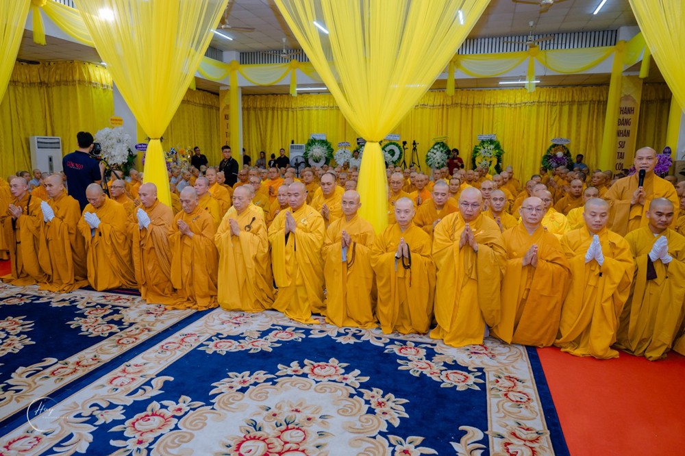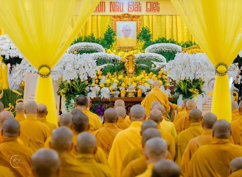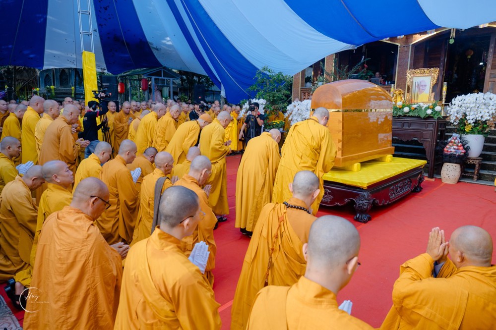 Trong bầu không khí xúc động lặng sâu, tiếng kinh cầu nguyện vang lên trầm hùng, thành kính tiễn biệt bậc chân nhân. Kính nguyện Giác linh Trưởng lão Hòa thượng bất vong nguyện lực, đàm hoa tái hiện, đạo vàng rạng chiếu, quang huy tông phong họ Thích.