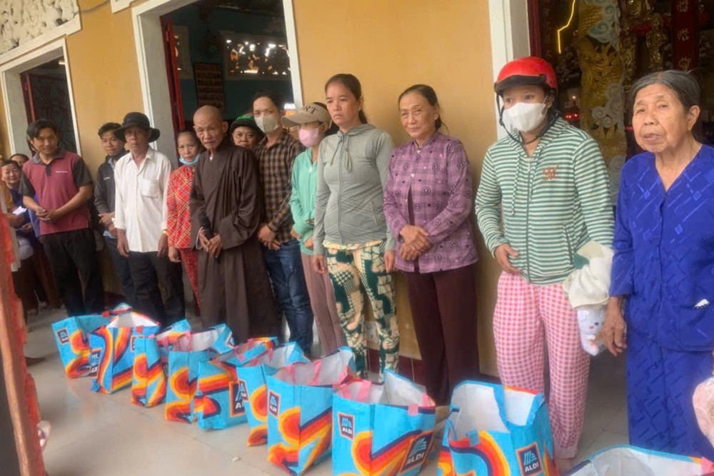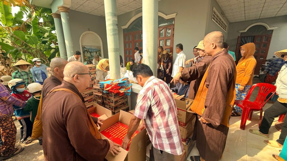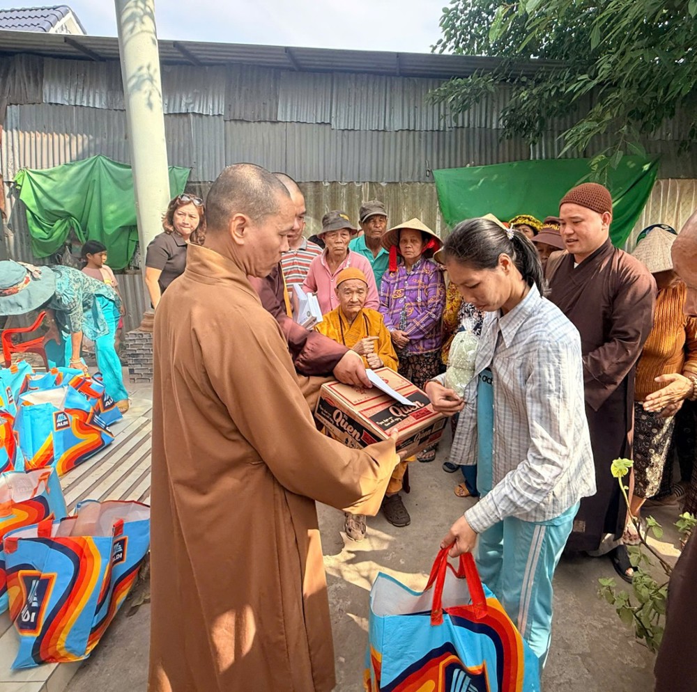 Cùng ngày, đoàn đã quang lâm chùa Kim Thiền (xã Tân Thới, tỉnh Đồng Tháp), trao tặng 250 phần quà Tết đến các hộ gia đình có hoàn cảnh khó khăn, thể hiện tinh thần từ bi cứu khổ và sự đồng hành của Phật giáo với bà con trong những ngày giáp Tết cổ truyền.