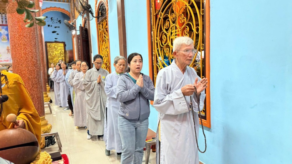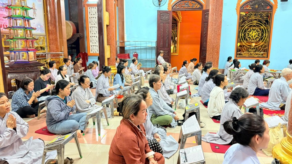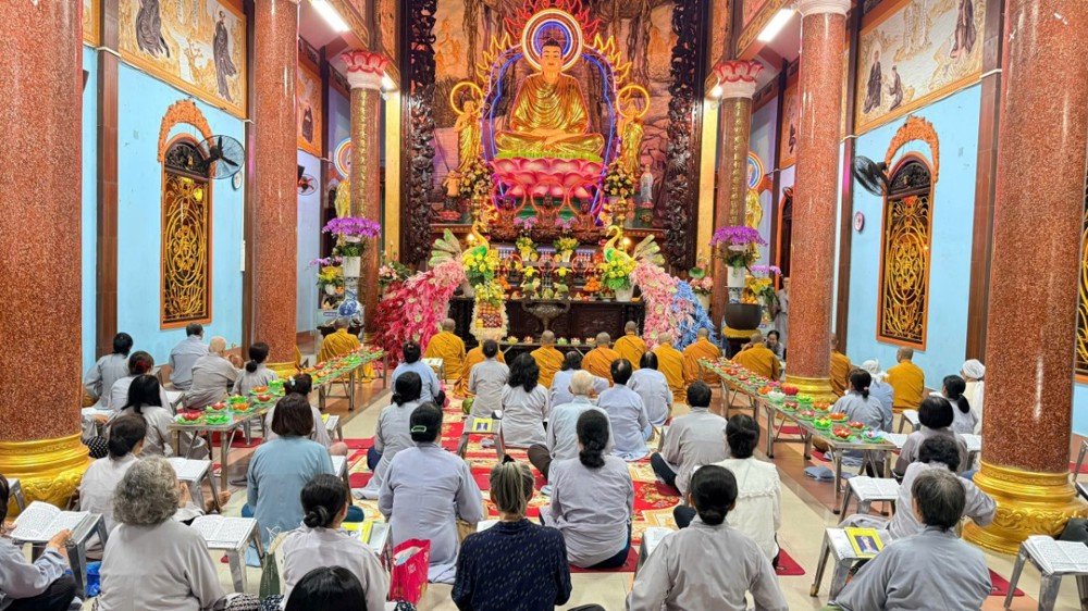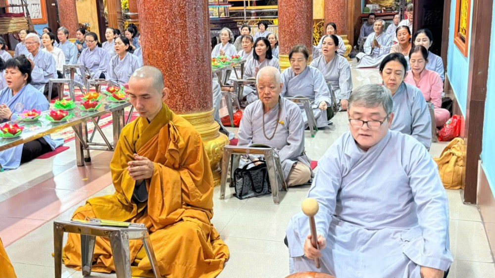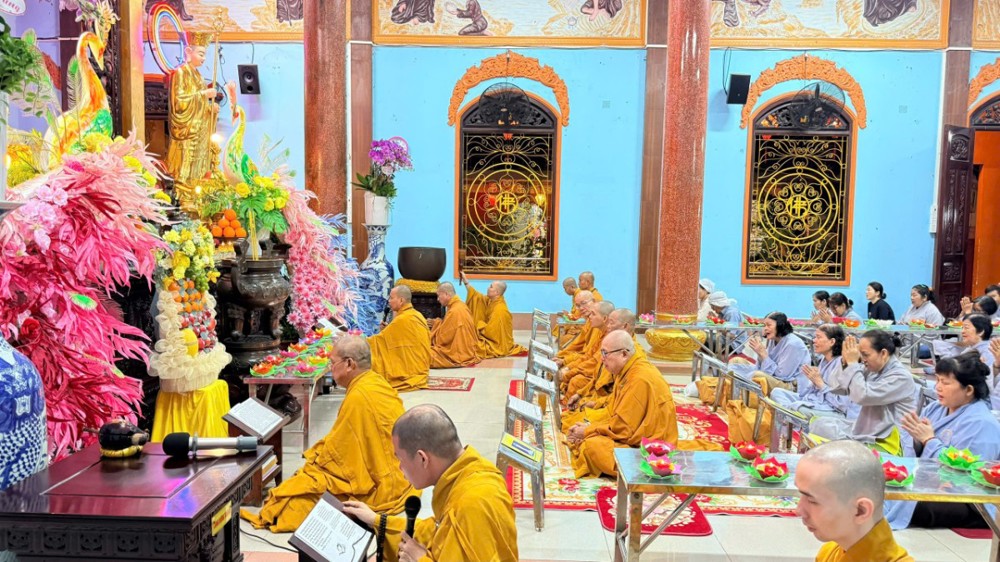 Trong không gian đạo tràng trang nghiêm, đại chúng đồng thanh trì tụng kinh A Di Đà, nhiếp tâm kinh hành và thắp sáng những ngọn hoa đăng, nhất tâm tưởng niệm hồng danh Đức Từ Phụ. Dưới sự hướng dẫn, sách tấn của Thượng tọa chứng minh, chư Tăng và Phật tử cùng phát khởi tín tâm, nuôi dưỡng tín – nguyện – hạnh, chí thành noi theo và hành trì những đại nguyện của Đức Phật A Di Đà, lấy đó làm kim chỉ nam trong đời sống tu học.