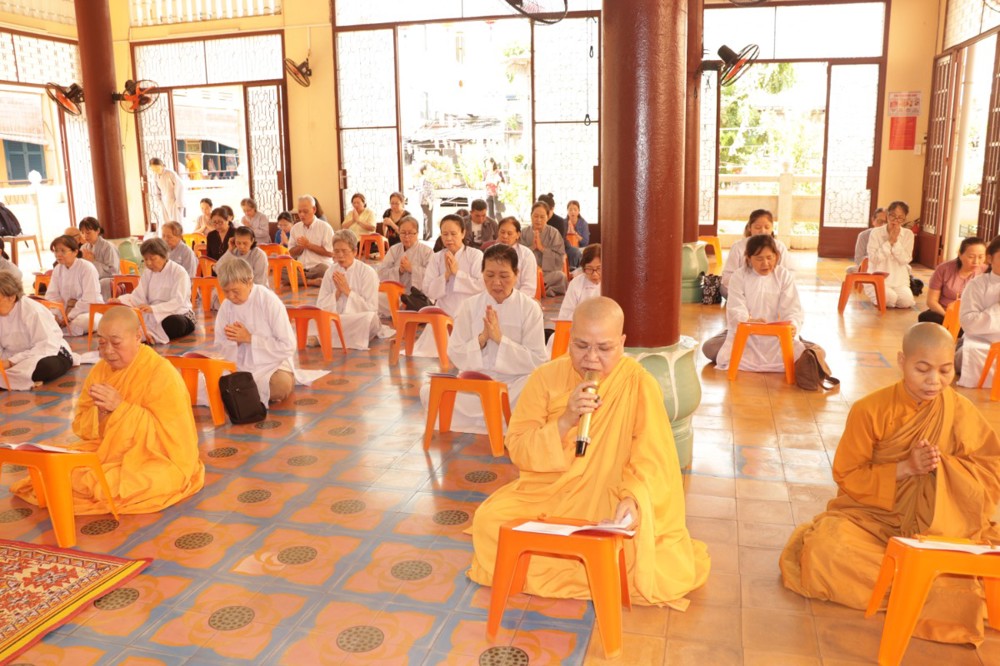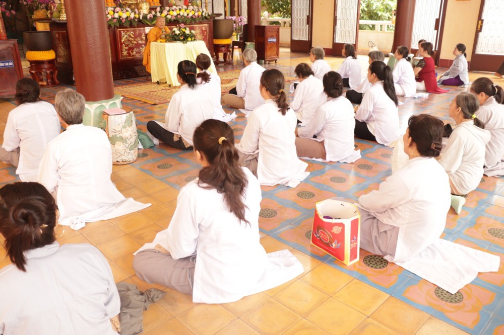 Sau lời đạo từ quý báu của Ni trưởng trụ trì, Ni trưởng Thích Nữ Tín Liên đã thuyết pháp cho Phật tử với đề tài “Phật Đản sinh: Ý nghĩa Vesak và các sự kiện quan trọng trong cuộc đời Đức Phật Thích Ca.” Sau thời pháp, Ni trưởng đã truyền giới cho các Phật tử phát tâm quy y Tam bảo.