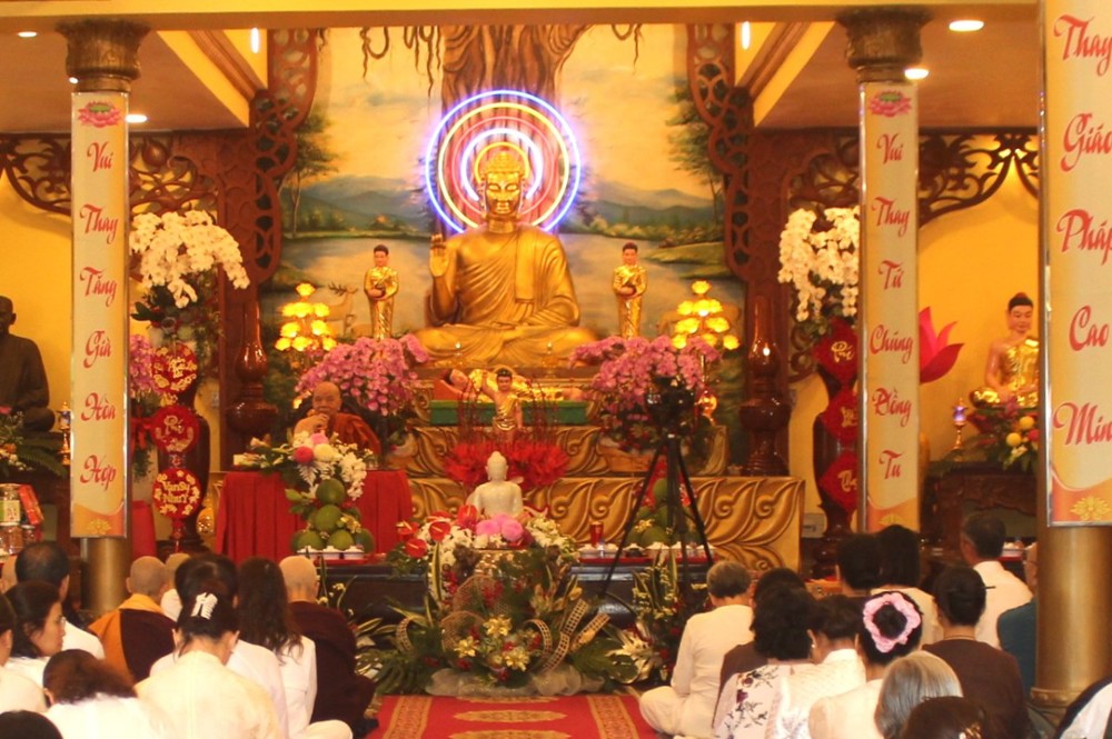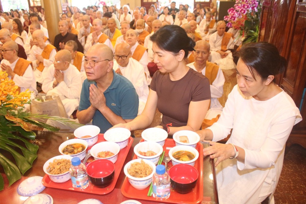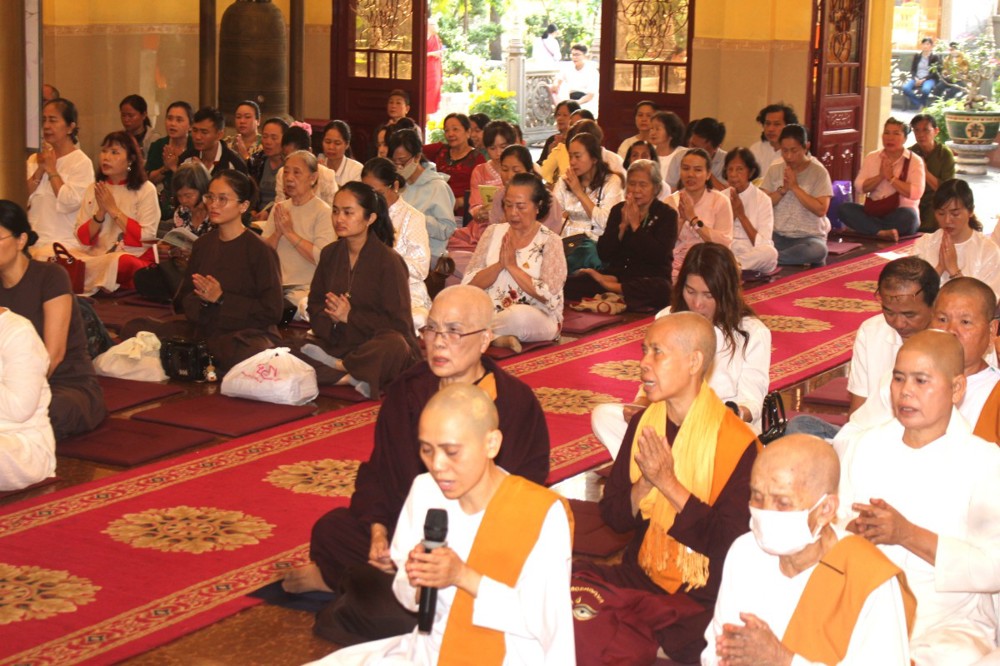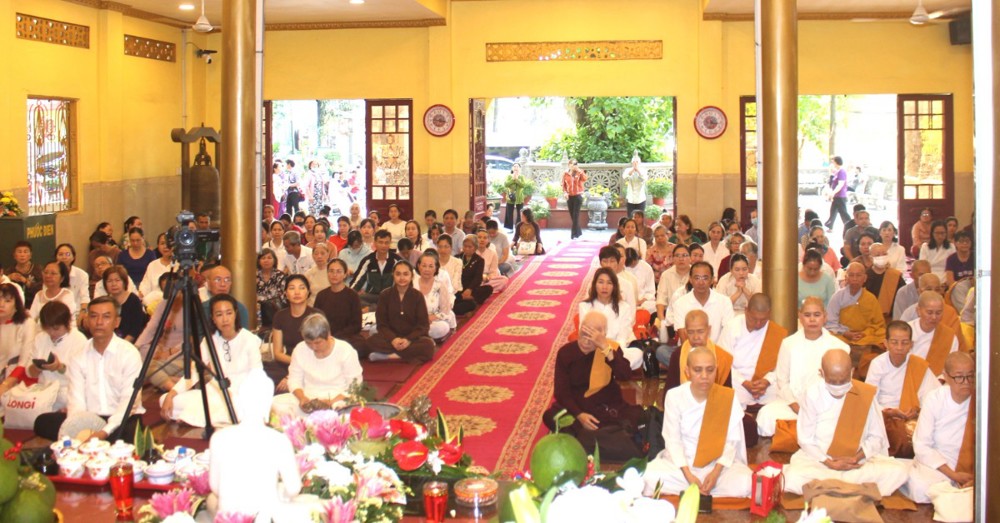 Tiếp đó, chư Tăng vân tập về chánh điện dâng hương lên đấng Từ phụ; chư Phật tử cung thỉnh thọ giới, dâng hương và dâng hoa. Chư Tăng tụng kinh phúc chúc nhân dịp lễ Rằm. Sau cùng, chư Tăng thực hiện nghi thức kinh hành quanh bổn tự, rồi cùng quần chúng tín đồ thọ trai và hoàn mãn chương trình buổi lễ trong niềm hoan hỷ.