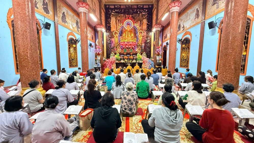 Qua hình ảnh ghi nhận, tôn tượng Đức Phật Dược Sư Lưu Ly Quang Vương được tôn trí trang nghiêm giữa ánh hào quang rực rỡ. Đông đảo Phật tử các lứa tuổi tay nâng bản kinh, chí thành trì tụng, thể hiện niềm tin sâu sắc nơi Tam Bảo và ước nguyện bình an cho gia đình. Đặc biệt, nhiều gia đình đưa con em về chùa tham dự pháp hội, tự tay dâng đăng cúng Phật, thắp sáng những đóa sen lung linh, gieo duyên lành và nuôi dưỡng tâm thiện cho thế hệ trẻ.