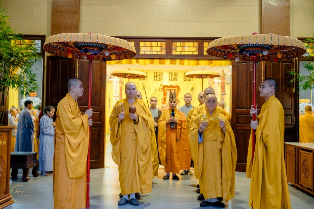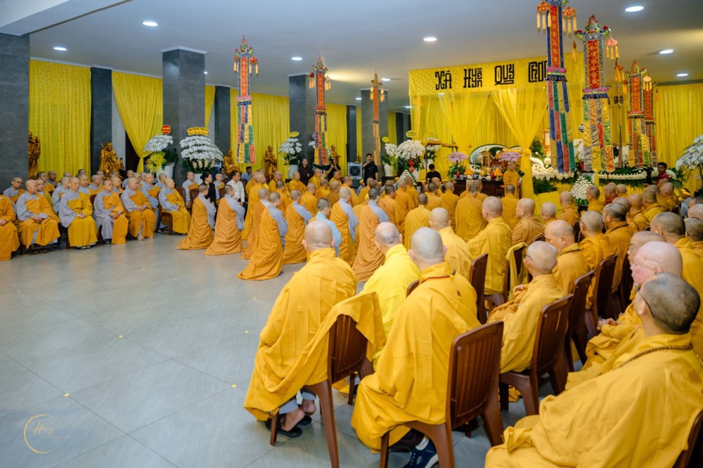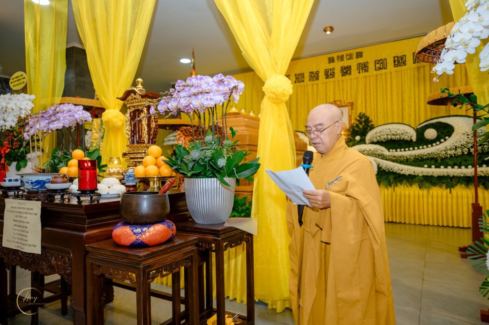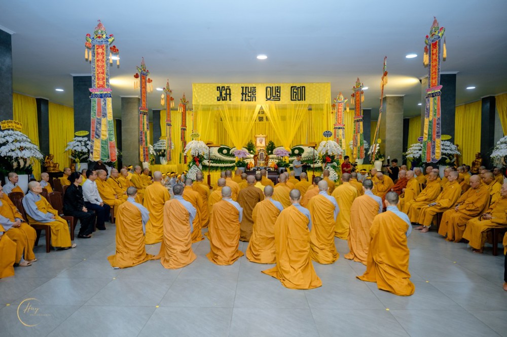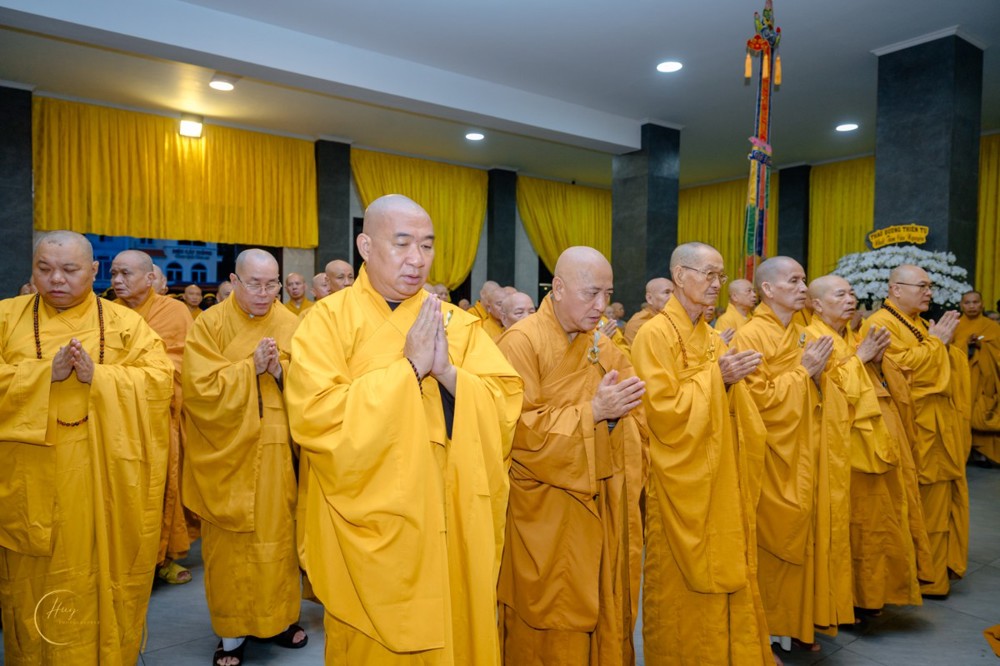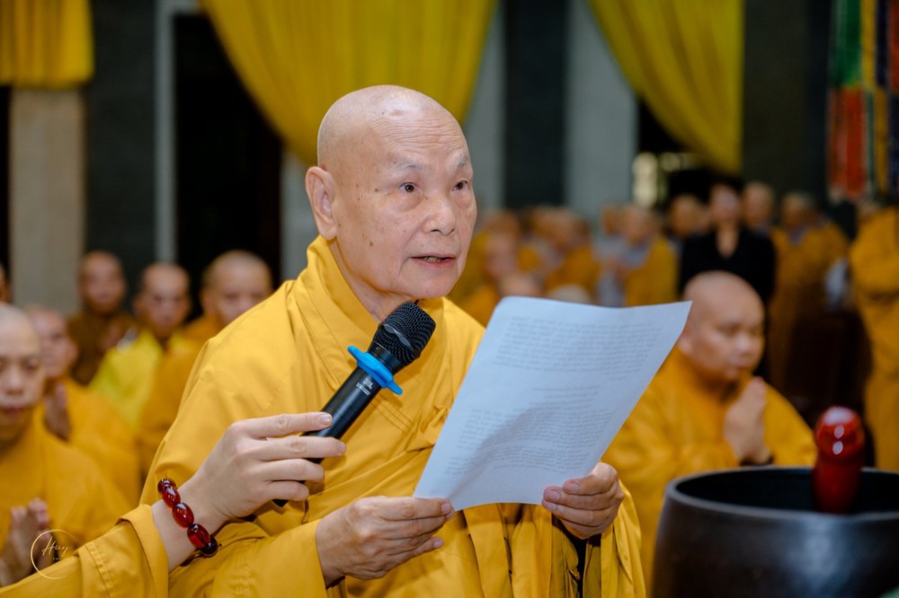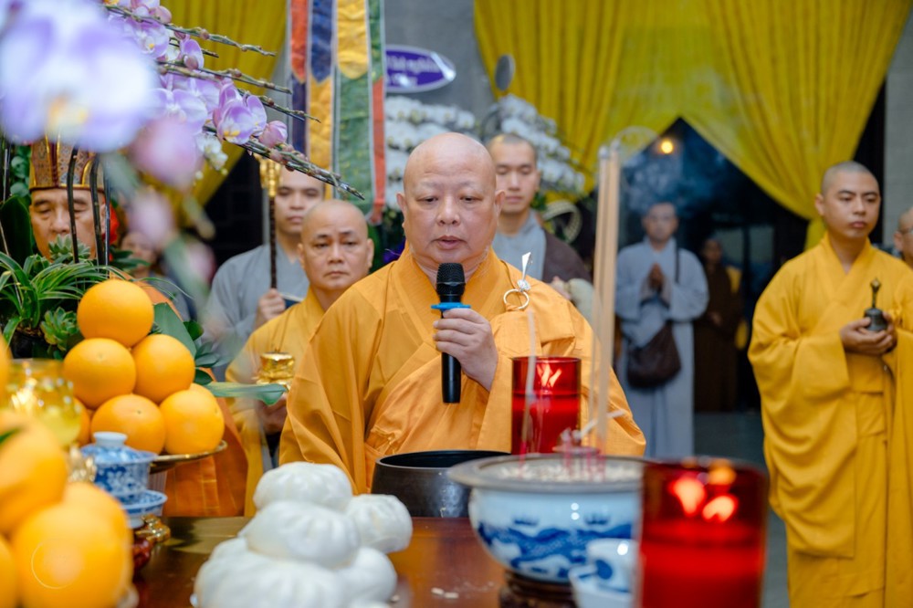 Tiếp nối chương trình, Hòa thượng Thích Lệ Trang – Phó Chủ tịch HĐTS, Trưởng ban Nghi lễ Trung ương, Trưởng ban Trị sự GHPGVN TP.HCM làm sám chủ, chủ trì nghi lễ tuyên pháp ngữ, phất trần trong không khí thanh tịnh, cùng tiếng niệm Phật liên hồi vang vọng của Tăng Ni và Phật tử.