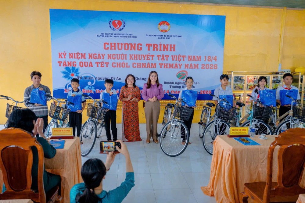 PSO - Sáng 14/4/2026, trong không khí đón mừng Tết Chôl Chnăm Thmây, tại chùa Tông Kim Quang (xã Phú Giáo), chương trình trao tặng phương tiện đi lại và quà cho người khuyết tật, trẻ mồ côi và người dân có hoàn cảnh khó khăn đã được tổ chức, nhân kỷ niệm Ngày Người khuyết tật Việt Nam (18/4).