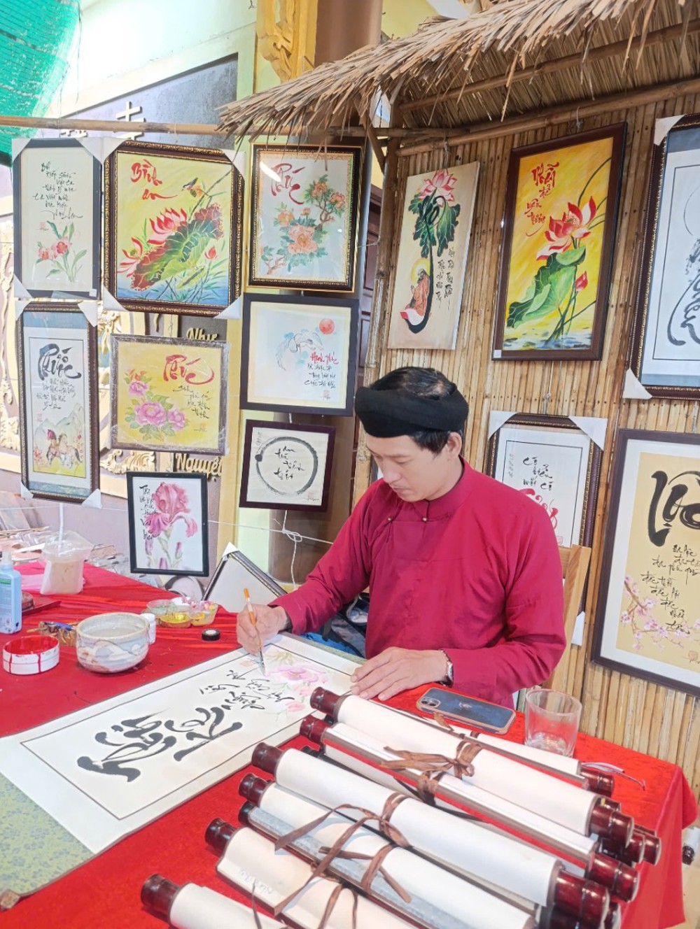 Một góc sân chùa trở nên sinh động mà vẫn trang nhã với hình ảnh ông đồ cho chữ. Những câu pháp ngữ đầu xuân được trao tặng như lời nhắc nhở hướng thiện, nuôi dưỡng đạo tâm và xây dựng đời sống an vui. Nét chữ thư pháp mềm mại không chỉ là món quà tinh thần, mà còn là sự kết nối giữa văn hóa dân tộc và ánh sáng Phật pháp.