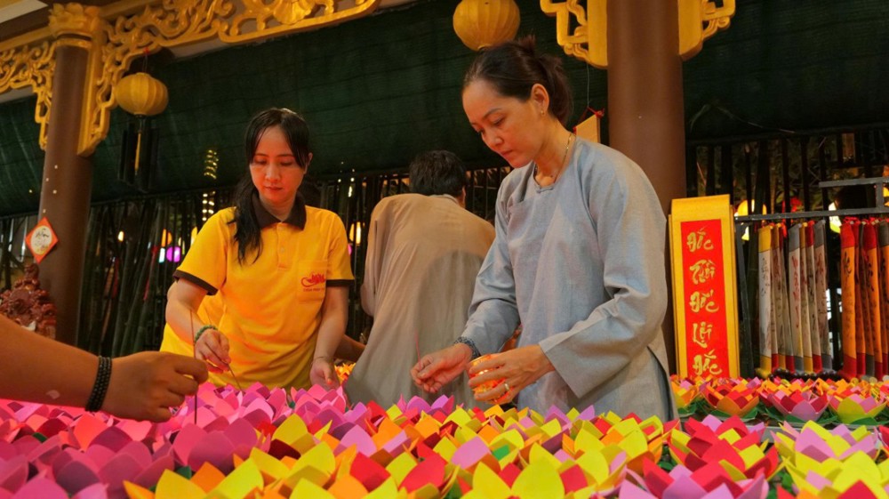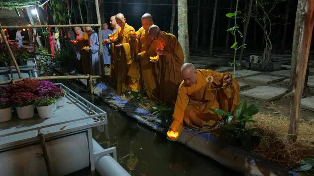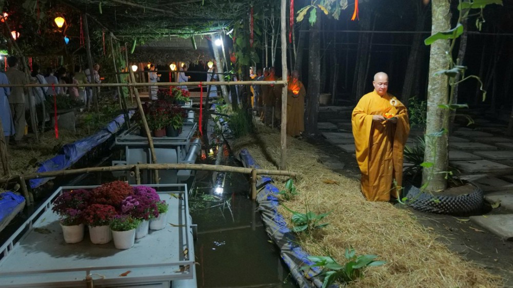 Trong khu vườn thiền tĩnh lặng, những hoa đăng mang theo ước nguyện đầu xuân được thắp sáng và thả xuống dòng nước, tạo nên khung cảnh trang nghiêm, sâu lắng. Mỗi ánh đèn là một lời phát nguyện hướng thiện, nhắc nhở con người quay về soi sáng tự tâm.