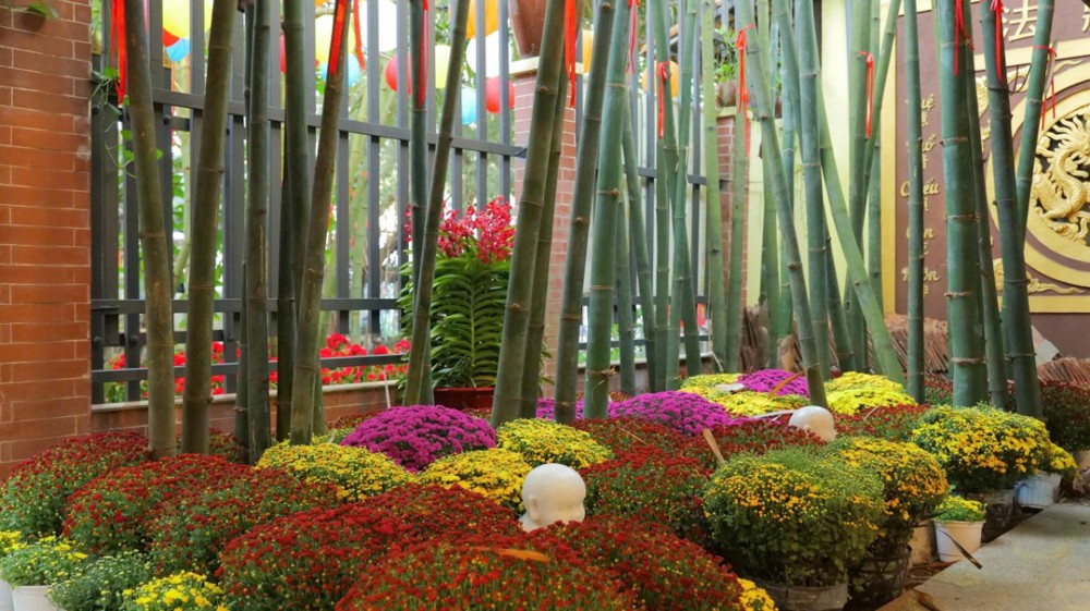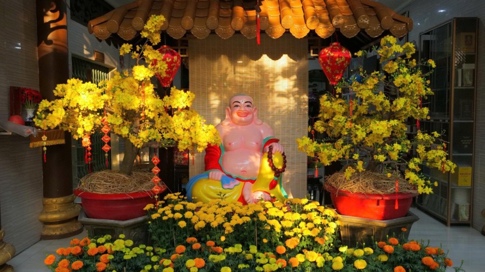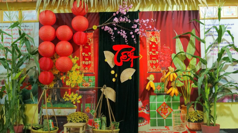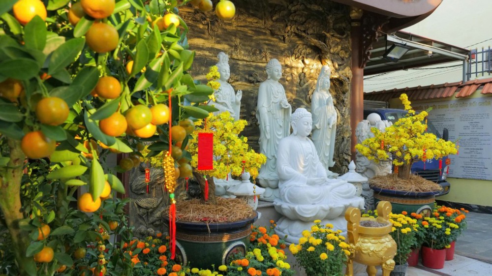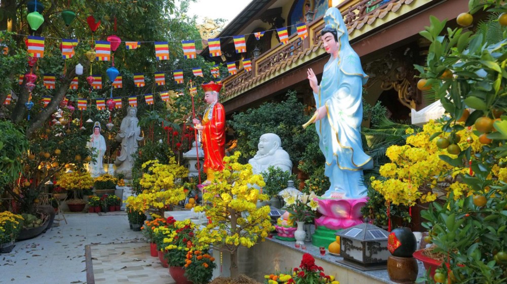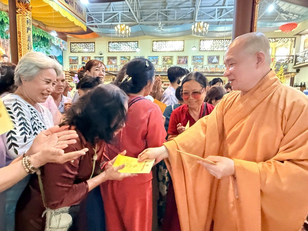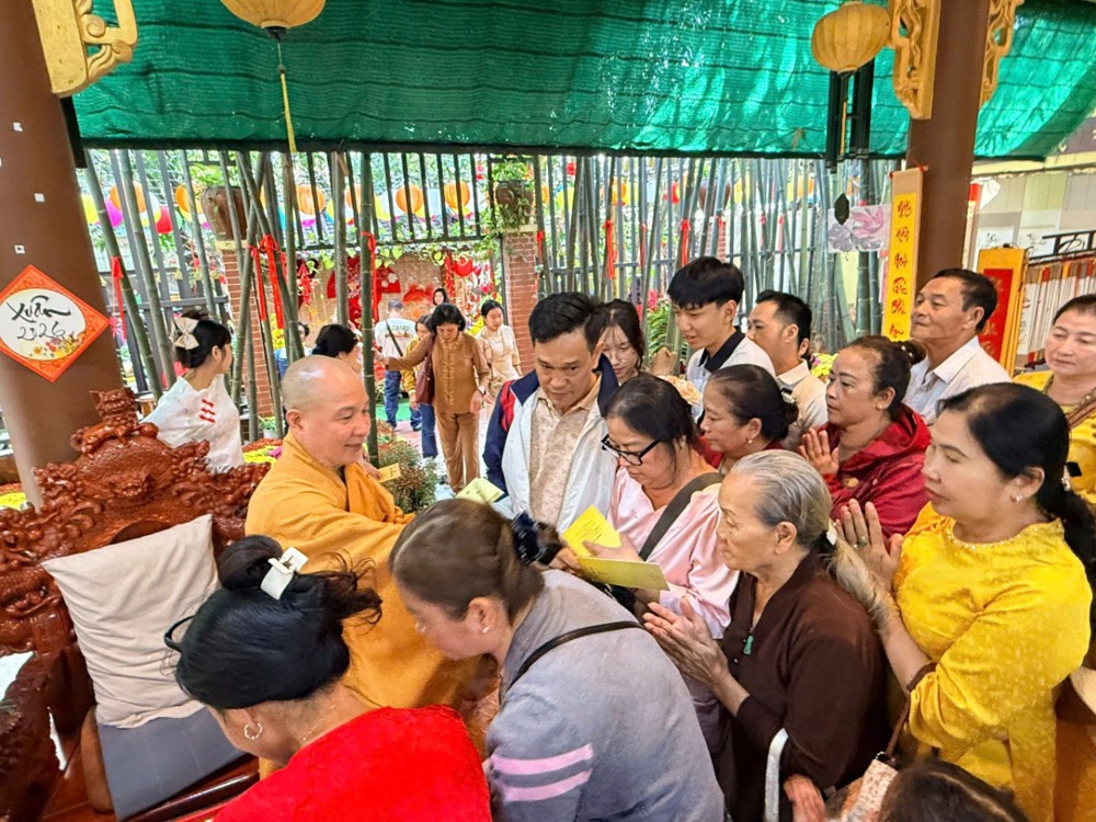 Sau thời pháp, Phật tử hoan hỷ đón nhận lộc xuân từ chư Tôn đức. Khắp khuôn viên chùa, mai vàng, đào thắm, đèn lồng, bánh chưng, bánh tét… được bày trí trang nhã, tạo nên không khí Tết cổ truyền đậm đà bản sắc dân tộc nơi chốn già lam.