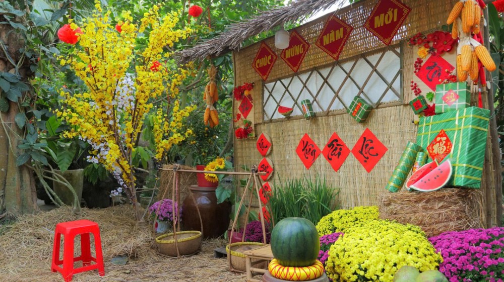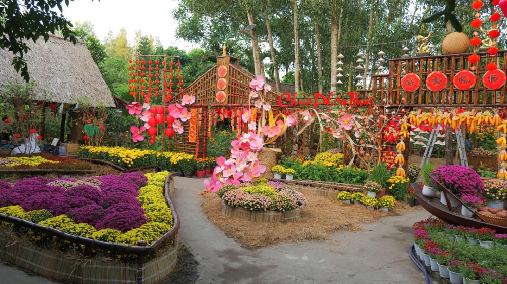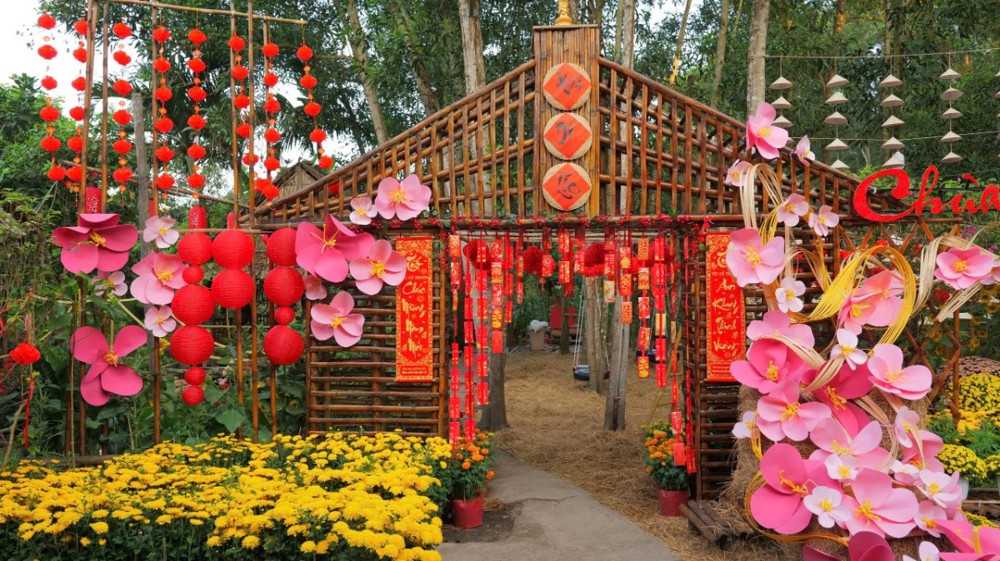 Với chủ đề Xuân Bính Ngọ 2026, chùa Pháp Tạng (Xã Bình Lợi, TP.HCM) được trang hoàng trang nghiêm mà ấm áp, tái hiện hình ảnh làng quê Nam Bộ thanh bình giữa chốn đô hội. Những tiểu cảnh mộc mạc với chợ quê, mái tranh, ghe thuyền, hoa trái ngày Tết… không chỉ tạo nên sắc xuân rực rỡ mà còn gợi nhắc tình quê, giúp người ghé thăm cảm nhận sự gần gũi, thân thương và bình yên nơi cửa thiền.