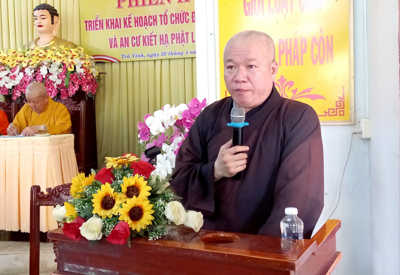Sau phần phát biểu khai mạc của HT. Thạch Sok Xane, ĐĐ. Thích Minh Trí – Phó Thư ký kiêm Chánh Văn phòng BTS, Trưởng ban Thông tin Truyền thông Phật giáo tỉnh đã trình kế hoạch chào mừng Đại lễ Phật đản và An cư Kiết hạ, PL.2567 đến chư Tôn đức.