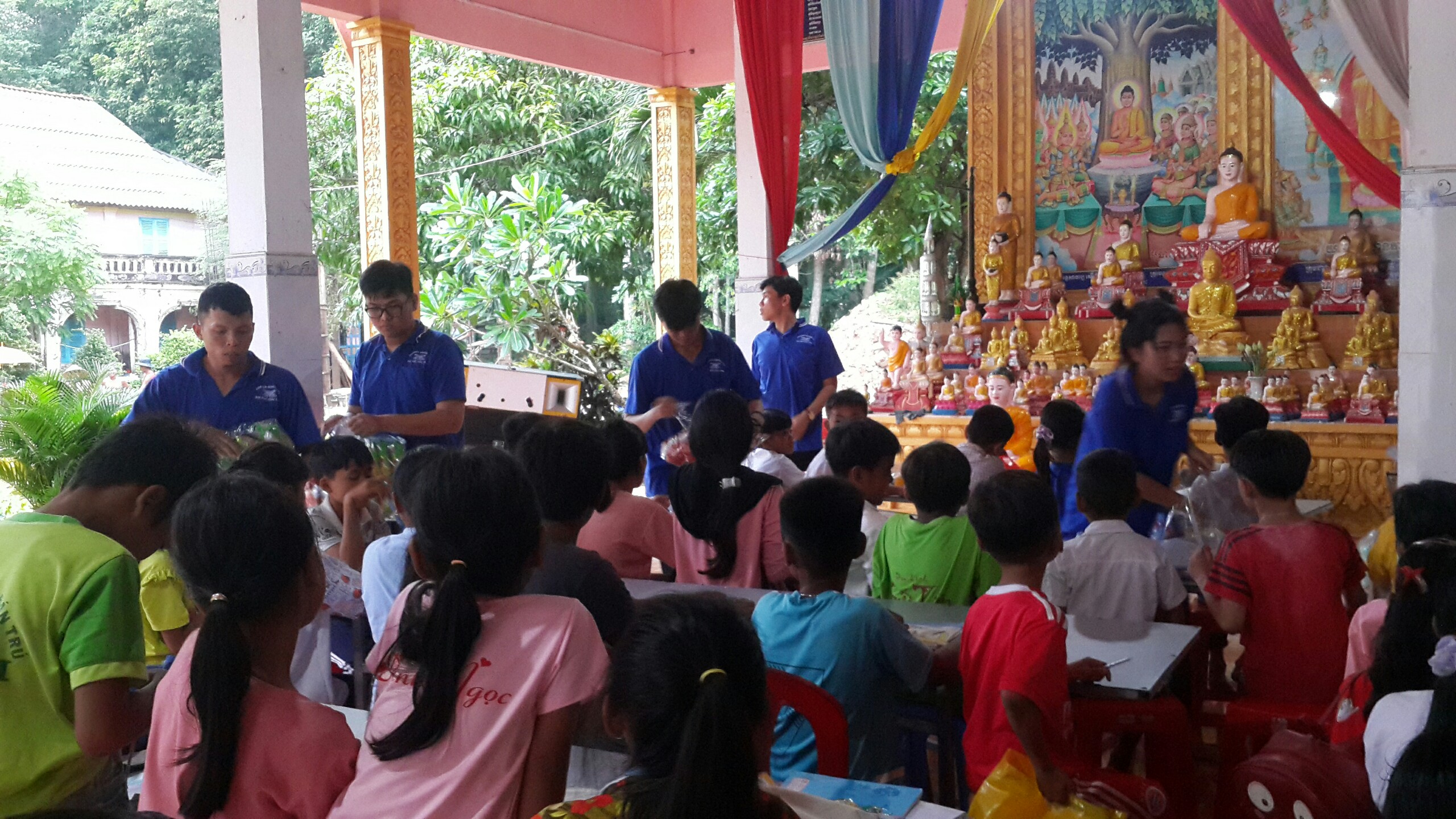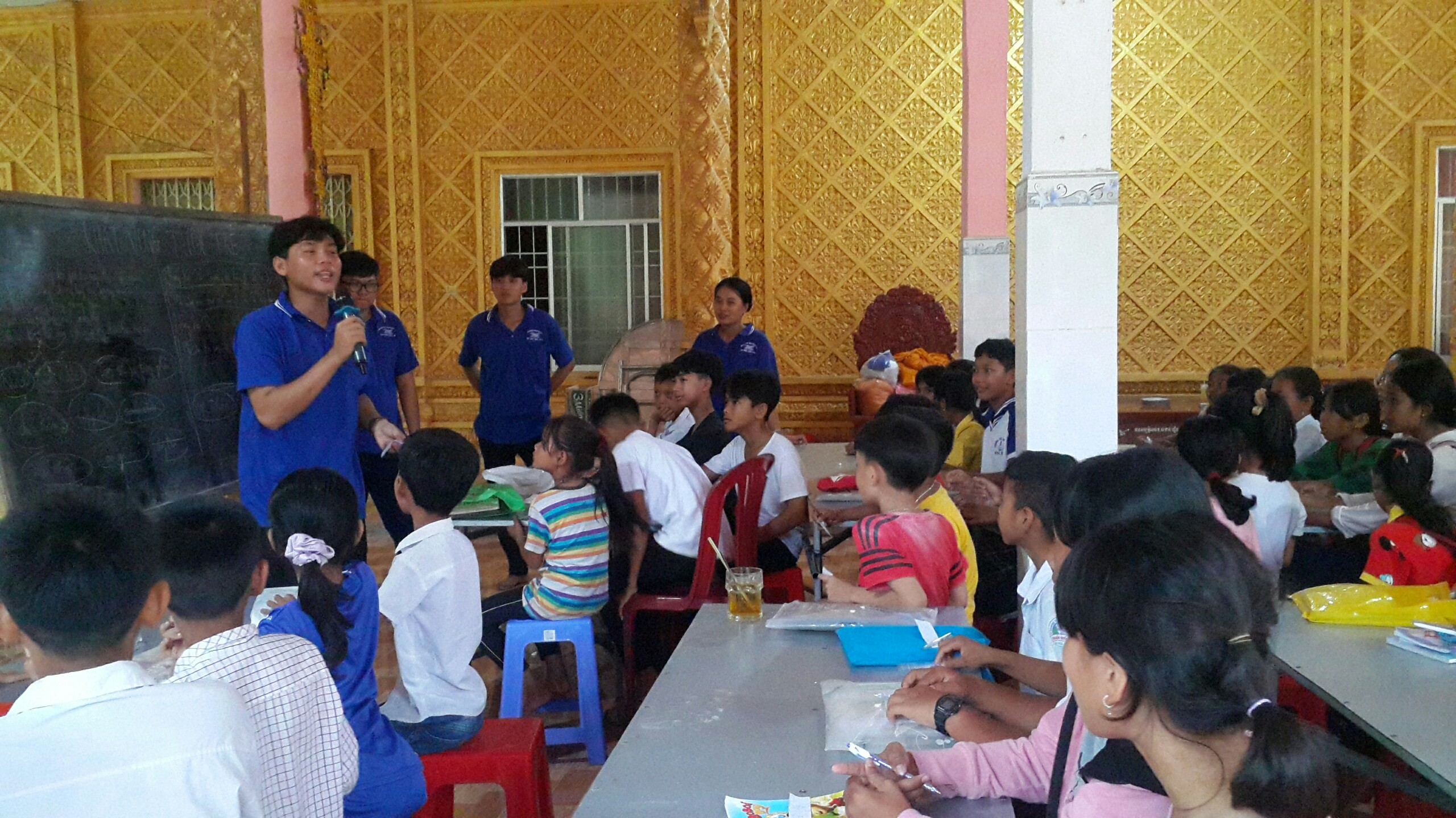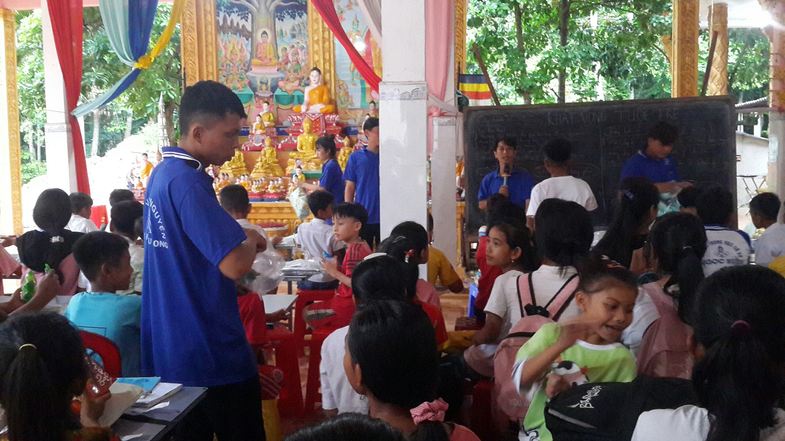 PSO - Chiều ngày 24/6/2022 ( nhằm ngày 25/5 năm Nhâm Dần ) Chùa Kompong SaLa - Chùa Tha kết hợp cùng Đạo Tràng Pháp Hoa Trà Vinh, Hội khuyến học xã và xã Đoàn tổ chức trao tặng 800 cuốn tập và 800 cây viết cho các em học sinh người dân tộc, đang học chữ Khmer vào dịp hè tại chùa Kompong SaLa ( ấp Tha La, xã Ngọc Biên, huyện Trà Cú, tỉnh Trà Vinh ). Tham dự buổi lễ có ĐĐ. Thạch Sóc Kha - Ủy viên Ban chấp hành Hội ĐKSSYN huyện - Phó trụ trì chùa Kompong SaLa. Về phía Đạo Tràng Pháp Hoa Trà Vinh và chính quyền có sự tham dự của Phật tử Pháp Trí - Đại diện Đạo Tràng Pháp Hoa Trà Vinh; ông Hà Minh Dũ - Chủ tịch Hội khuyến học xã; bà Thạch Thị Sâm Nang - Phó bí thư xã Đoàn, cùng các bạn Đoàn viên và các em học sinh. Phát biểu tại buổi lễ, ĐĐ. Thạch Sóc Kha cho biết 2 năm trước do ảnh hưởng dịch bệnh Covid -19, chùa Kompong SaLa nói riêng, các chùa Phật giáo Nam tông Khmer trong tỉnh nói chung không tổ chức dạy chữ Khmer vào dịp hè cho các em người dân tộc. Năm nay, dịch bệnh đã ổn định nên được sự chỉ đạo của Thường trực Hội ĐKSSYN tỉnh, Hội ĐKSSYN huyện Trà Cú khuyến khích các chùa nào có đầy đủ điều kiện, nên tổ chức dạy chữ Khmer cho các em người dân tộc. Vì thế, năm nay số lượng các em đến chùa học khá đông, nên cần tập, viết để trao tặng cho em khi đến học, qua đó góp phần giữ gìn và phát triển tiếng mẹ đẻ của dân tộc mình. Chương trình tặng dụng cụ học tập đợt này cho các em học sinh người dân tộc học chữ Khmer tại chùa Kompong SaLa, do Đạo Tràng Pháp Hoa Trà Vinh vận động quý nam nữ Phật tử cùng quý mạnh thường quân gần xa hỗ trợ và trao tặng 800 cuốn tập và cây viết, trị giá 8 triệu đồng. Dịp này, Ban chấp hành xã Đoàn Ngọc Biên đã hướng dẫn các bạn sinh viên Trường đại học Cửu Long, đang tham gia chiến dịch tình nguyện mùa hè xanh năm 2022 tại địa bàn xã, đến giao lưu sinh hoạt hè, tặng quà và tổ chức các trò chơi cho các em học sinh thêm niềm vui sau giờ tan học.