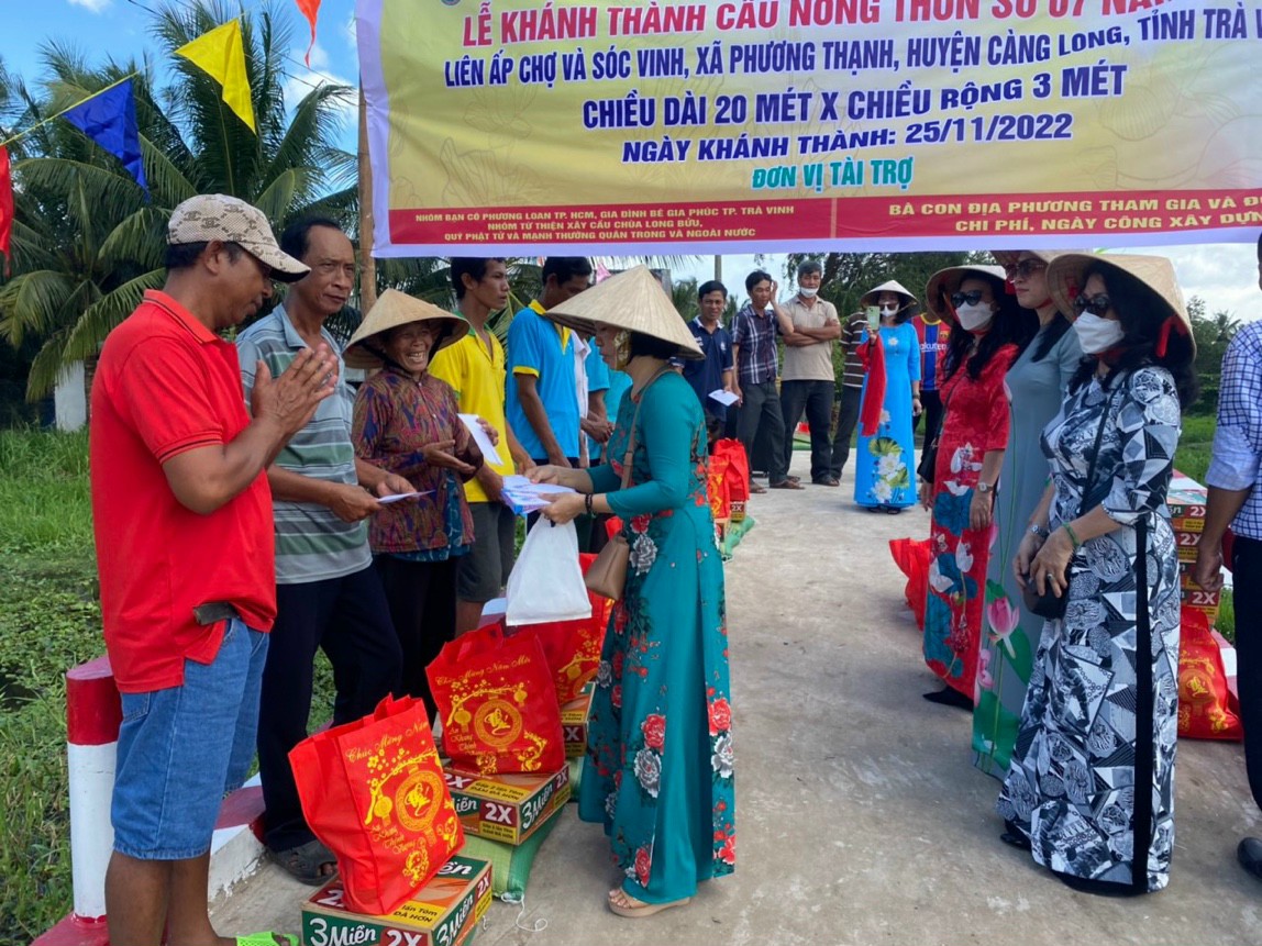 Nhân buổi khánh thành cầu ĐĐ. Thích Minh Trí cùng nhóm Phật tử Phương Loan đã trao tặng 50 phần quà đến bà con có hoàn cảnh khó khăn trên địa bàn, mỗi phần quà gồm: gạo, mì nhu yếu phẩm và tiền mặt. Trị giá mỗi phần là 500 ngàn đồng.