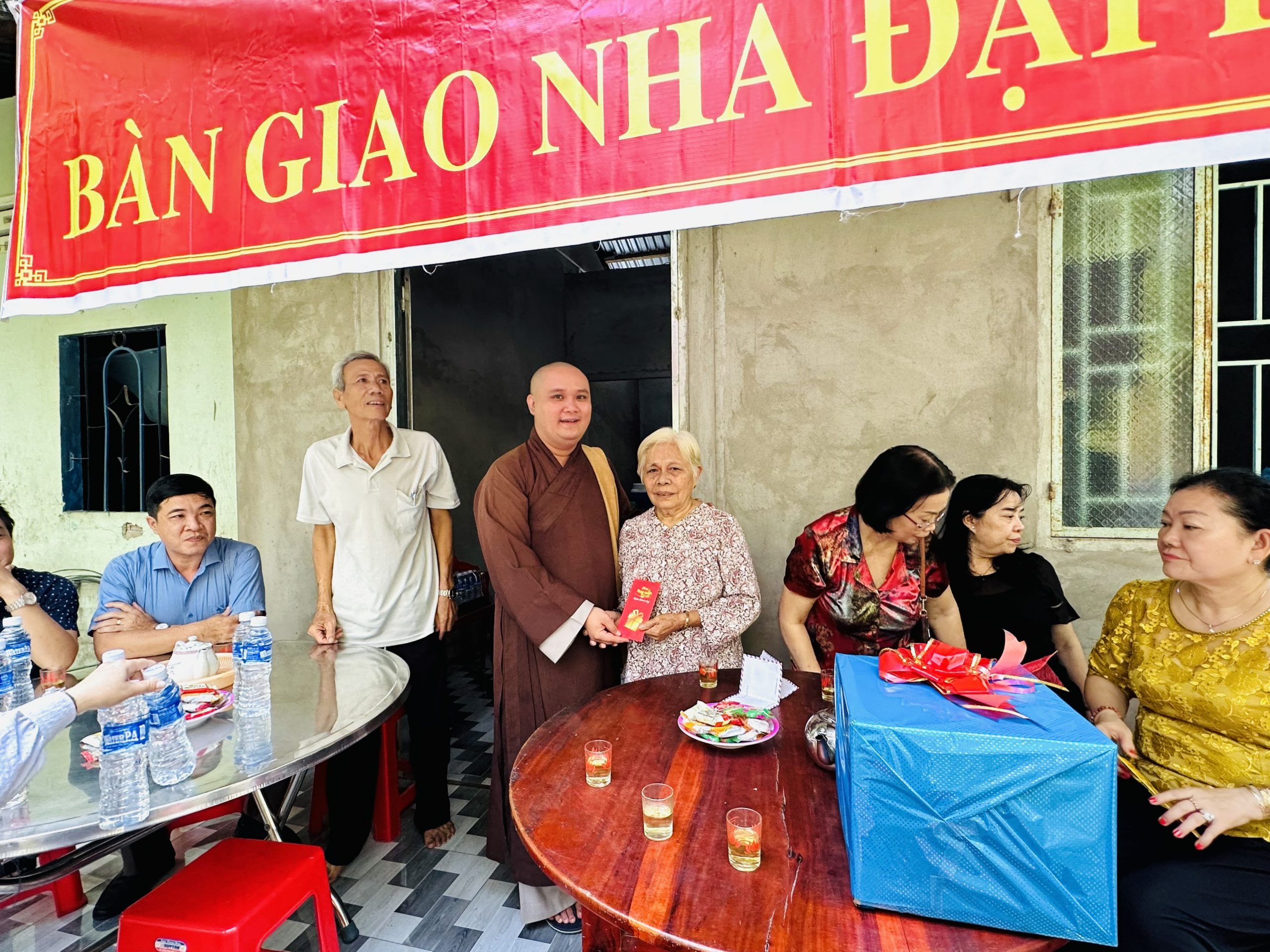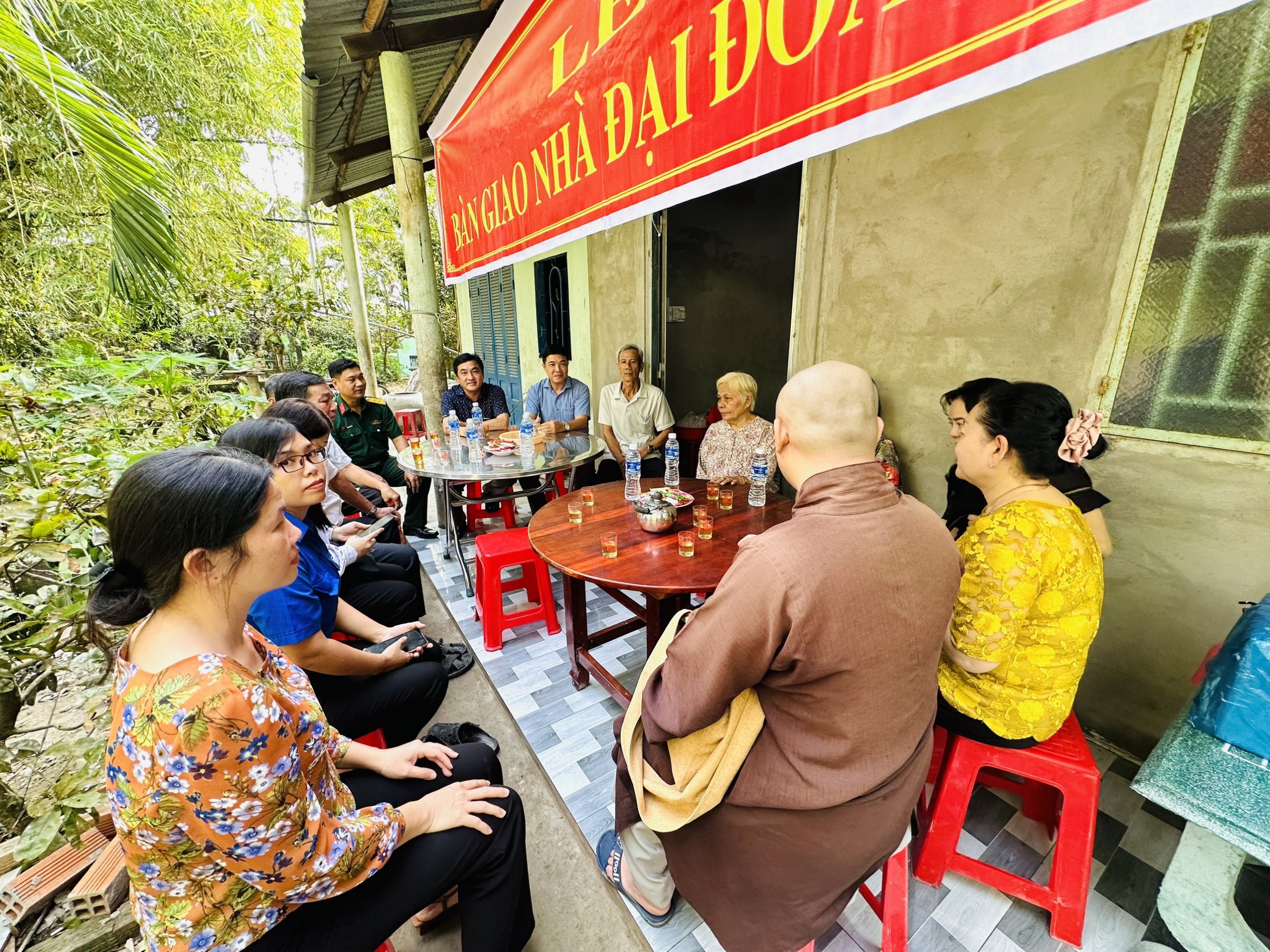 PSO – Sáng ngày 2/11/2022, ĐĐ. Thích Thiện Phước – Ủy viên BTS Phật giáo tỉnh, Phó Ban từ thiện xã hội Phật giáo tỉnh, Trụ trì chùa Long Phước đã kết hợp cùng chính quyền địa phương và nhà tài trợ tổ chức Lễ bàn giao nhà Đại đoàn kết cho gia đình cụ bà Trịnh Thị Thụa ngụ tại ấp Huệ Sanh, xã Long Đức, TP. Trà Vinh. Địa diện chính quyền có ông Nguyễn Bé Sáu – Bí thư Đảng ủy xã; ông Lê Quốc Nam – Chủ tịch UBND xã Long Đức cùng các cấp chính quyền địa phương sở tại Gia đình gia đình cụ bà Trịnh Thị Thụa thuộc diện hộ nghèo có hoàn cảnh khó khăn của xã, ước mơ có 1 căn nhà khang trang che mưa trú nắng với gia đình càng thêm khốn khó khi hàng ngày phải làm thuê làm mướn mưu sinh. Trước tình đó ĐĐ. Thích Thiện Phước đã vận động sự chung tay của quý mạnh thường quân gần xa hỗ trợ gia đình có một căn nhà khang trang khi mùa mưa đang đến gần. Phát biểu tại lễ bàn giao ĐĐ. Thích Thiện Phước đã gởi lời chúc mừng đến gia đình có được căn nhà mới, mong gia đình sẽ cố gắng lo làm ăn, bảo quản căn nhà thật tốt vì đây là tấm lòng của quý mạnh thường quân chia sẻ khó khăn với gia đình. Đồng thời Đại đức cũng gởi lời cảm ơn đến các cấp chính quyền địa phương đã tạo điều kiện thuận lợi để việc thi công đúng tiến độ bàn giao cho gia đình. Sau hơn thời gian thi công căn nhà đã hoàn thiện với chất liệu mái tol, tường gạch, kinh phí xây dựng là hơn 40 triệu đồng do ĐĐ. Thích Thiện Phước vận động và sự phát tâm hỗ trợ của gia đình Phật tử Lâm Thu Nguyệt (TP. Trà Vinh) cùng sự  chung tay của chính quyền địa phương các cấp. Thanh Minh