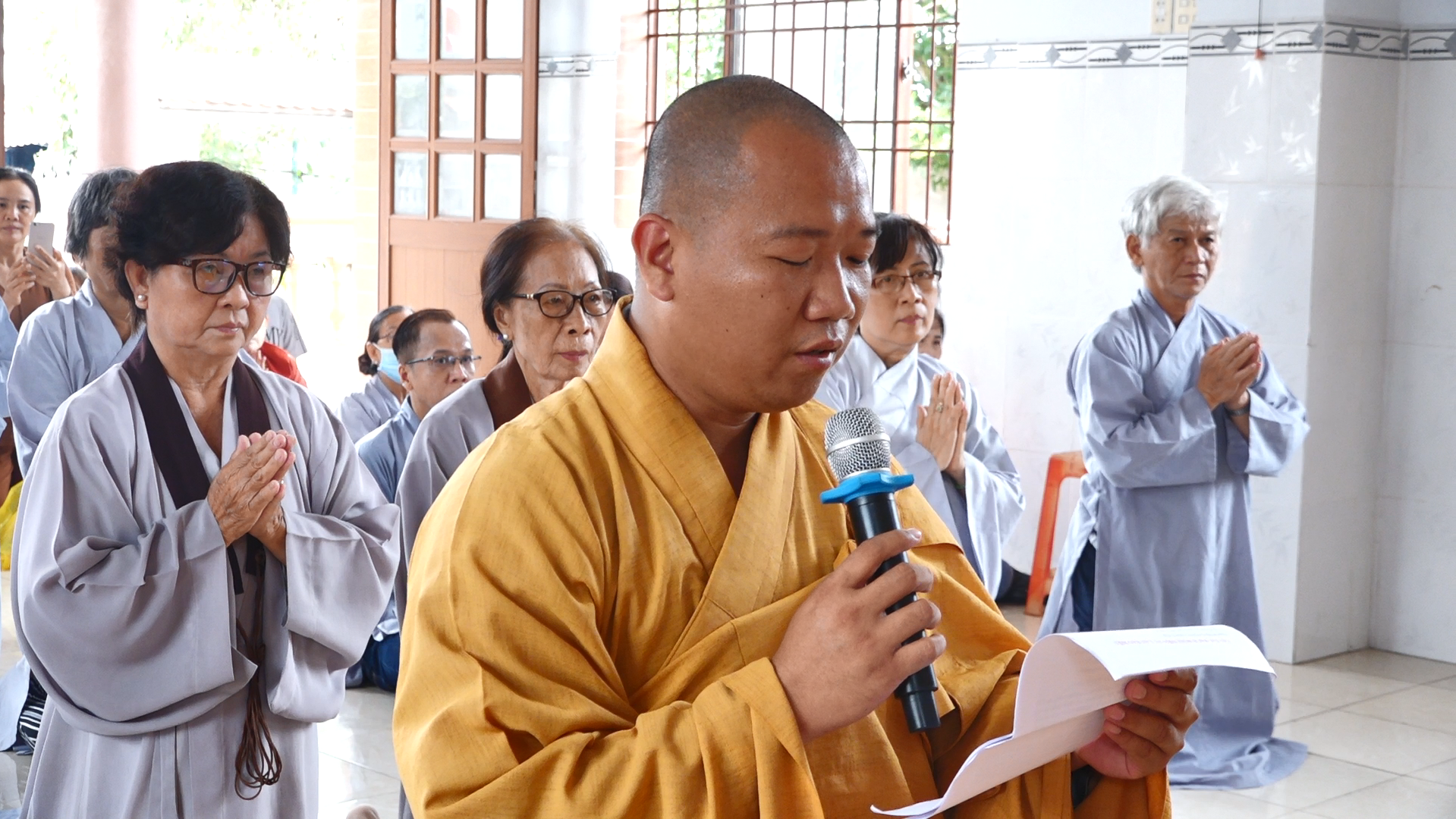 Trong giây phút lắng đọng thành kính, đại diện Phật tử đạo tràng chùa Phước Hòa ĐĐ. Thích Minh Trí – Phó thư ký kiêm Chánh Văn phòng BTS, Trưởng Ban Thông tin truyền thông GHPGVN tỉnh đã dâng lời cảm niệm ân cha, nghĩa mẹ nhân mùa Vu lan Báo hiếu và dâng lời tác bạch cúng dường lên chư tôn thiền đức chứng minh. Mừng chư Tôn thiền đức Tăng, Ni thêm hạ lạp, mãi là những vị thầy khả kính dẫn dắt hàng Phật tử trên bước đường tu nhân, học Phật.