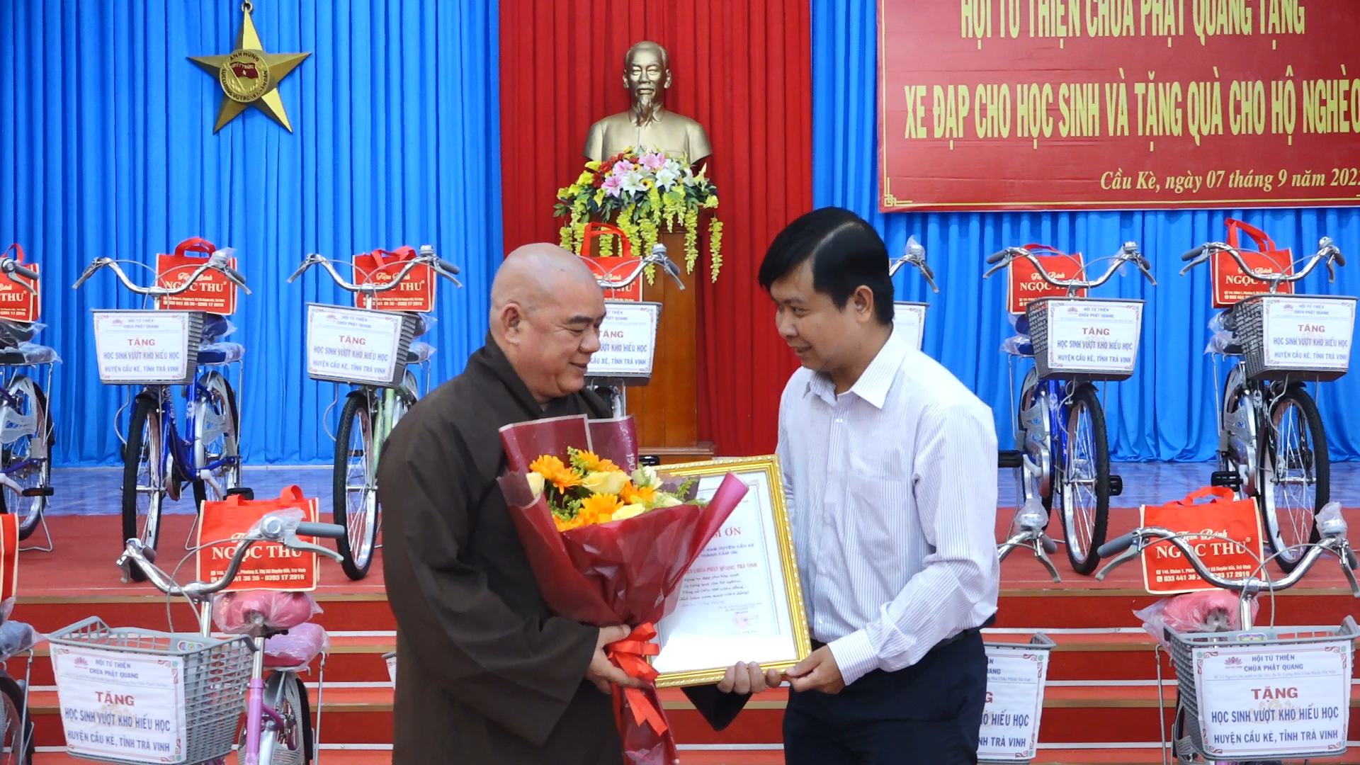 Thay mặt cho người dân nơi đây ông Thạch Buônl Nát đã có lời tri ân đến TT. Thích Trí Thọ cùng quý Phật tử đi chung đoàn. Ông cũng cho biết trên địa bàn huyện Cầu kè tỷ lệ hộ nghèo, cận nghèo còn cao vì vậy buổi trao tặng quà này có ý nghĩa rất với bà con nơi đây, đặc biệt là các em học sinh nghèo trên địa bàn, khi năm học mới đã bắt đầu. Những phần quà này sẽ là động lực để bà con nỗ lực vươn lên ổn định cuộc sống. Dịp này UBND huyện Cầu Kè cũng trao tặng giấy khen và thư cảm ơn đến TT. Thích Trí Thọ cùng quý Phật tử đi trong đoàn.