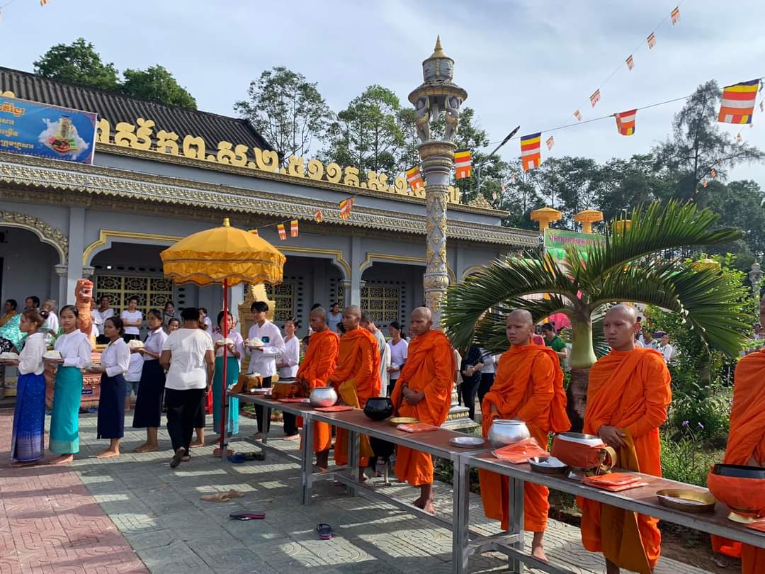 Trong ngày Phchum banh, mặc dù bận rộn với công việc nhưng tranh thủ lúc trời tờ mờ sáng bà con Phật tử cũng đem đến chùa đặt bát các vị chư Tăng, làm lễ cầu siêu hồi hướng phước báu và cầu nguyện cho cửu huyền thất tổ, ông bà cha mẹ đã quá vãng được sanh về cõi ăn vui, những người còn hiện tiền được bình an, hạnh phúc, vừa để thể hiện nét đẹp hiếu hạnh với tổ tiên.