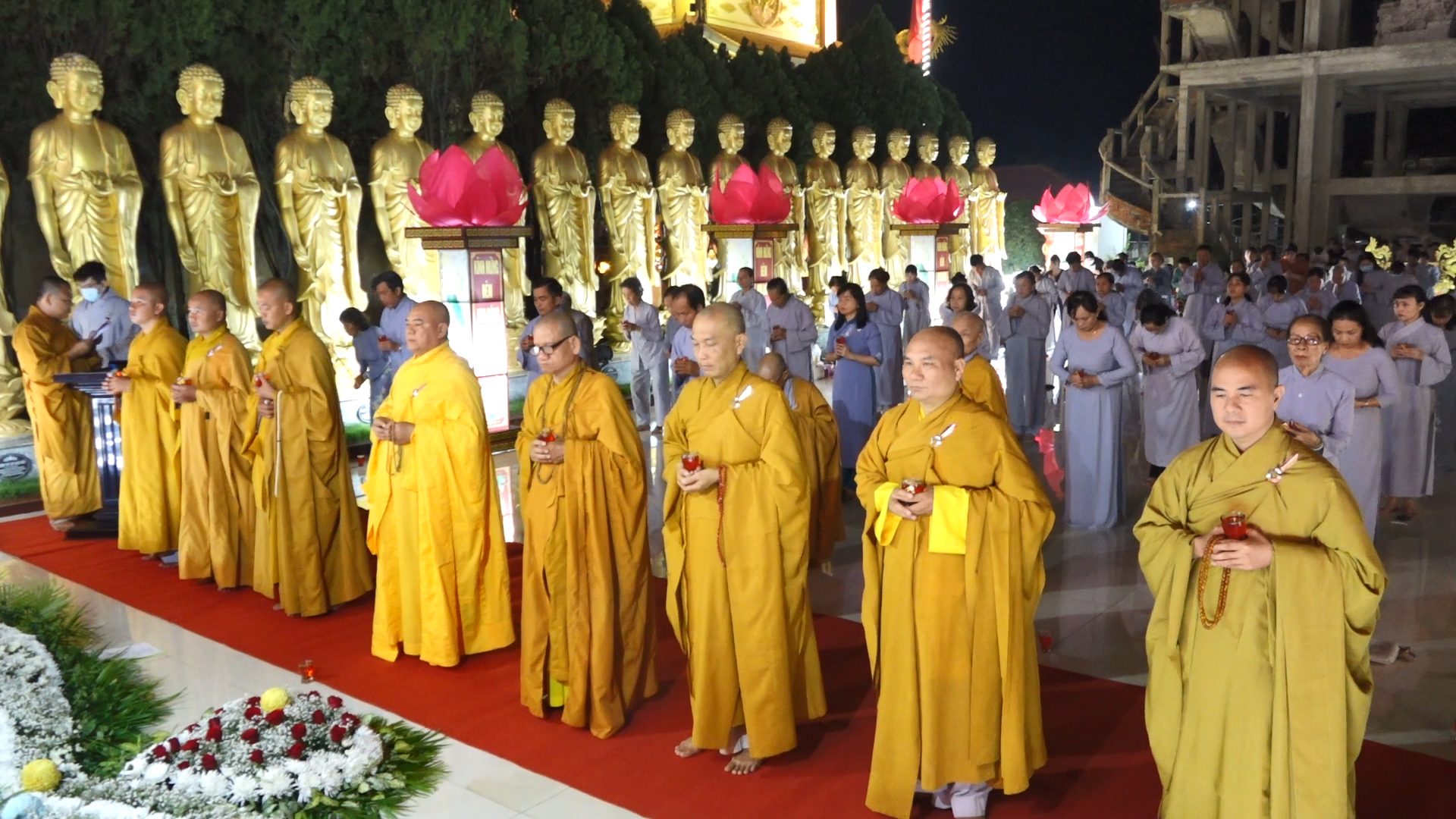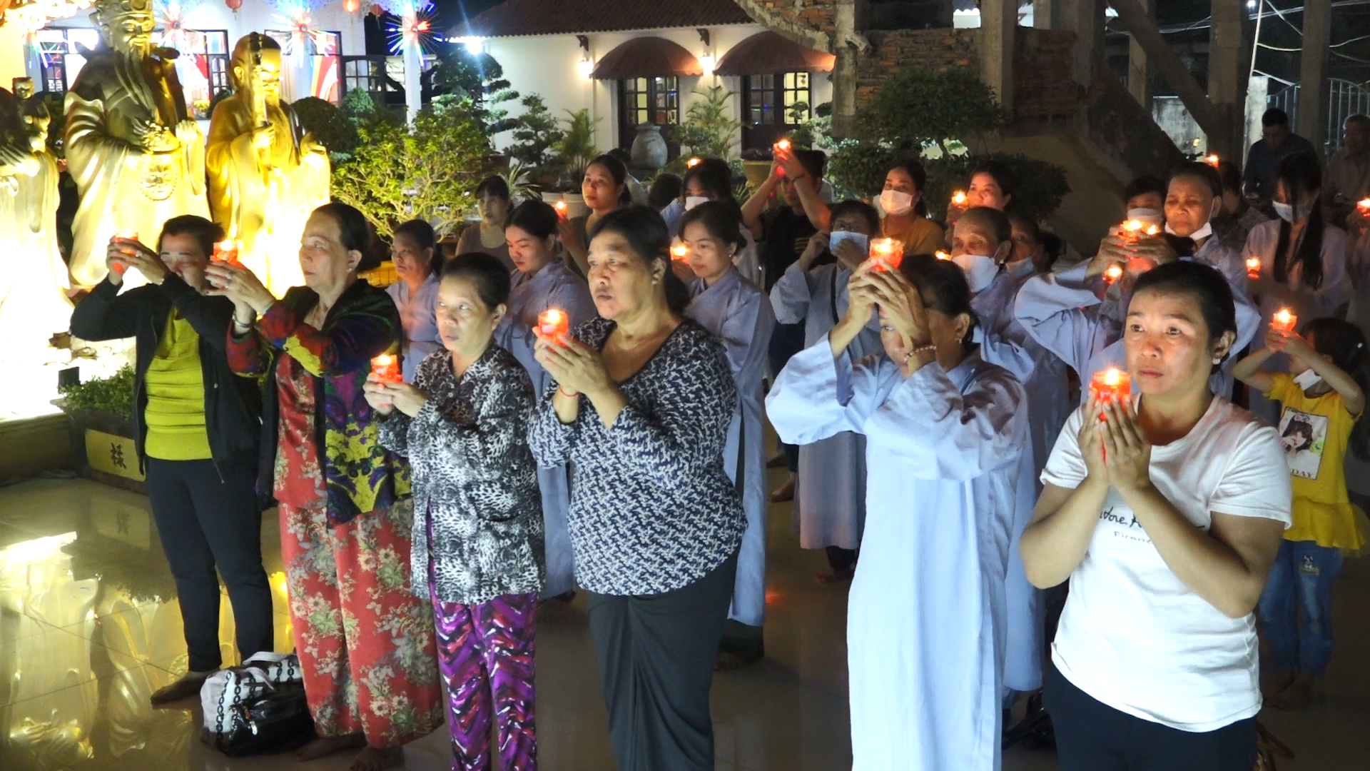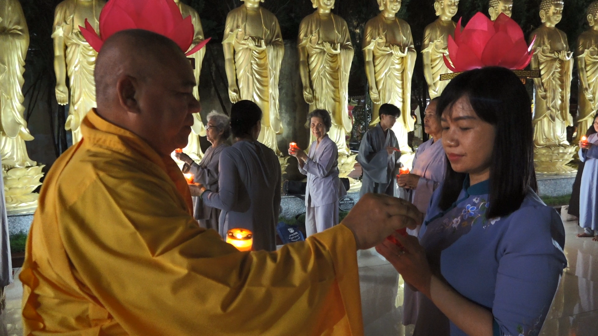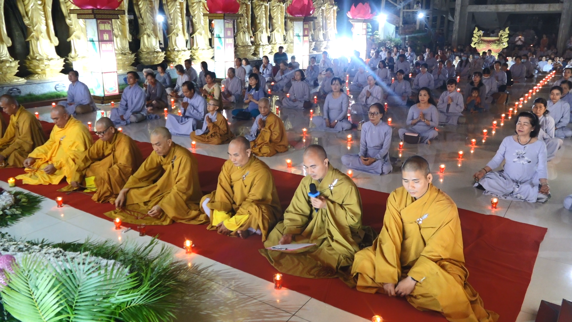 Tiếp đó, chư Tôn đức cùng toàn thể đạo tràng một lòng thành kính, chắp tay trang nghiêm, hướng tâm theo 48 lời phát nguyện của Đức Phật A Di Đà do ĐĐ. Thích Huệ Chiếu sướng đọc. Trong giây phút thiêng liêng ấy hàng trăm trái tim cùng chung nhịp đập niệm đọc danh hiệu A Di Đà Phật. Tiếng niệm phật hòa cùng ánh sáng từ những ngọn nến lung linh như xua tan màn đêm u tối của si mê, giận hờn ganh ghét, xóa đi ranh giới của giàu và nghèo, vui và khổ, mở bày thế giới cực lạc giữa cõi ta bà, thắp sáng niềm tin và hi vọng.