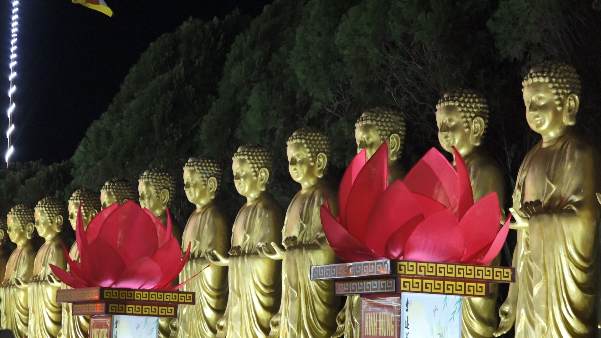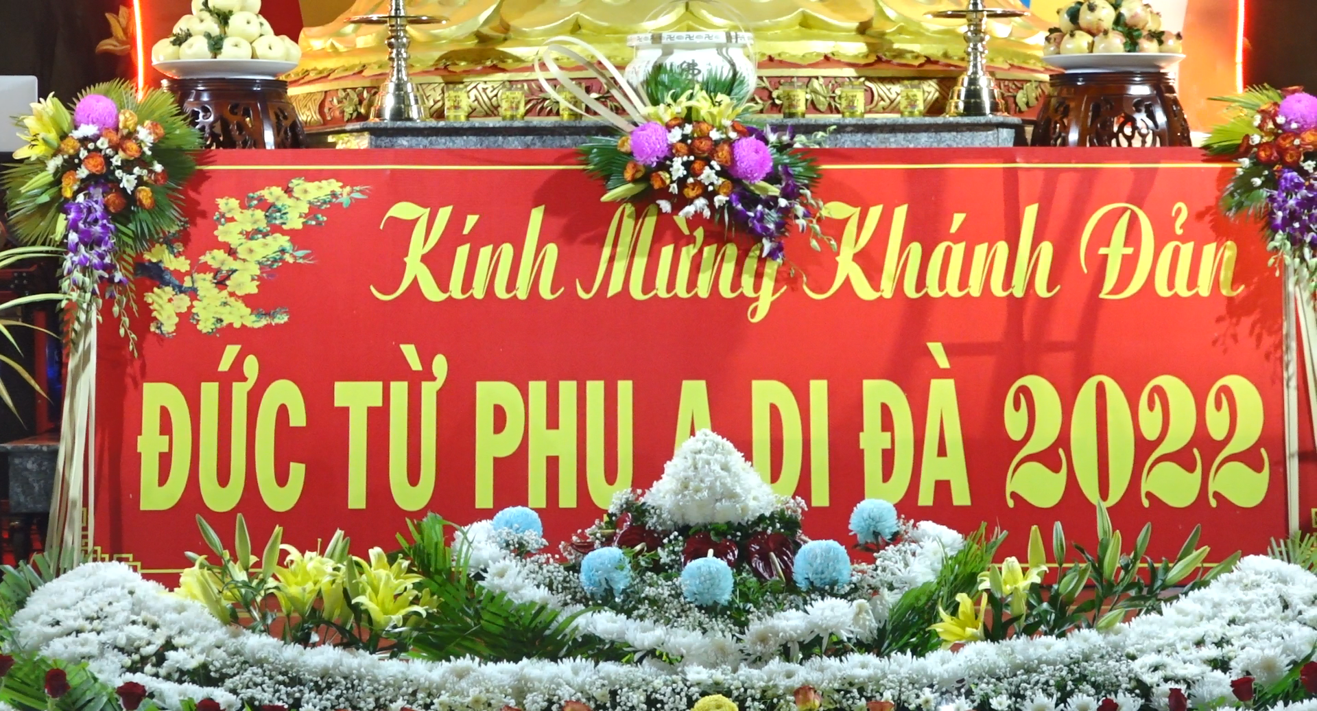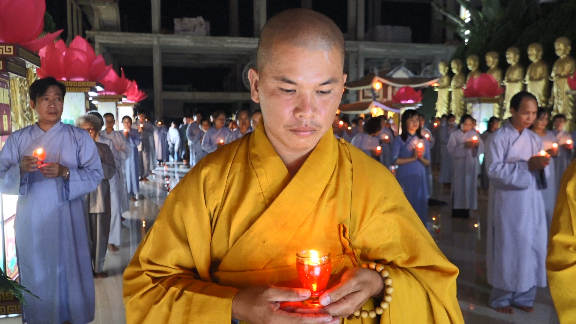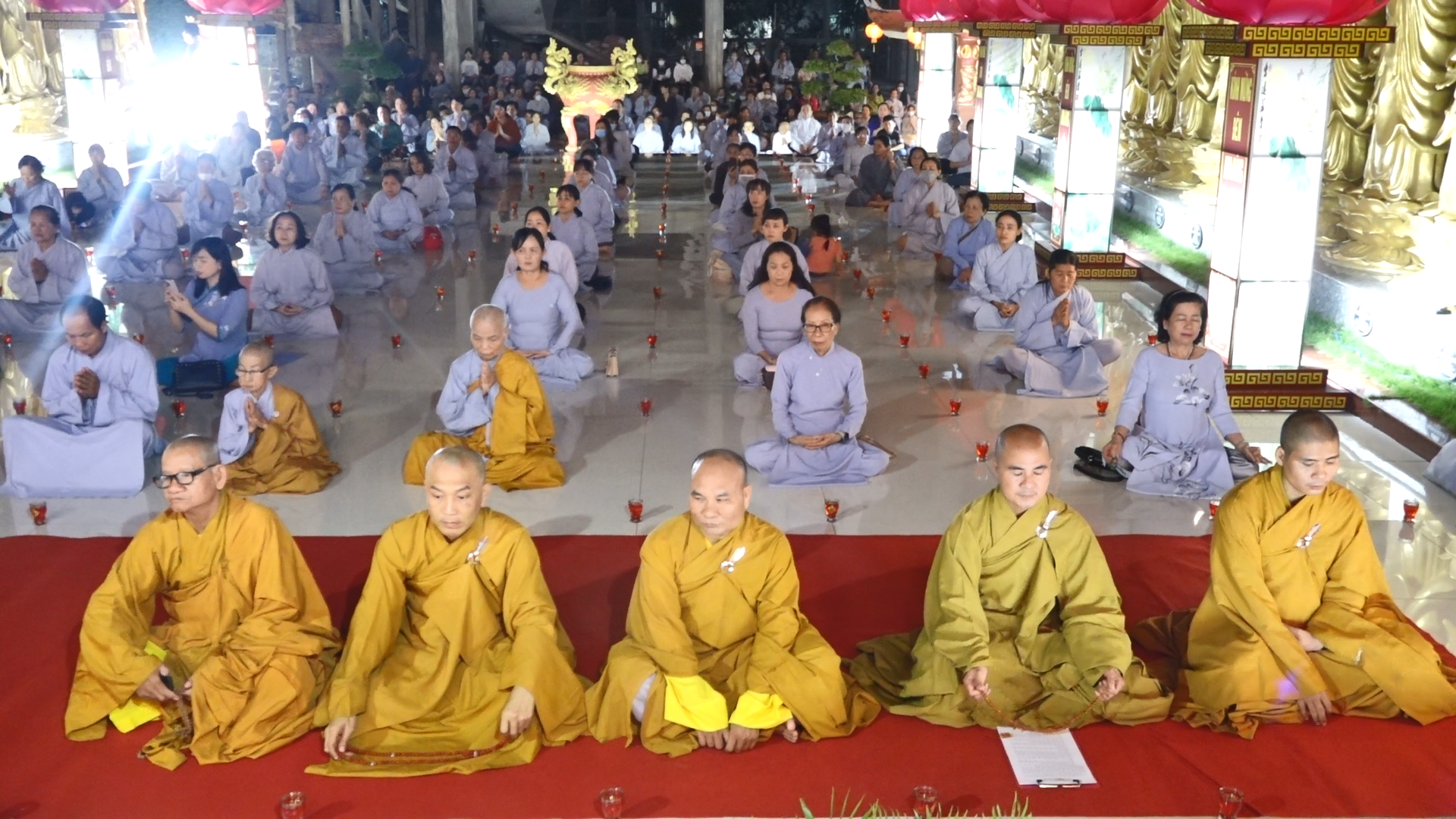 Tiếp đó, chư Tôn đức cùng toàn thể đạo tràng một lòng thành kính, chắp tay trang nghiêm, hướng tâm theo 48 lời phát nguyện của Đức Phật A Di Đà do ĐĐ. Thích Huệ Chiếu sướng đọc. Trong giây phút thiêng liêng ấy hàng trăm trái tim cùng chung nhịp đập niệm đọc danh hiệu A Di Đà Phật. Tiếng niệm phật hòa cùng ánh sáng từ những ngọn nến lung linh như xua tan màn đêm u tối của si mê, giận hờn ganh ghét, xóa đi ranh giới của giàu và nghèo, vui và khổ, mở bày thế giới cực lạc giữa cõi ta bà, thắp sáng niềm tin và hi vọng.