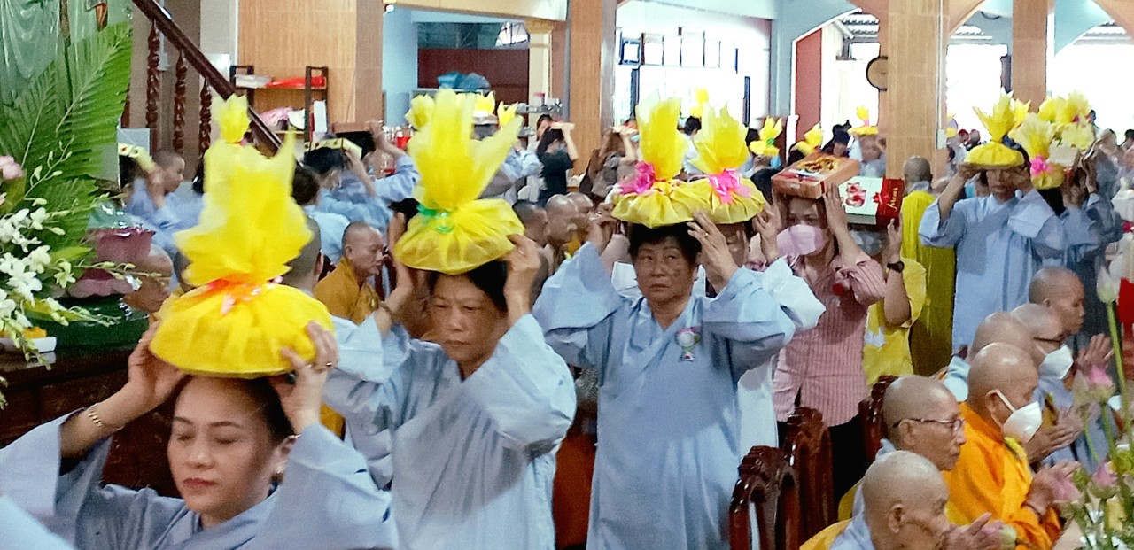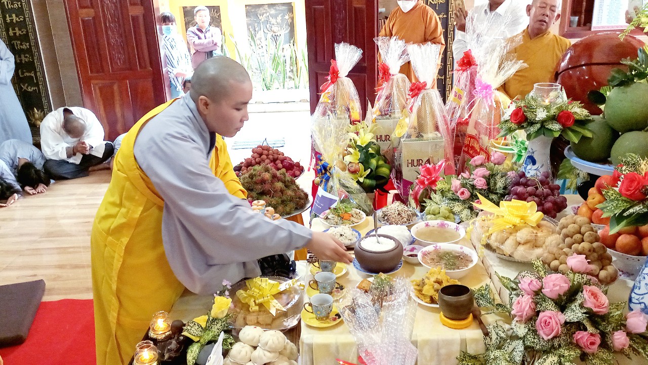 Sau khi Đạo tràng trang nghiêm thanh tịnh, môn đồ tứ chúng cung kính bái thỉnh chư Tôn đức quang lâm Đại Hùng Bảo điện, niêm hương bạch Phật và tiến hành nghi thức truyền thống cúng ngọ và cung tiến đảnh lễ Giác Linh cố Ni trưởng, chư Tôn giáo phẩm đã thành kính dâng nén tâm hương cúng dường Giác linh Ni Trưởng nhất tâm cầu nguyện Giác linh ngài được cao đăng thượng phẩm, quả chứng vô sanh, tái hiện ta bà nhiếp tăng độ chúng.