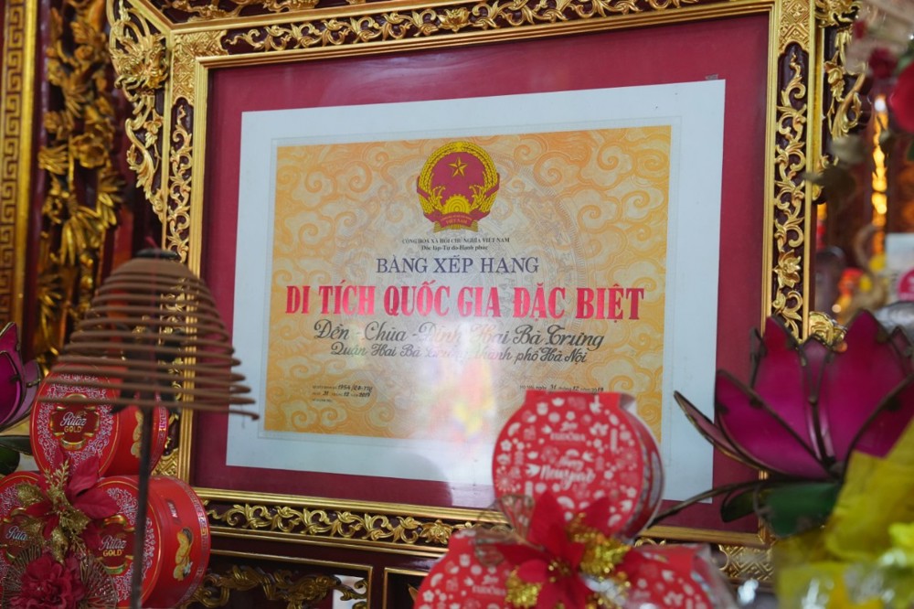 Trong đó, quần thể Đền – Chùa – Đình Hai Bà Trưng là một quần thể di tích đặc sắc hiếm có tại trung tâm Thủ đô, mà nổi bật là đền Hai Bà Trưng với kiến trúc “nội công ngoại quốc”. Trong đền hiện lưu giữ nhiều di vật quý, như: 27 đạo sắc phong của triều Lê và triều Nguyễn, tám pho tượng thờ, hai tấm bia đá cổ ghi sự tích Hai Bà Trưng, hai bộ kiệu thời Nguyễn. Với những ý nghĩa và giá trị về lịch sử, năm 2019, Di tích Đền – Chùa – Đình Hai Bà Trưng đã vinh dự được Thủ tướng Chính phủ xếp hạng di tích quốc gia đặc biệt.
