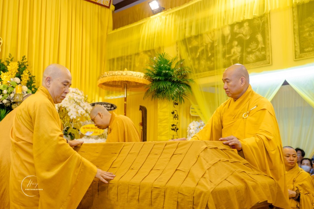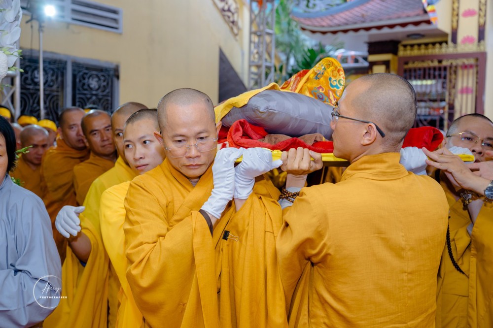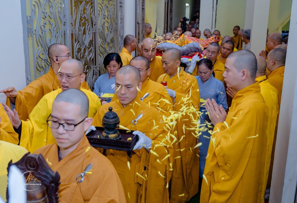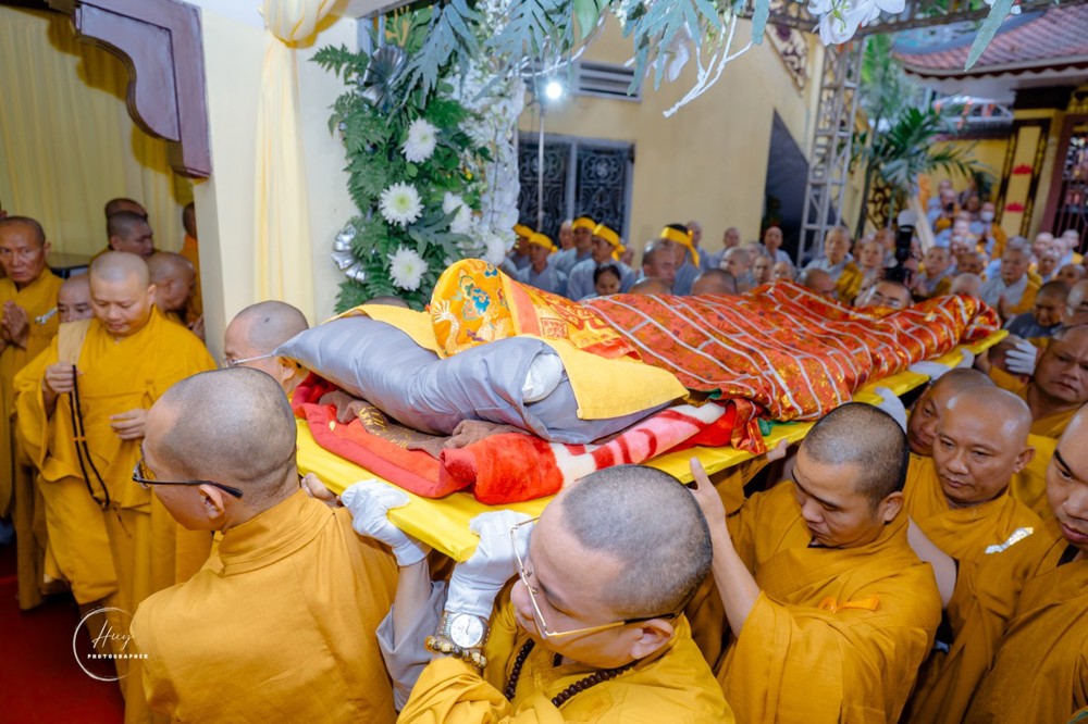 Trong tiếng chuông trống Bát Nhã trang nghiêm, môn đồ pháp quyến cung thỉnh nhục thân Trưởng lão Hòa thượng rời phương trượng, quang lâm Giác linh đường để thực hiện nghi thức nhập kim quan.