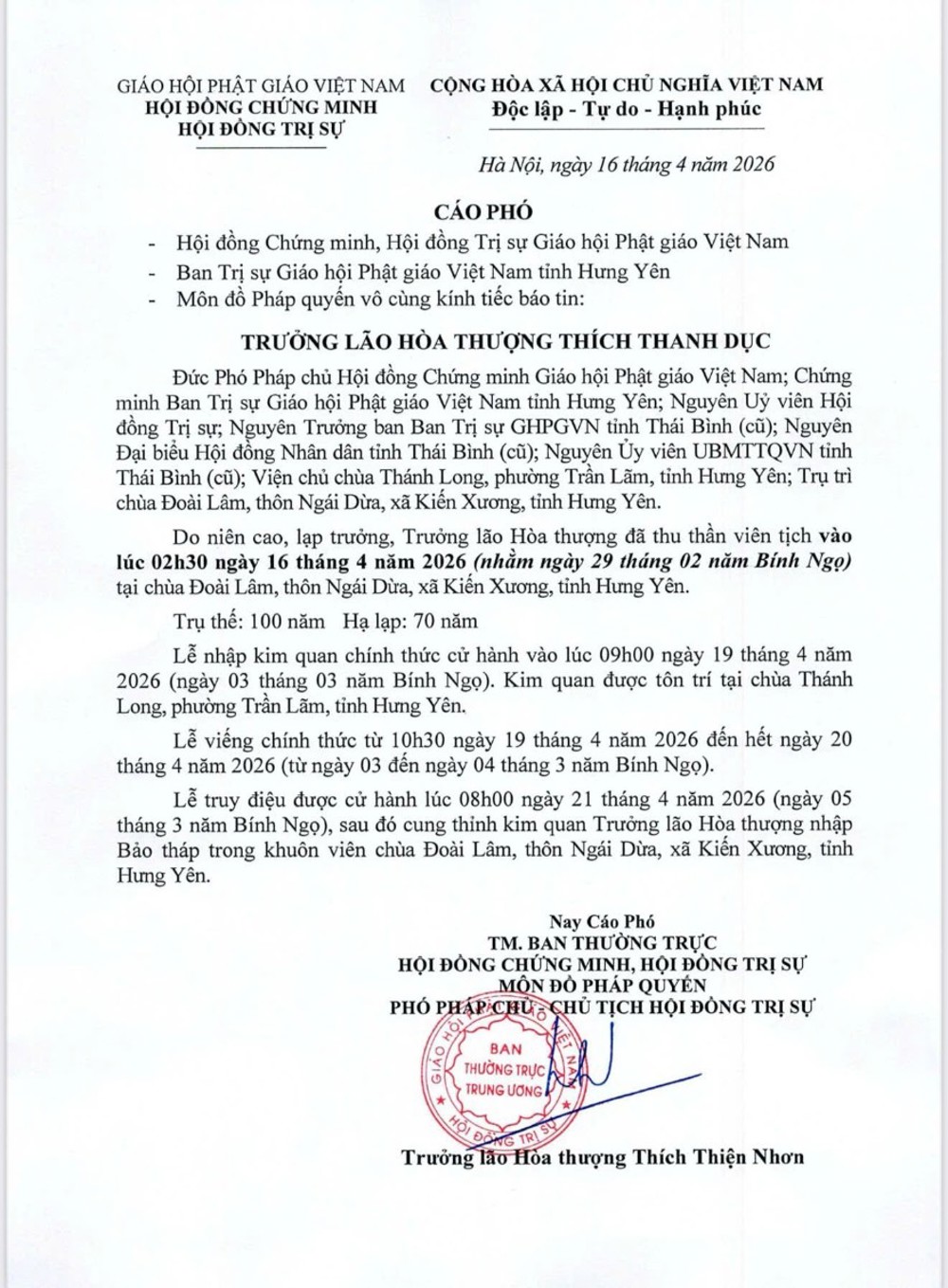 PSO - Trưởng lão Hòa thượng Thích Thiện Nhơn, Phó Pháp chủ Hội đồng Chứng minh, Chủ tịch Hội đồng Trị sự GHPGVN đã ấn ký cáo phó về sự viên tịch của Trưởng lão Hòa thượng Thích Thanh Dục, Chứng minh Ban Trị sự GHPGVN tỉnh Hưng Yên.