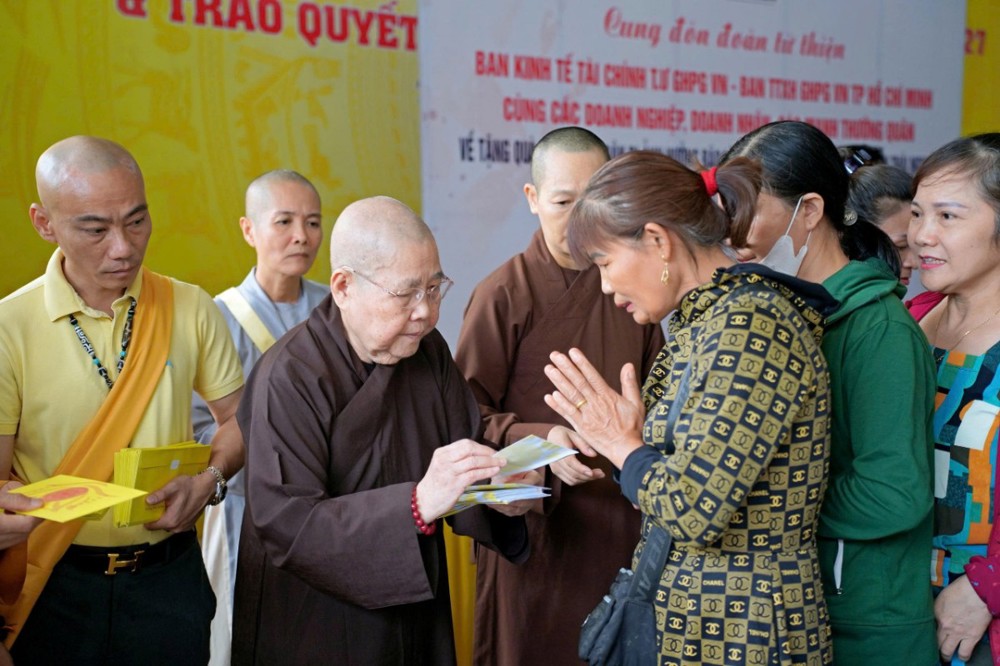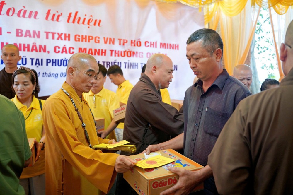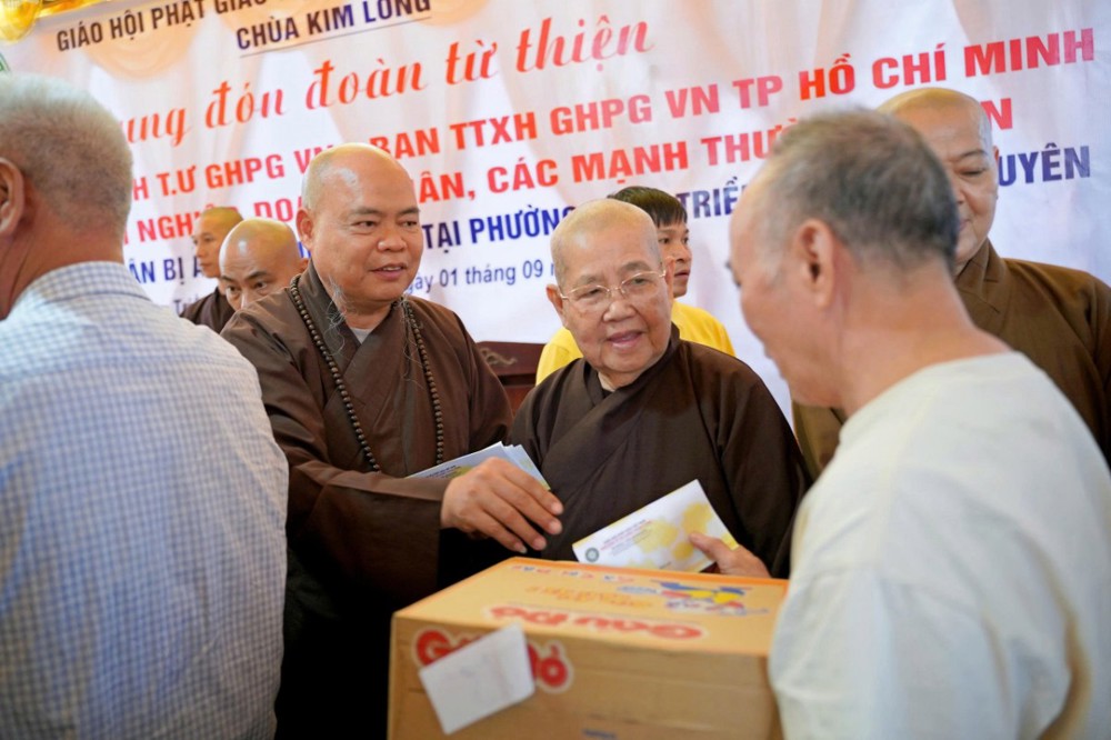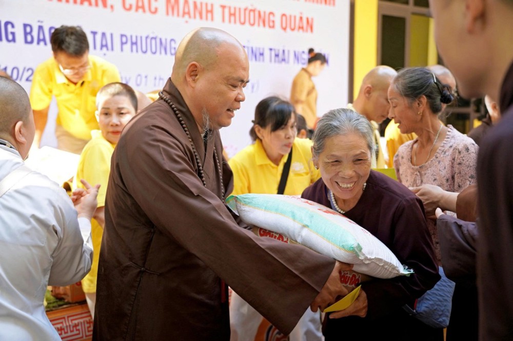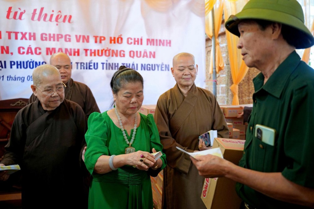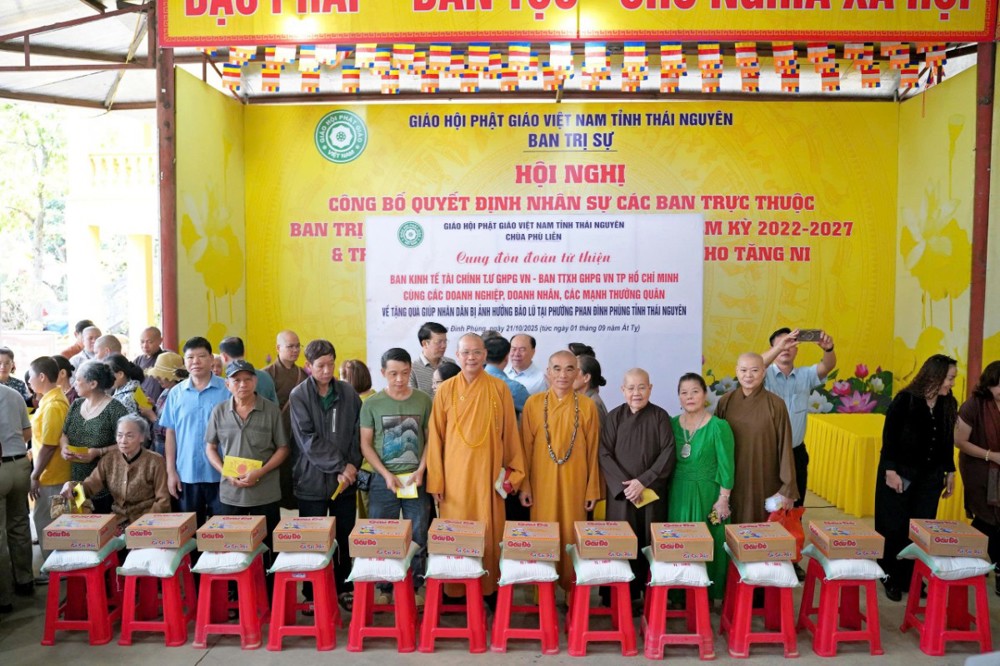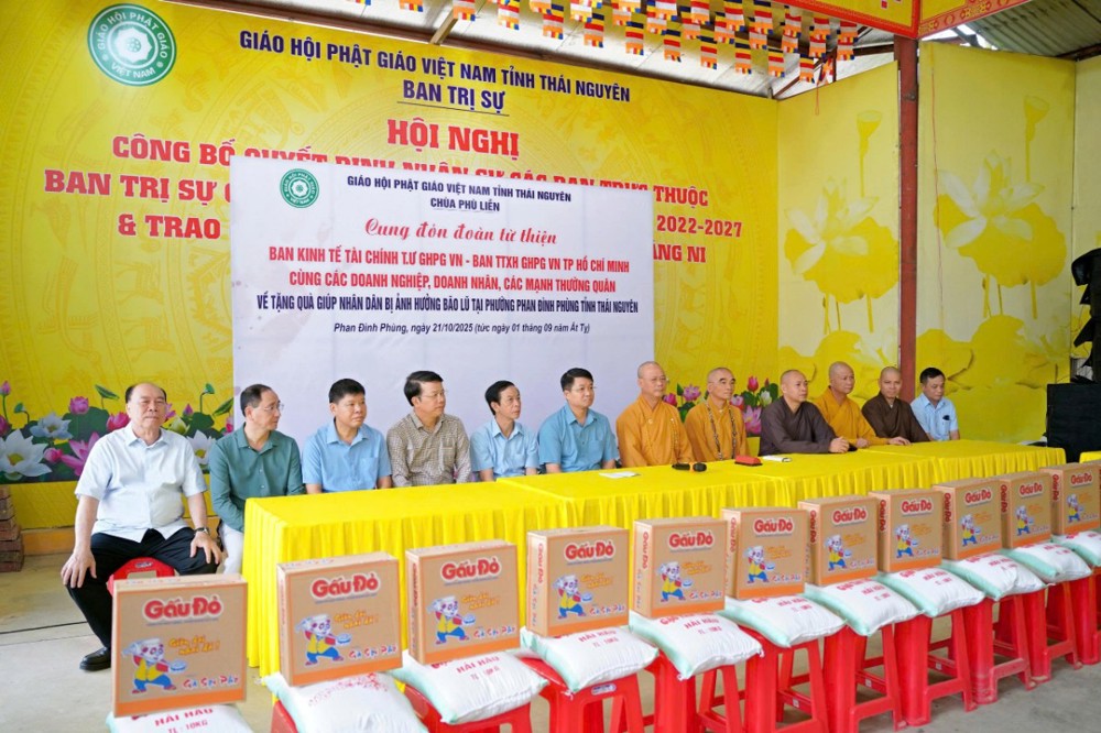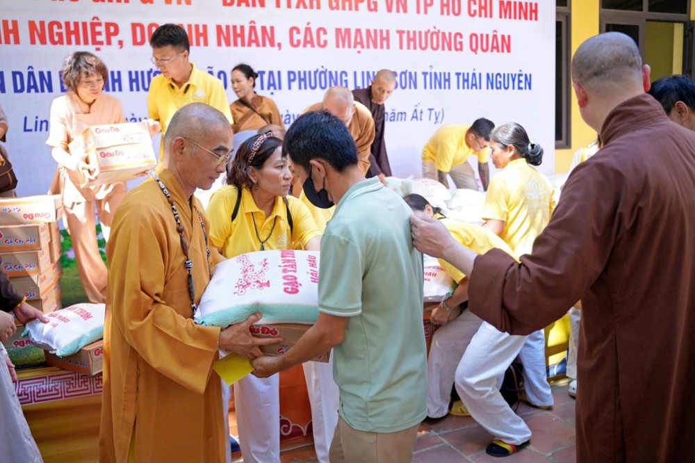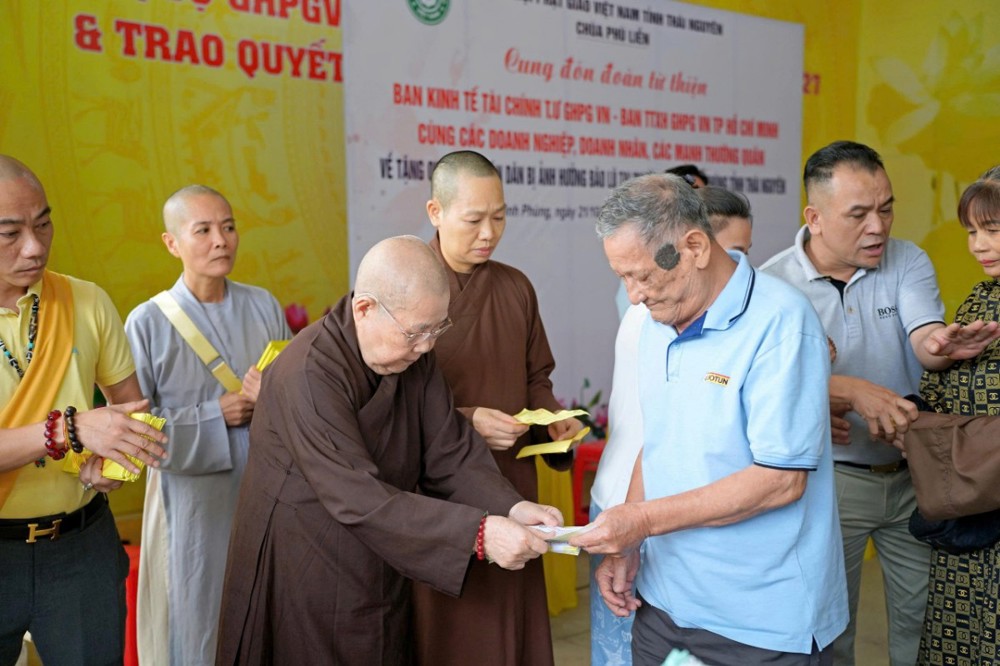 Phái đoàn đã đến các điểm: chùa Phù Liễn (P. Phan Đình Phùng), chùa Kim Sơn (P. Gia Sàng), chùa Kim Long (P. Quang Triều) và chùa Linh Sơn (P. Linh Sơn) để trao tặng 1.000 phần quà cho các hộ dân chịu ảnh hưởng nặng nề của hai cơn bão số 10 và 11 vừa qua. Mỗi phần quà gồm gạo, mì gói và 1.000.000 đồng tiền mặt; riêng bà con tại chùa Kim Sơn được tặng thêm một thùng nước giặt.