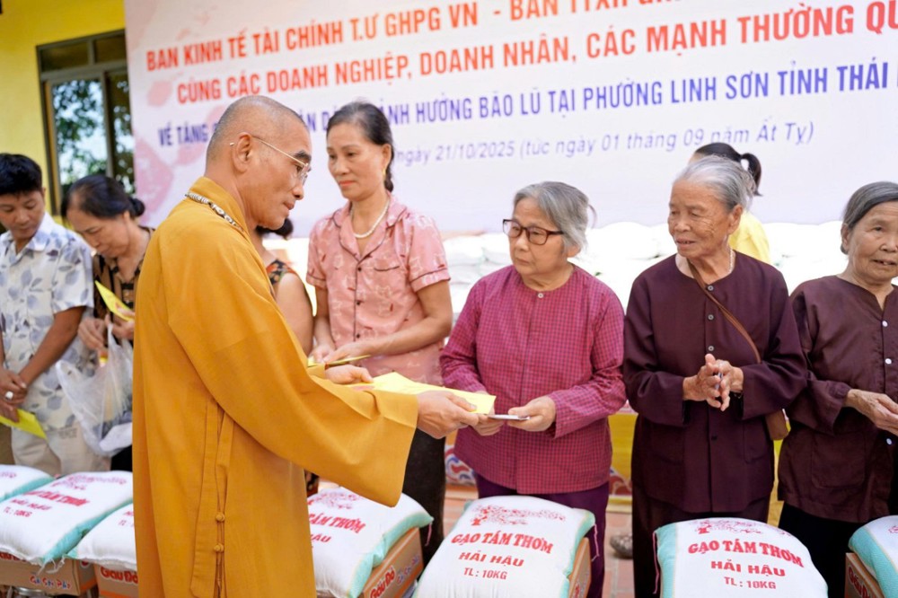PSO - Sáng ngày 21/10/2025 (nhằm ngày 01/9 năm Giáp Thìn), phái đoàn Ban Kinh tế - Tài chính Trung ương GHPGVN do Thượng tọa Thích Thanh Phong – Phó Chủ tịch Hội đồng Trị sự, Trưởng ban Kinh tế - Tài chính Trung ương làm Trưởng đoàn đã đến thăm và trao quà cứu trợ cho các hộ gia đình bị ảnh hưởng bởi cơn bão số 11 tại tỉnh Thái Nguyên.