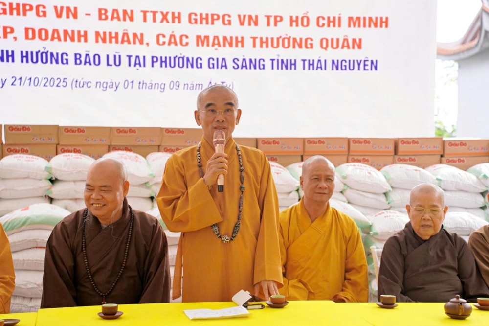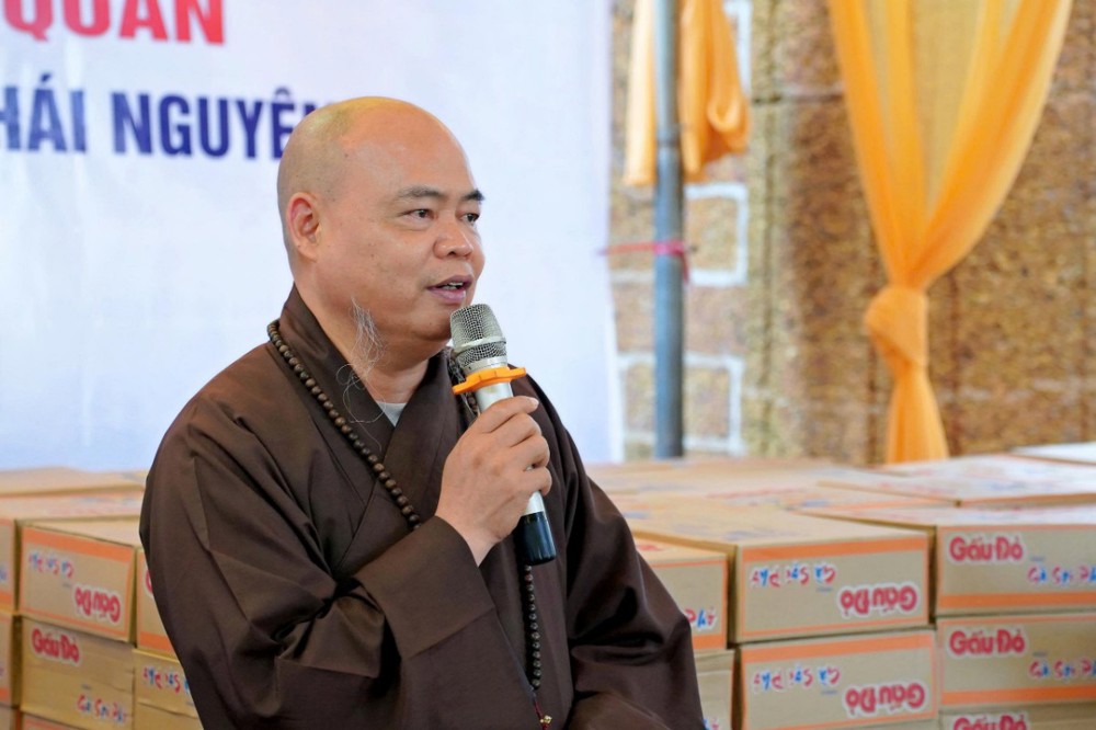 Phát biểu tại buổi trao quà, TT. Thích Nguyên Thành bày tỏ lòng tri ân sâu sắc đến Đức Pháp chủ và Hòa thượng Chủ tịch HĐTS đã quan tâm chỉ đạo kịp thời. Thượng tọa chia sẻ: “Được sự chỉ đạo của Ban Thường trực HĐTS, Phật giáo tỉnh Thái Nguyên đã vận động Tăng Ni, Phật tử trong tỉnh cùng nhau nấu những phần thực phẩm thiết yếu để gửi đến bà con, góp phần giúp đỡ trong giai đoạn khó khăn nhất.”
