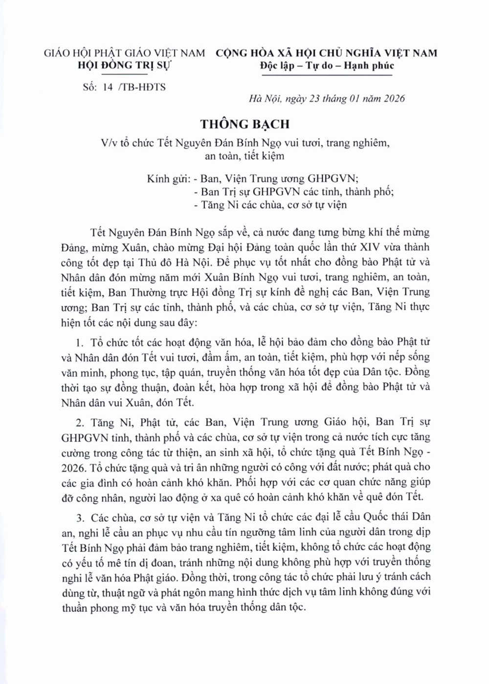 Thông bạch do Trưởng lão Hòa thượng Thích Thiện Nhơn, Phó Pháp chủ Hội đồng Chứng minh, Chủ tịch Hội đồng Trị sự GHPGVN ký ban hành, thể hiện sự quan tâm sâu sắc của Giáo hội đối với đời sống tinh thần của Tăng Ni, Phật tử và Nhân dân, hướng đến một mùa Xuân Bính Ngọ 2026 an lành, ý nghĩa và trọn vẹn.