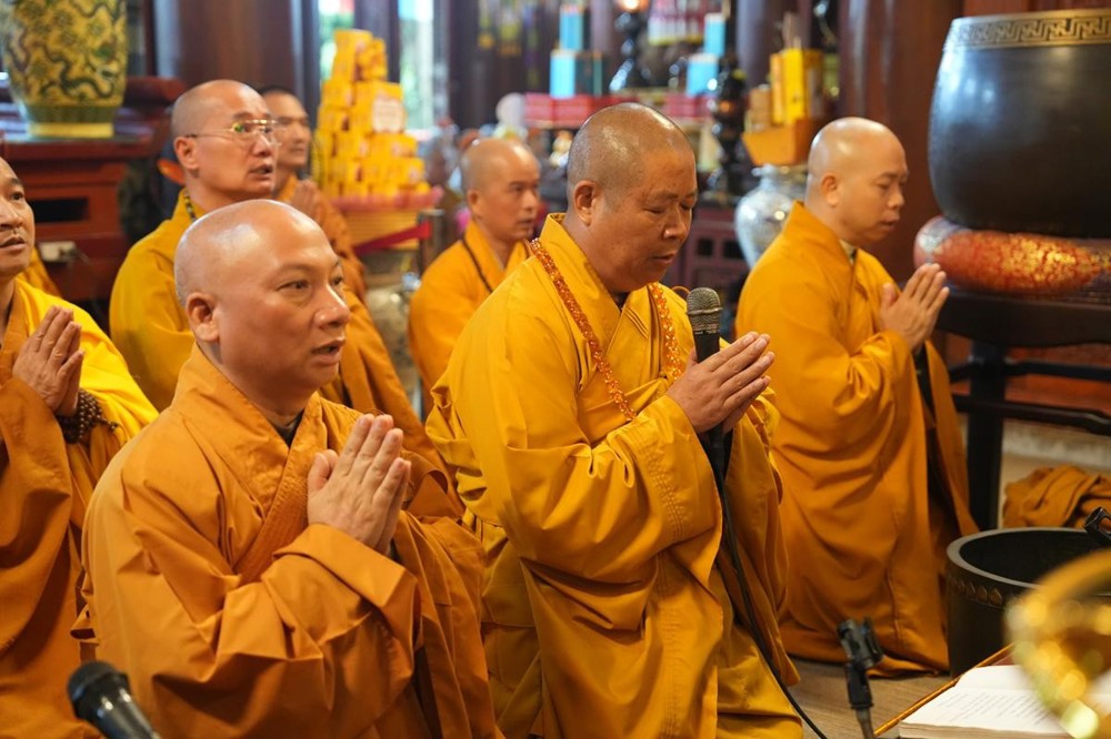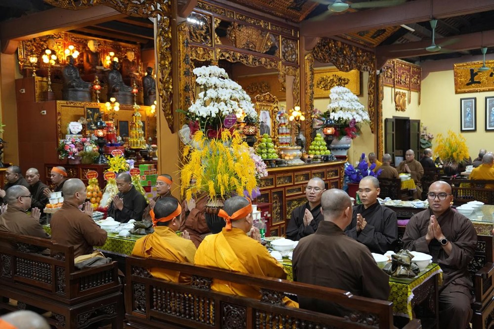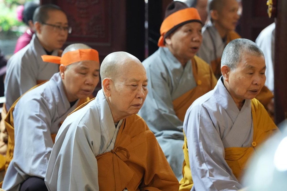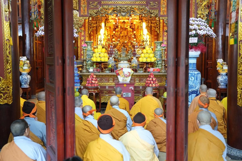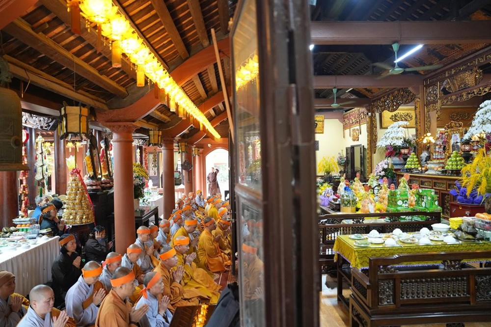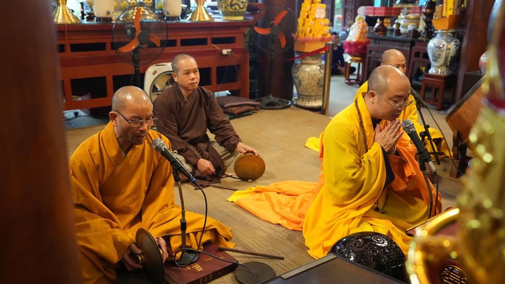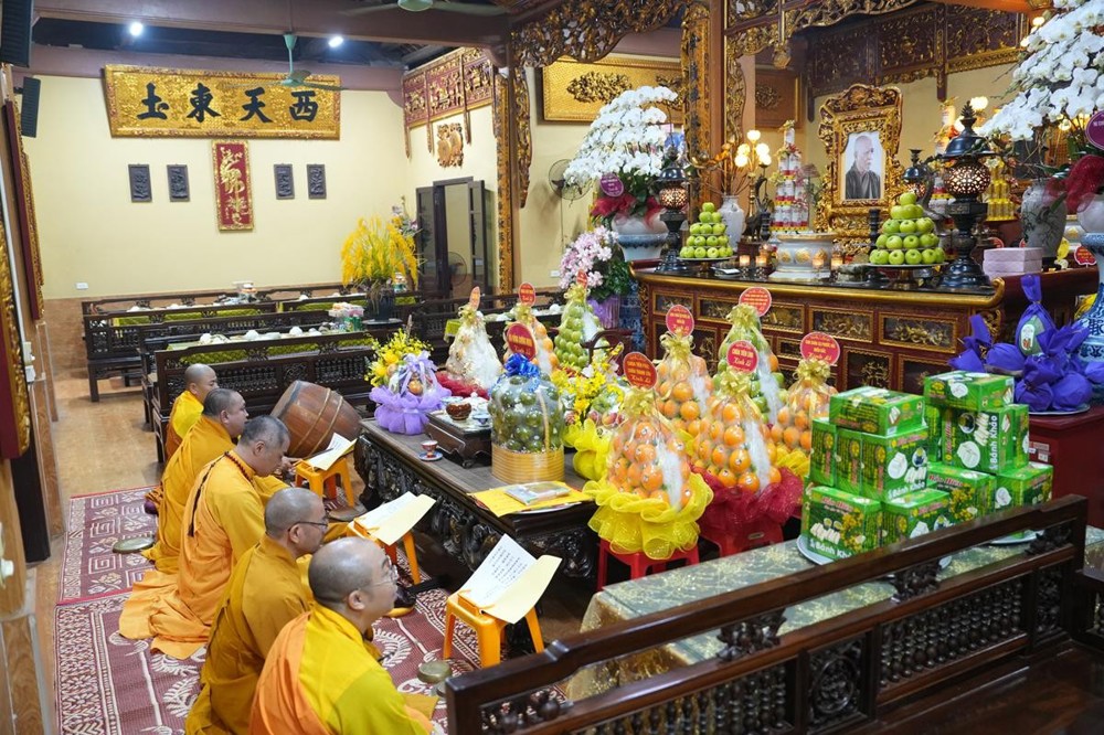 Sau nghi thức cúng Phật, cúng Tổ, chư Tôn đức cùng toàn thể Phật tử trang nghiêm trì tụng Kinh A Di Đà, gửi gắm lòng chí thành cầu nguyện bậc Thạc đức Tùng lâm sớm tiêu diêu nơi cảnh giới an lành của chư Phật.