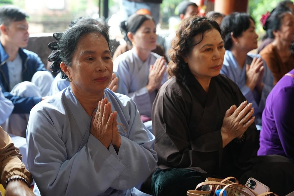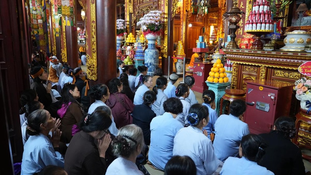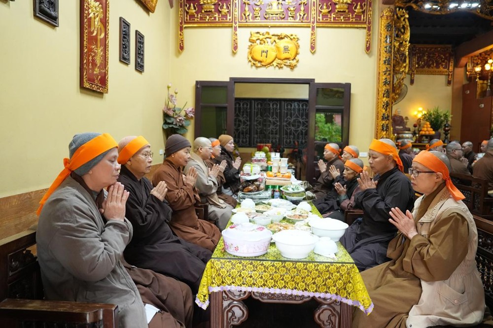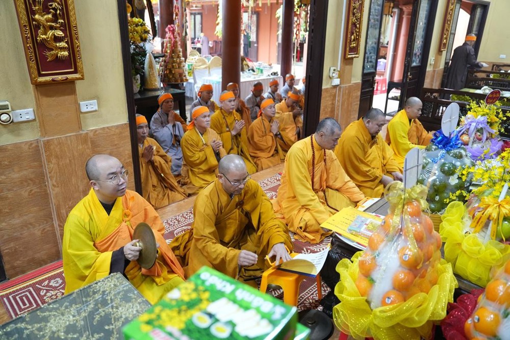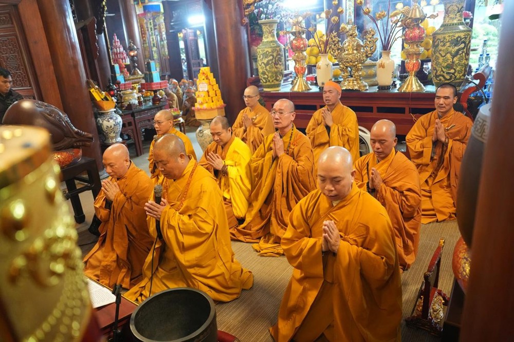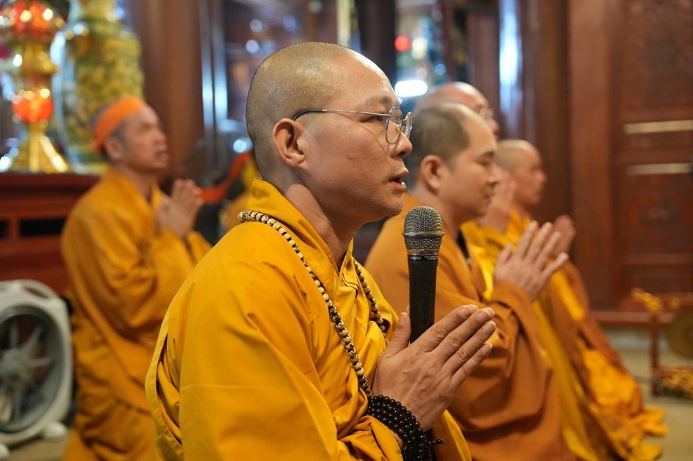 Sau nghi thức cúng Phật, cúng Tổ, chư Tôn đức cùng toàn thể Phật tử trang nghiêm trì tụng Kinh A Di Đà, gửi gắm lòng chí thành cầu nguyện bậc Thạc đức Tùng lâm sớm tiêu diêu nơi cảnh giới an lành của chư Phật.